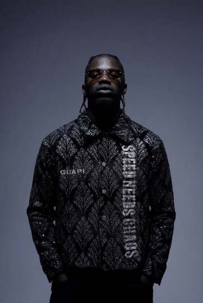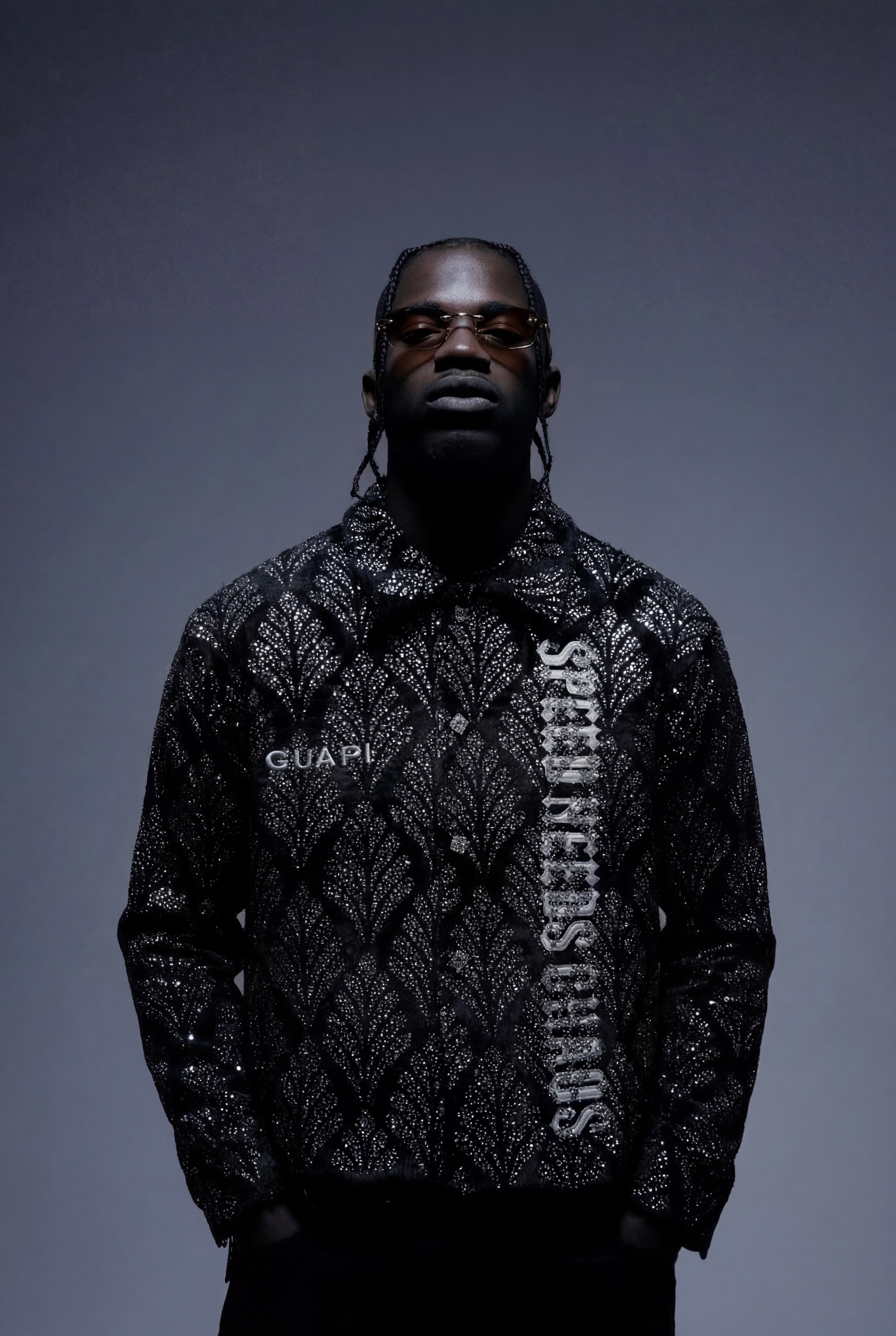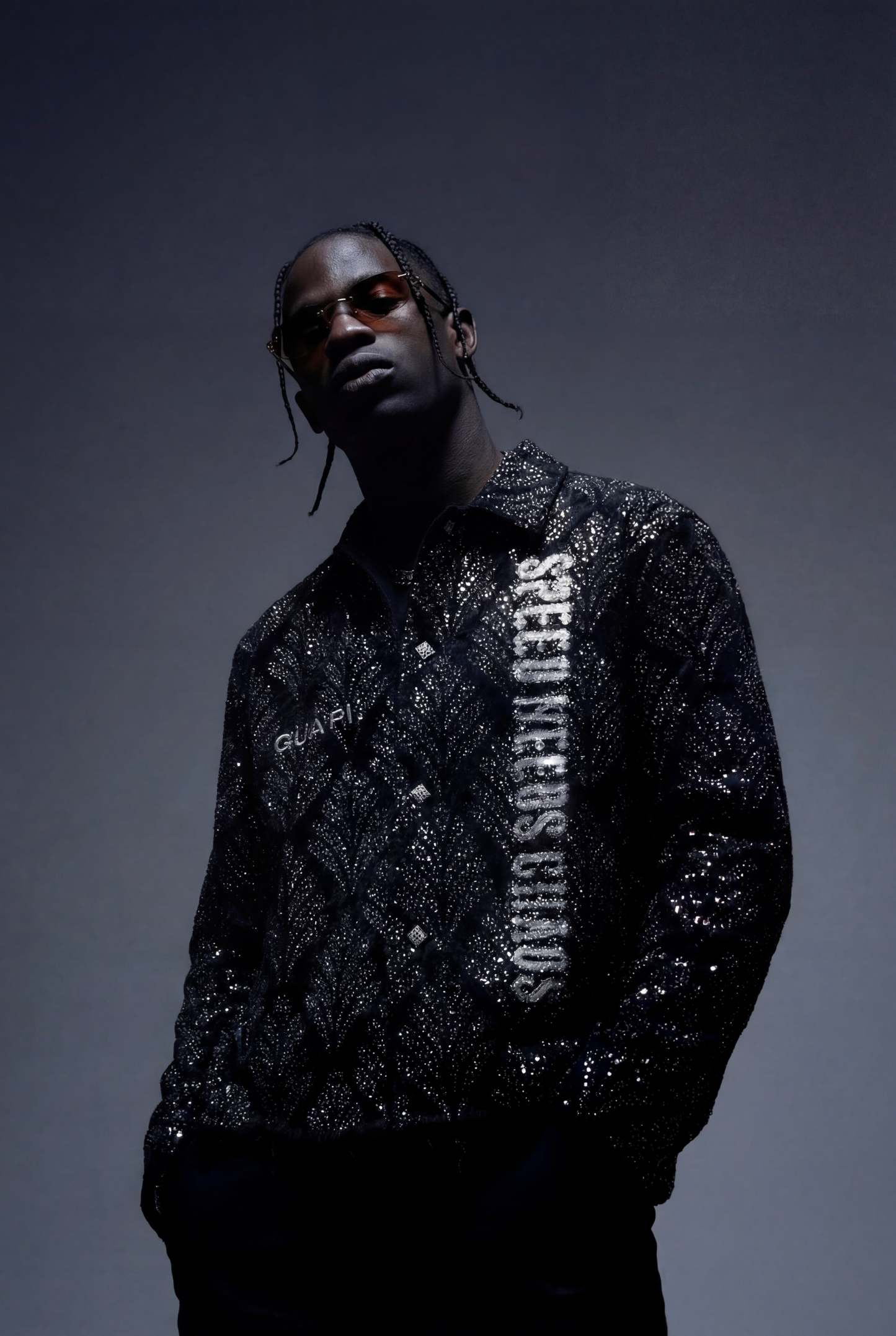 On the front, a bold vertical graphic reads “SPEED NEEDS CHAOS”, cutting through the pattern with raw attitude, while a contrasting GUAPI mark sits on the chest. The back is dominated by a large, cross-shaped emblem, rendered in textured light ink over the embellished surface, giving the piece an almost armor-like presence.