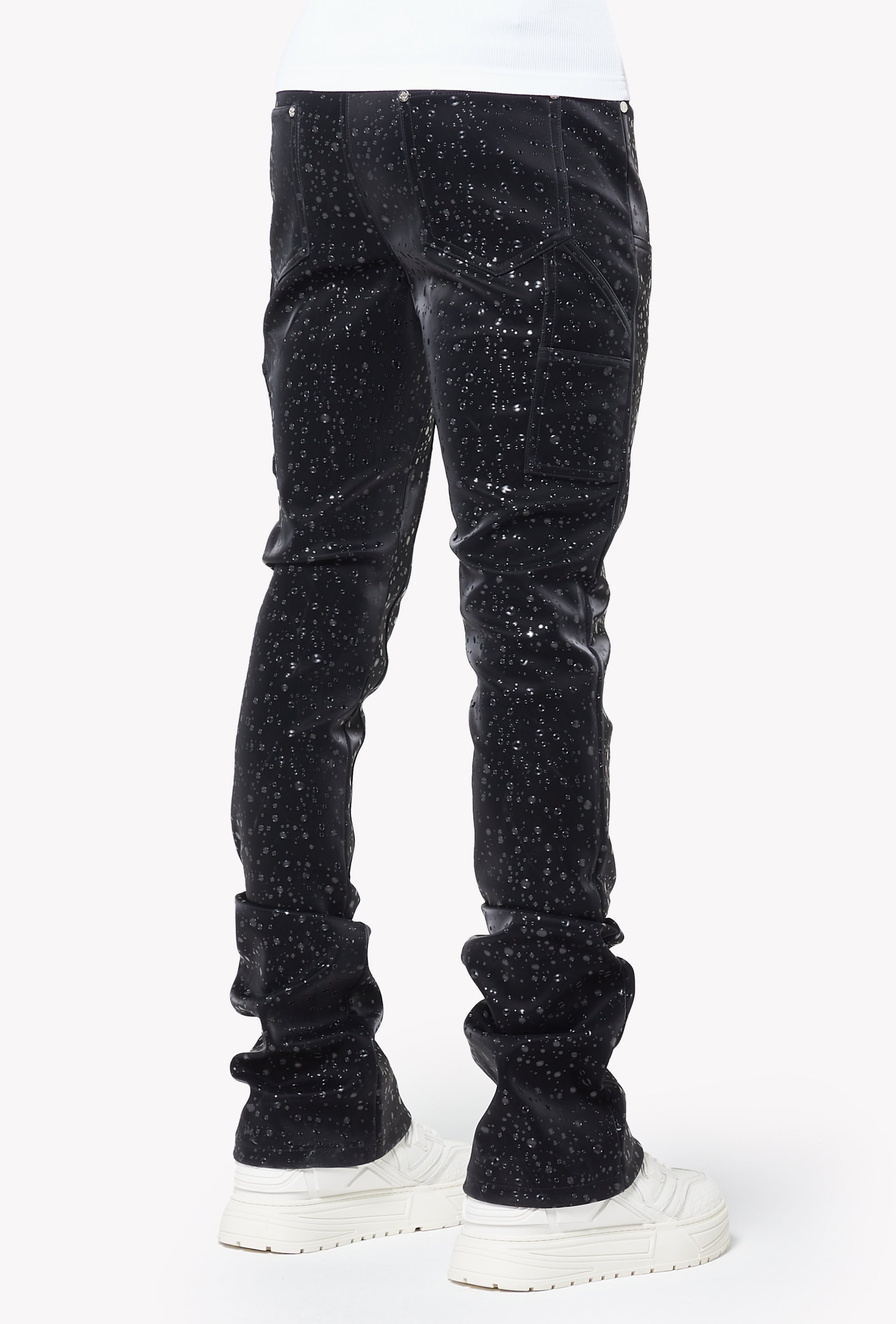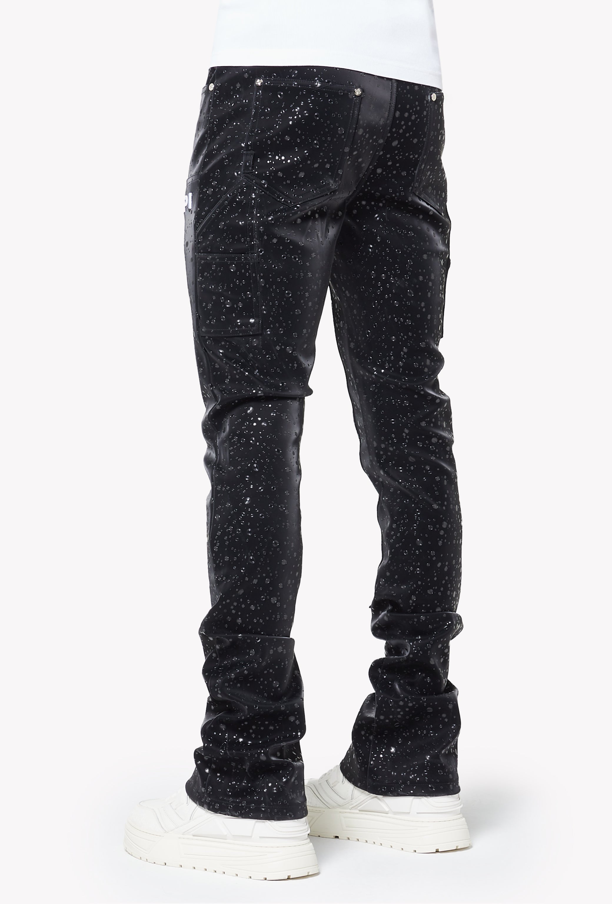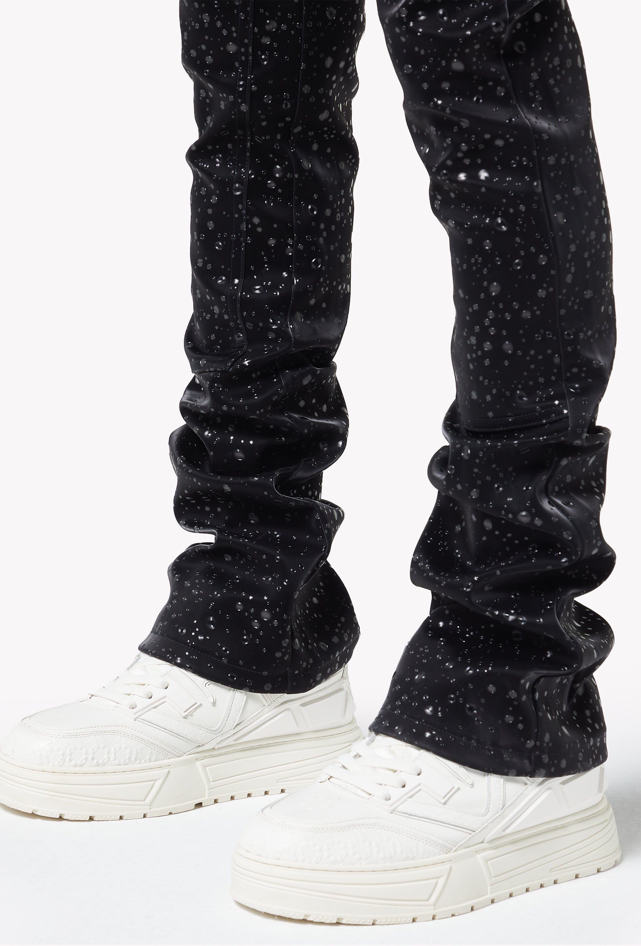 The Obsidian Black Raindrop Leather Pant blends high-fashion edge with a futuristic wet-look effect. Crafted from premium faux leather, the pant features a striking 3D raindrop print that mimics the look of water droplets on a jet-black surface. The glossy finish catches light from every angle, creating depth, movement, and a dramatic visual texture.