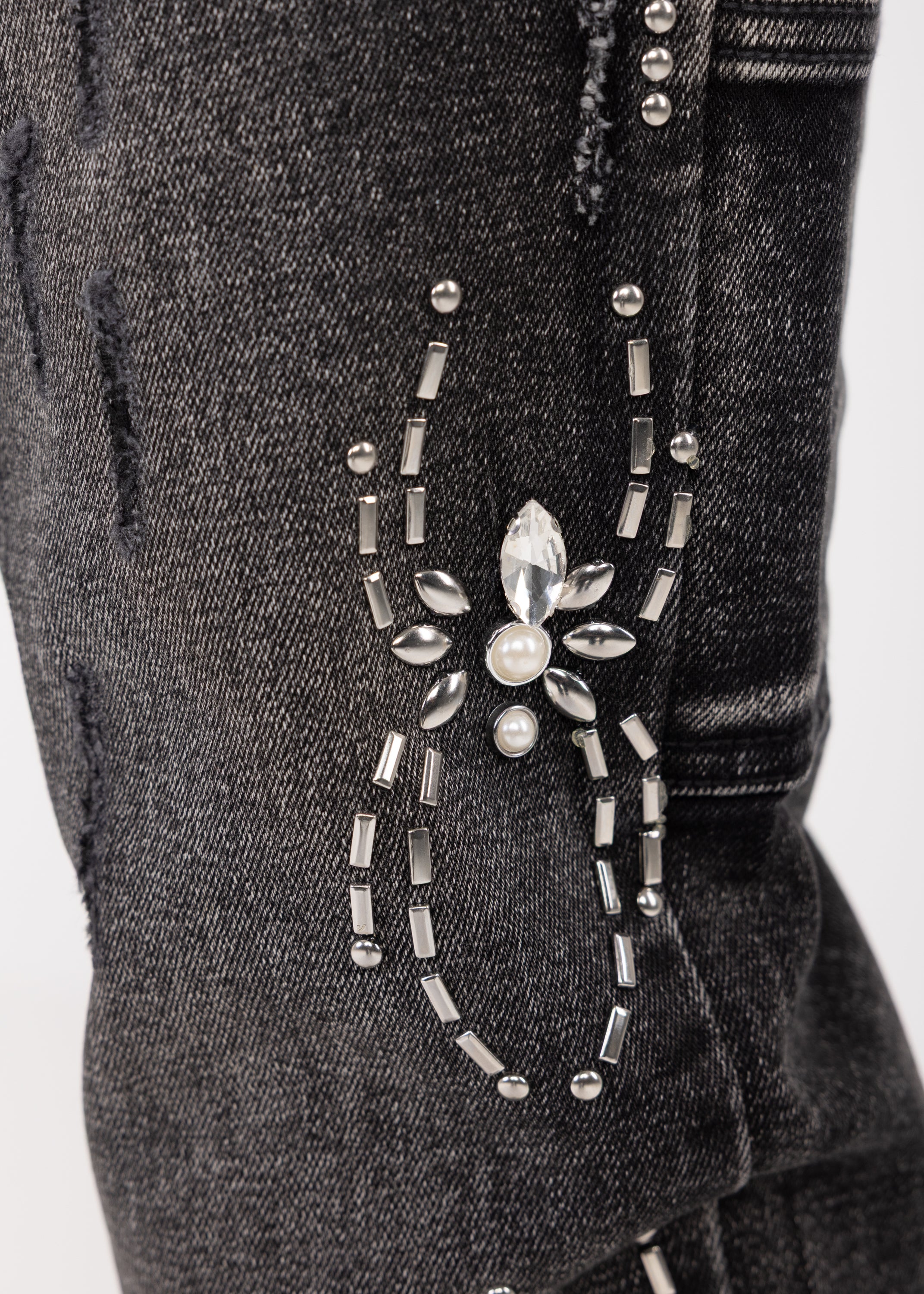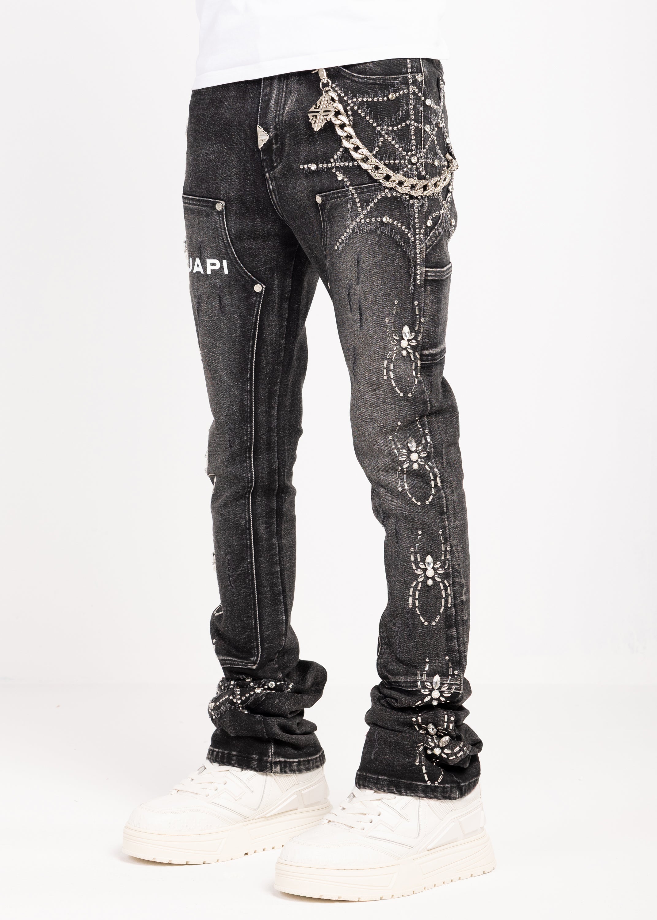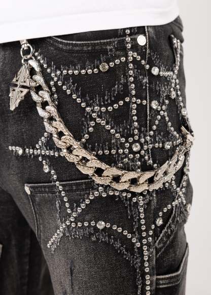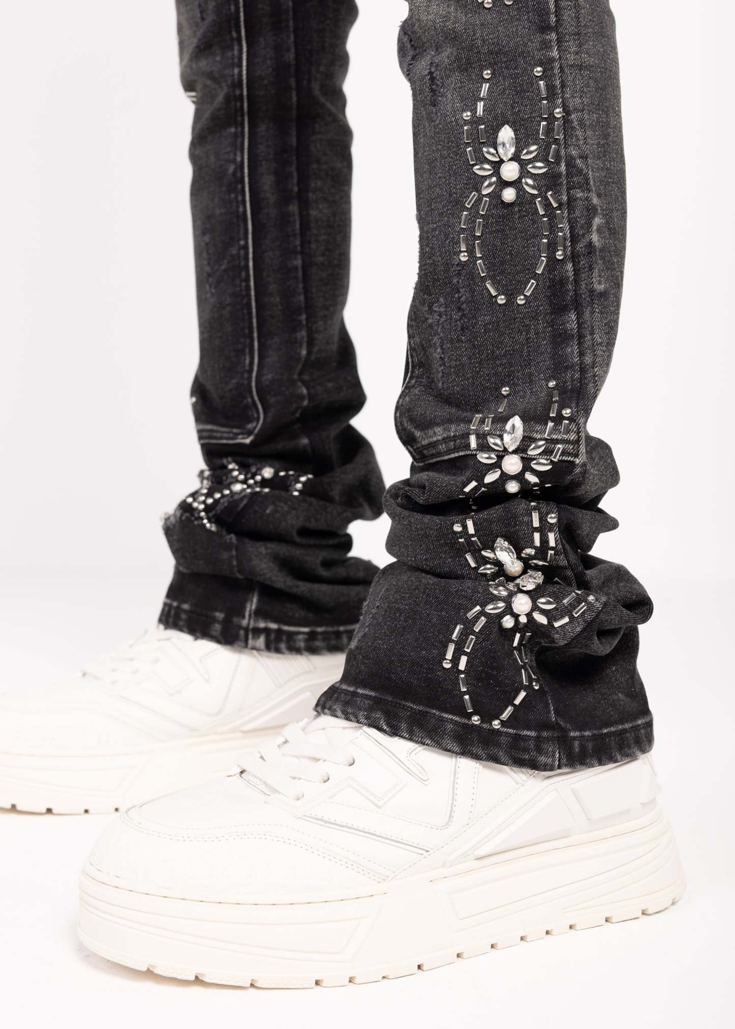 The Obsidian Black Spider Denim is a dark, high-impact statement built on a washed black base with a clean, sharp finish. The look is elevated by meticulous crystal-style embellishment: spider motifs run down the legs, while an oversized web design stretches across the upper thigh and flares again near the hem, catching light with controlled intensity.