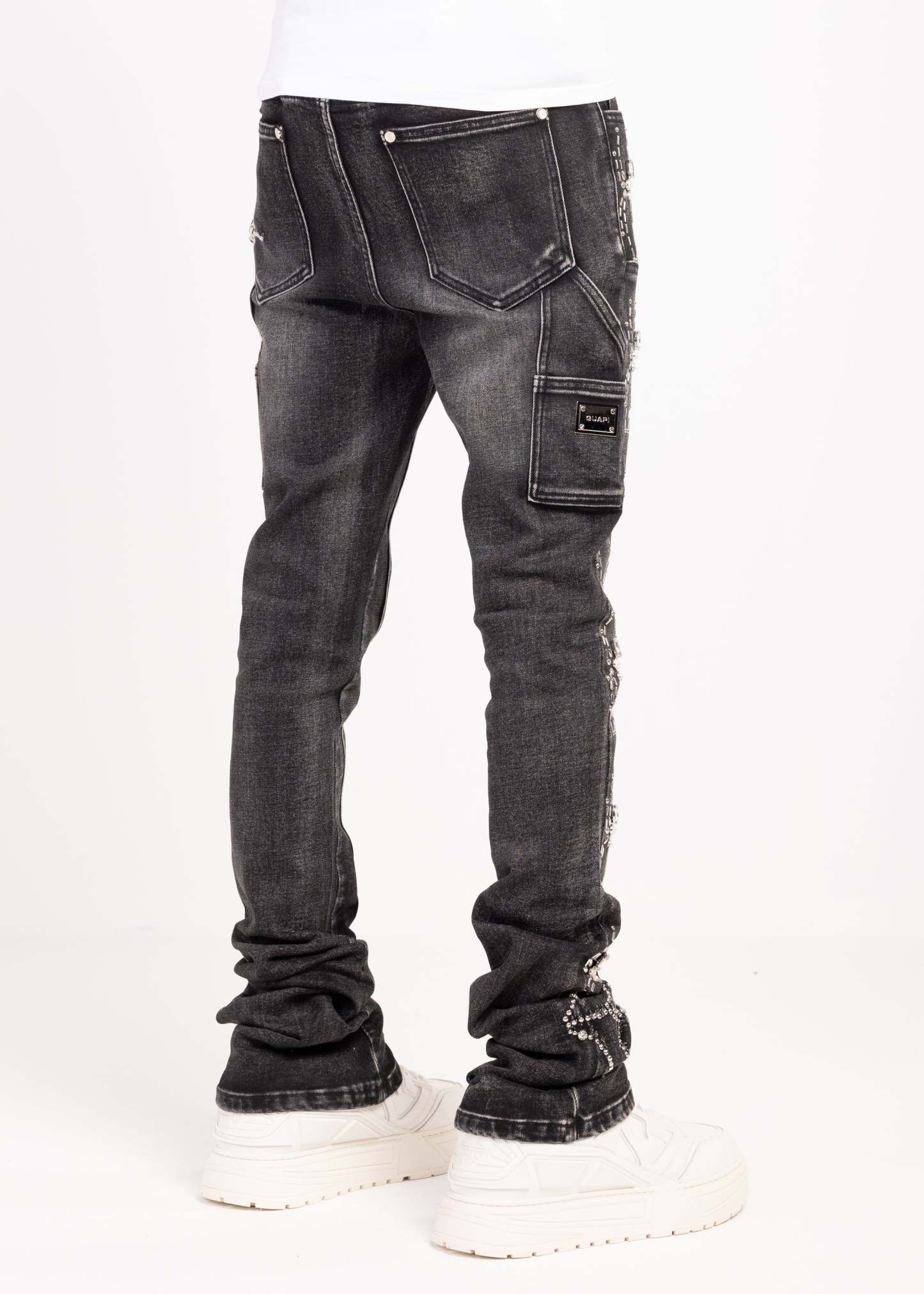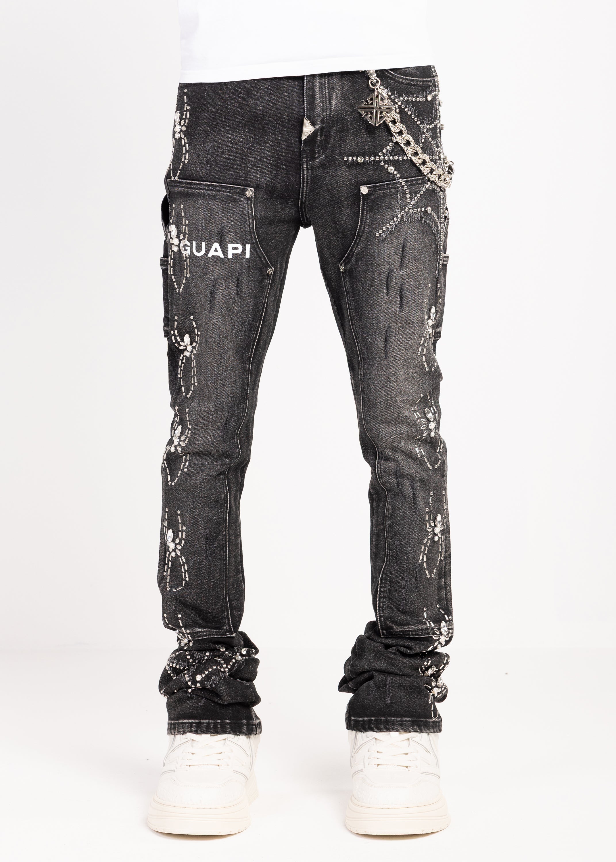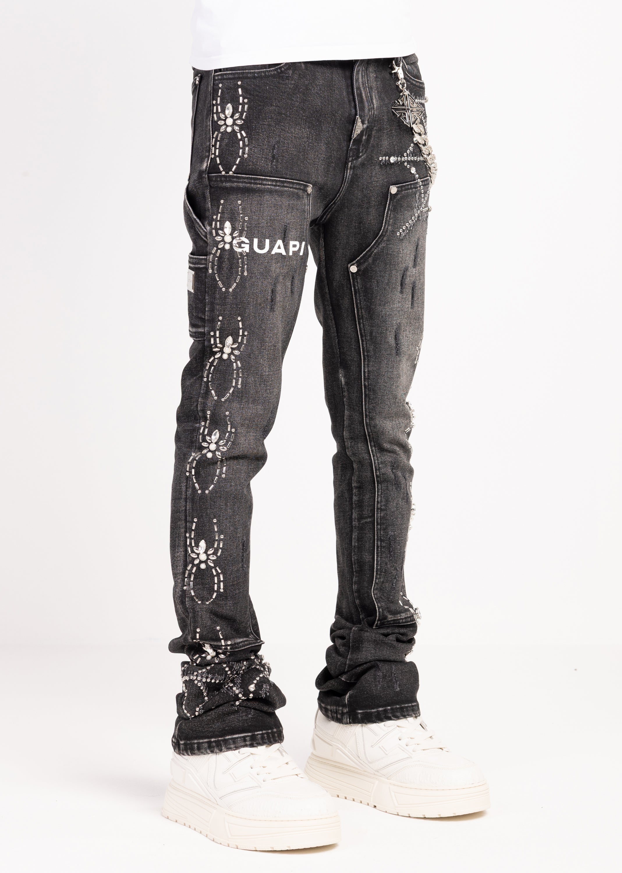 The Obsidian Black Spider Denim is a dark, high-impact statement built on a washed black base with a clean, sharp finish. The look is elevated by meticulous crystal-style embellishment: spider motifs run down the legs, while an oversized web design stretches across the upper thigh and flares again near the hem, catching light with controlled intensity.