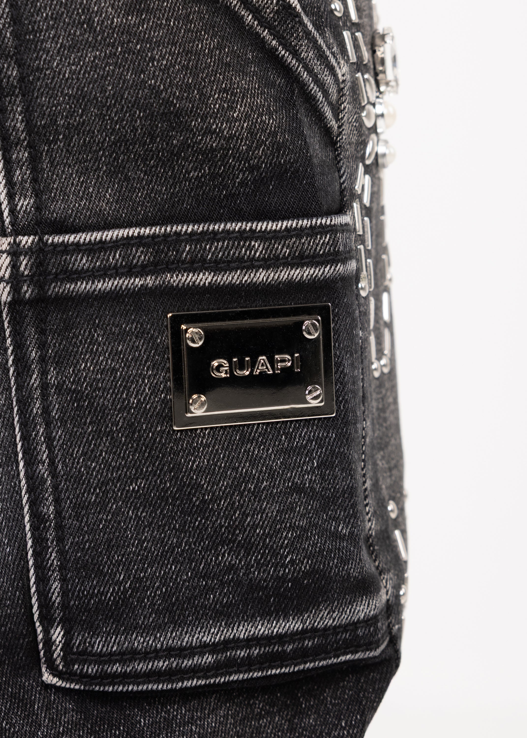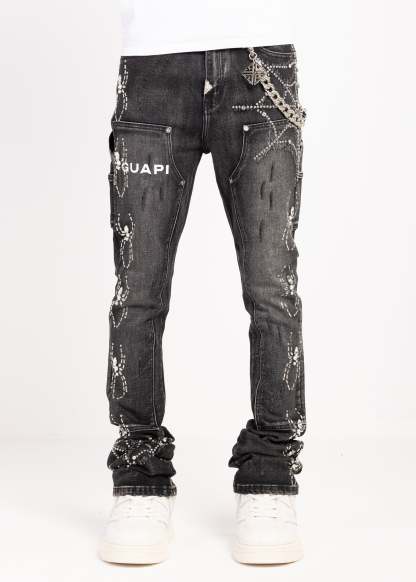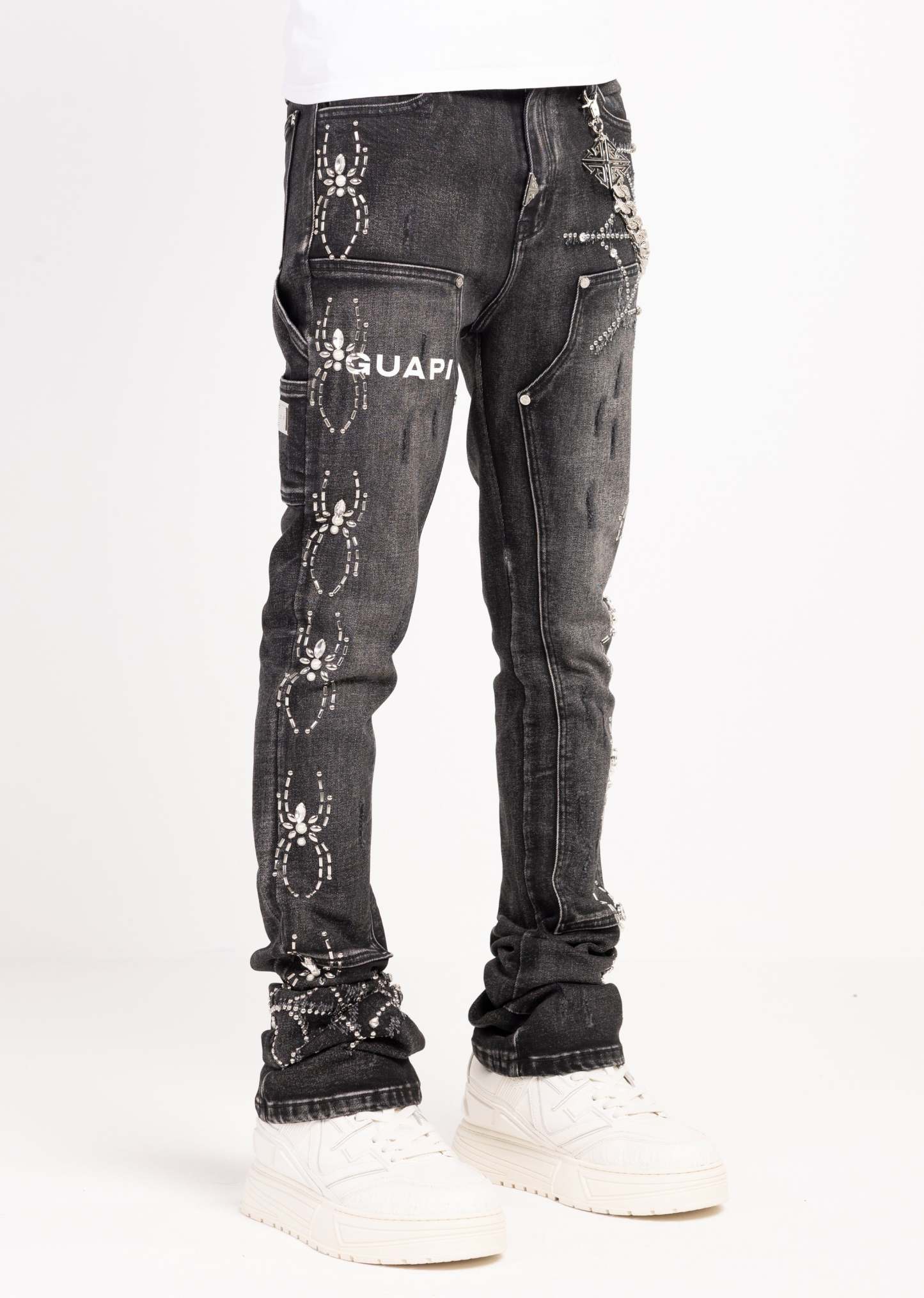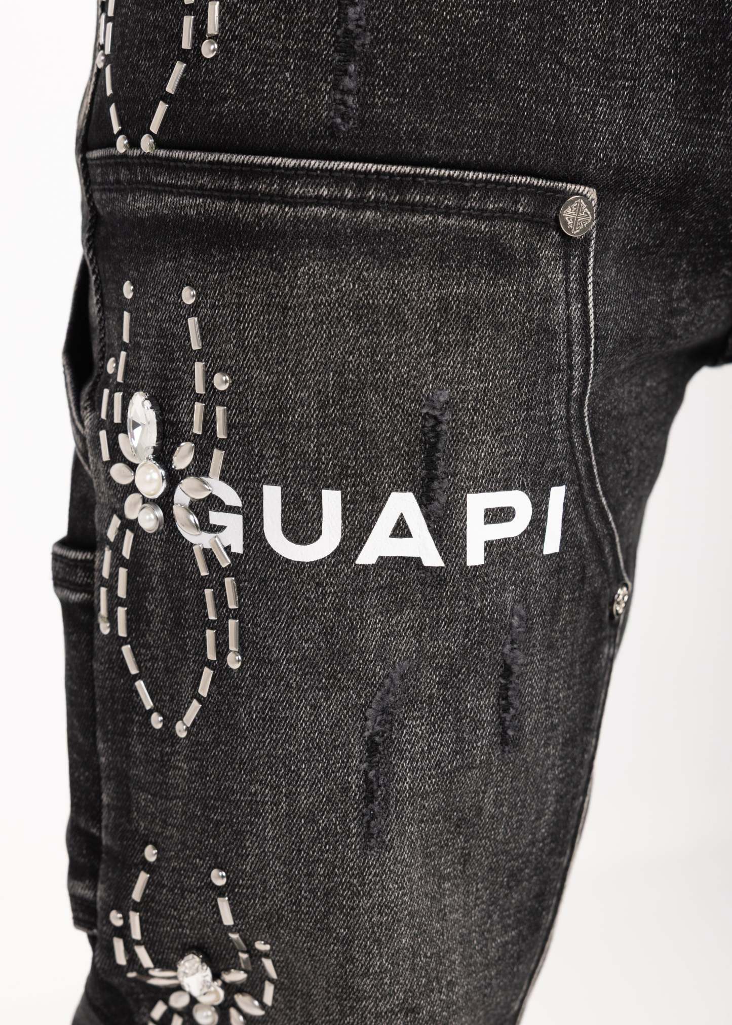Up top, a bold GUAPI print sits on the left thigh panel, balanced by sculpted pocket placement and rivet detailing. A detachable-style silver-toned chain with a geometric charm drapes from the waistband area, adding a jewelry-level accent that’s unmistakably premium. The wash is subtle but deliberate, with light whiskering and faint distress-style markings that keep the denim textured without looking messy.