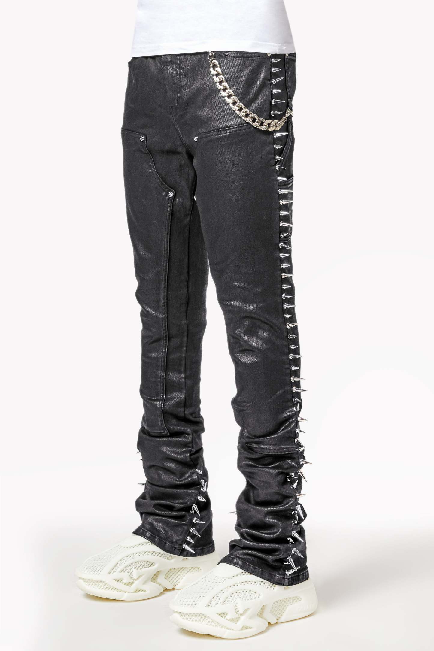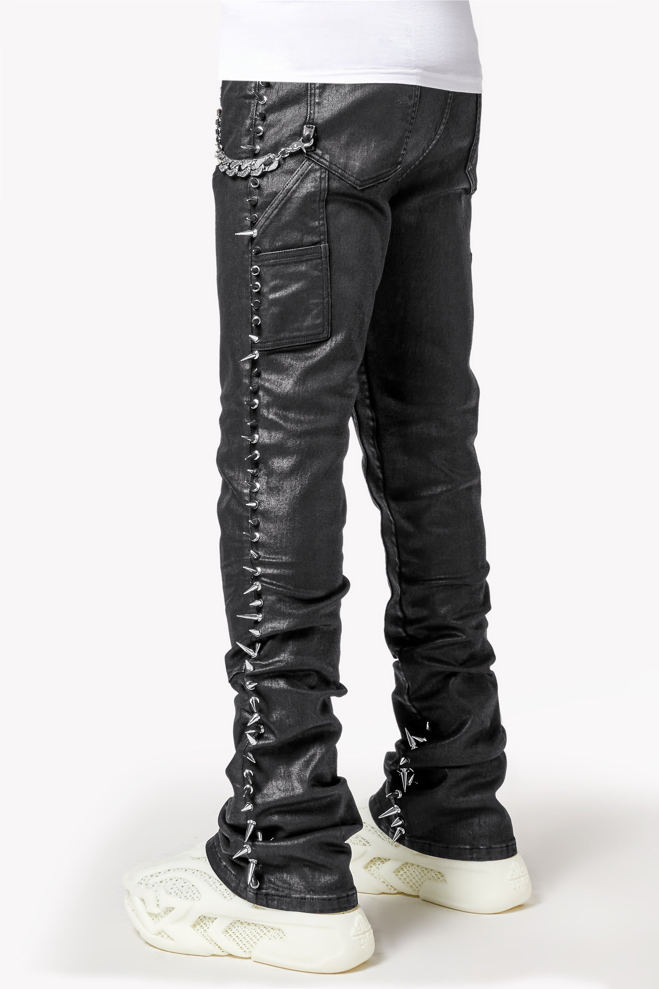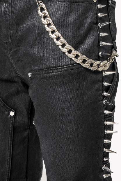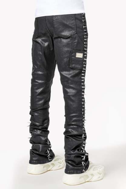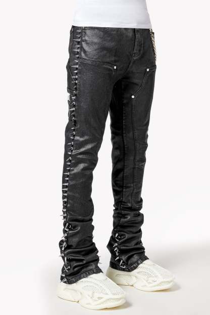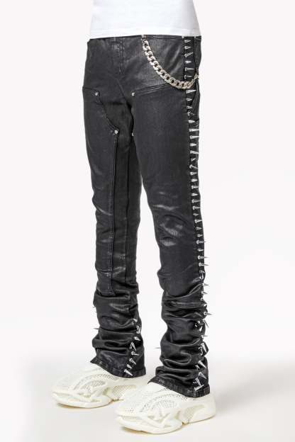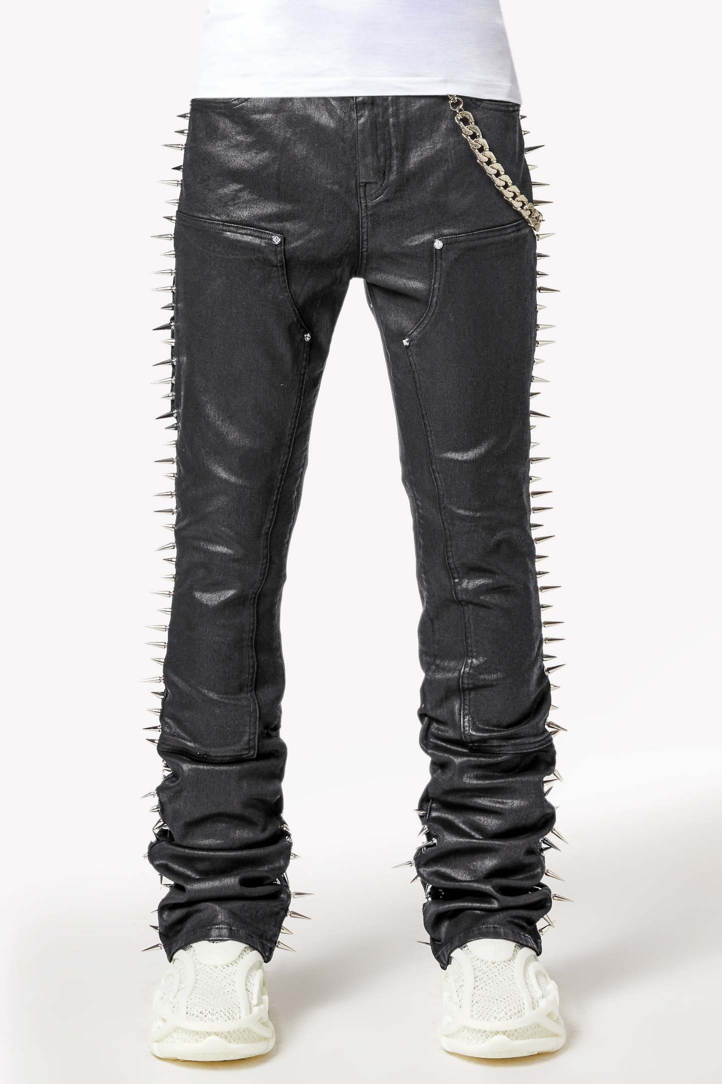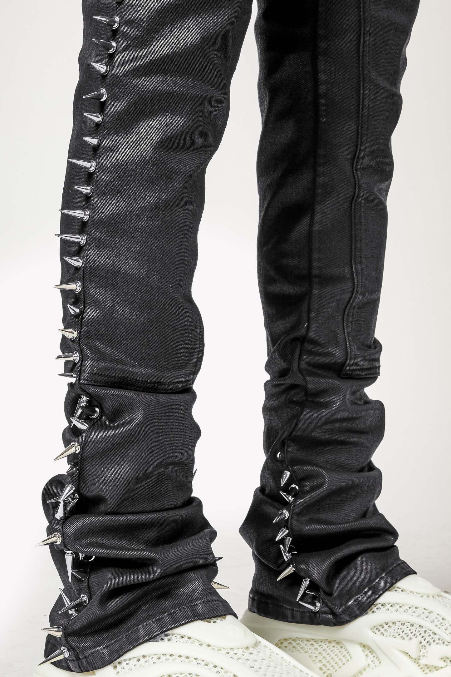The Obsidian Black Spikes Denim combines bold aesthetics with contemporary streetwear design. Its waxed finish offers a sleek, high-shine texture, while metal spike detailing along the seams adds a rebellious edge. The stacked fit ensures a modern silhouette, making this piece a statement addition to any wardrobe.