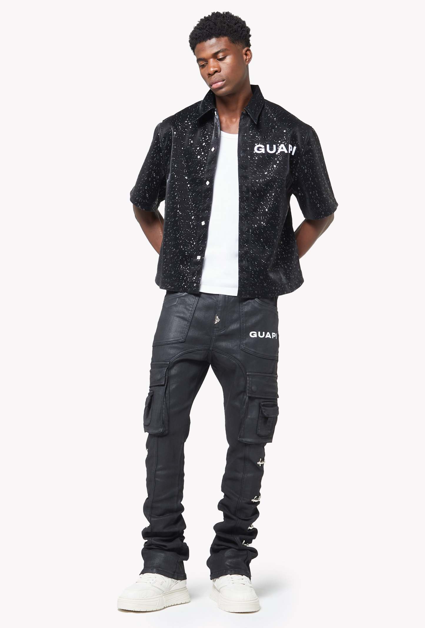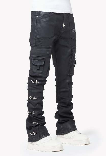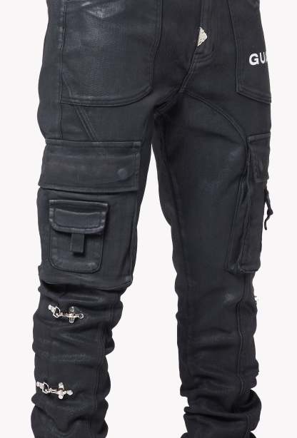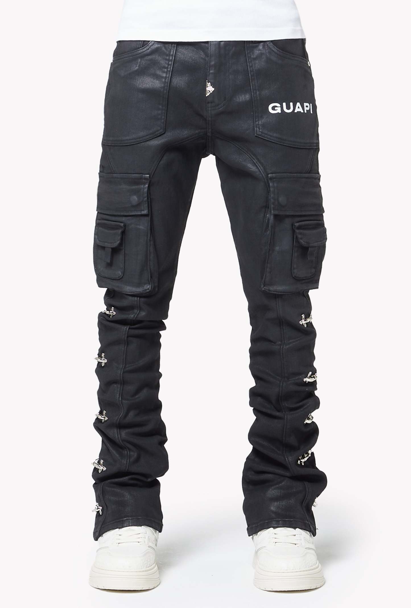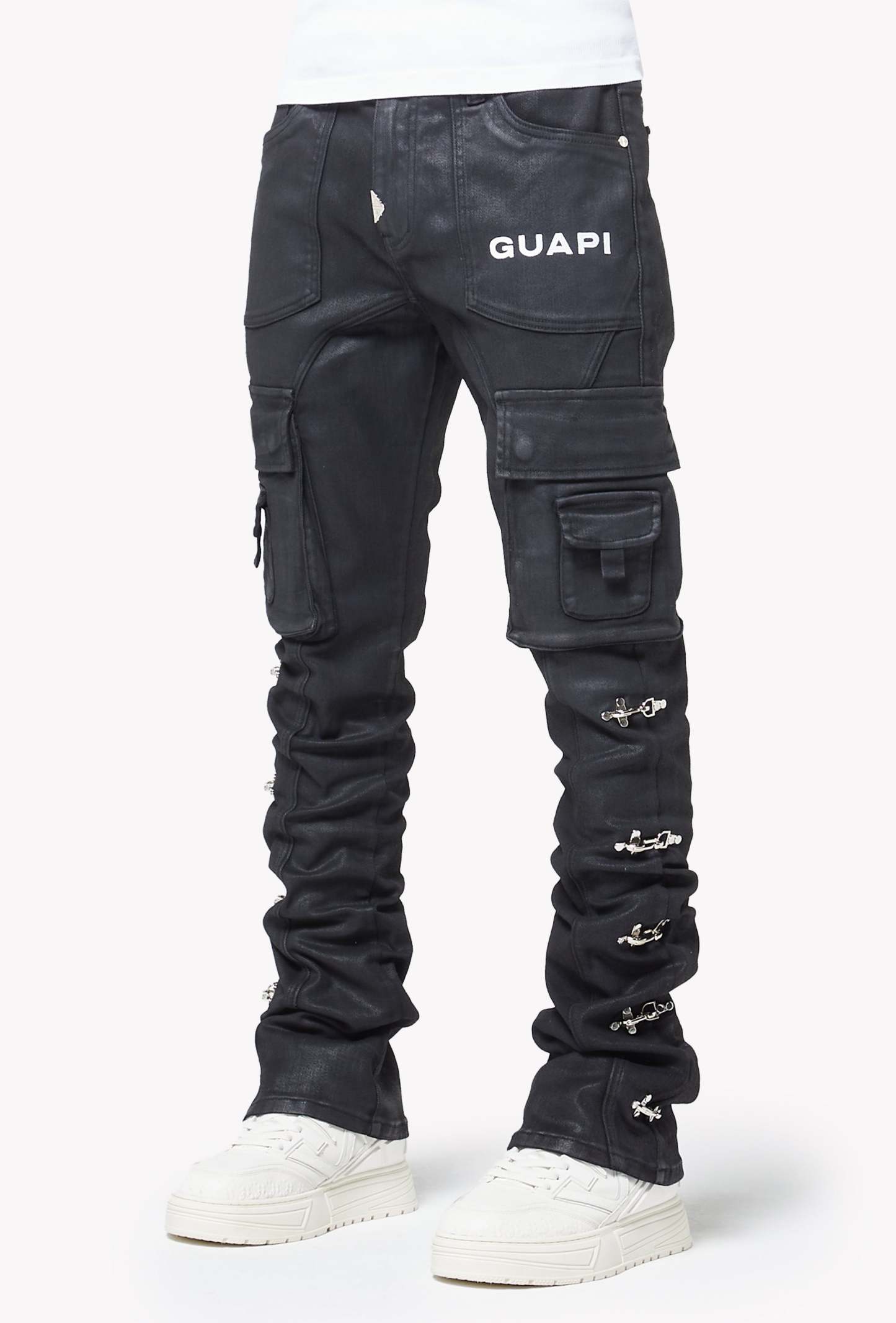 Silver cross-lock hardware runs vertically along the lower legs, adding an aggressive metal detail that sets the style apart. Natural stacking builds around the ankles for a signature GUAPI silhouette. Finished with branded embroidery and functional pocket layout, these cargos combine utility, edge, and premium craftsmanship in one standout piece.