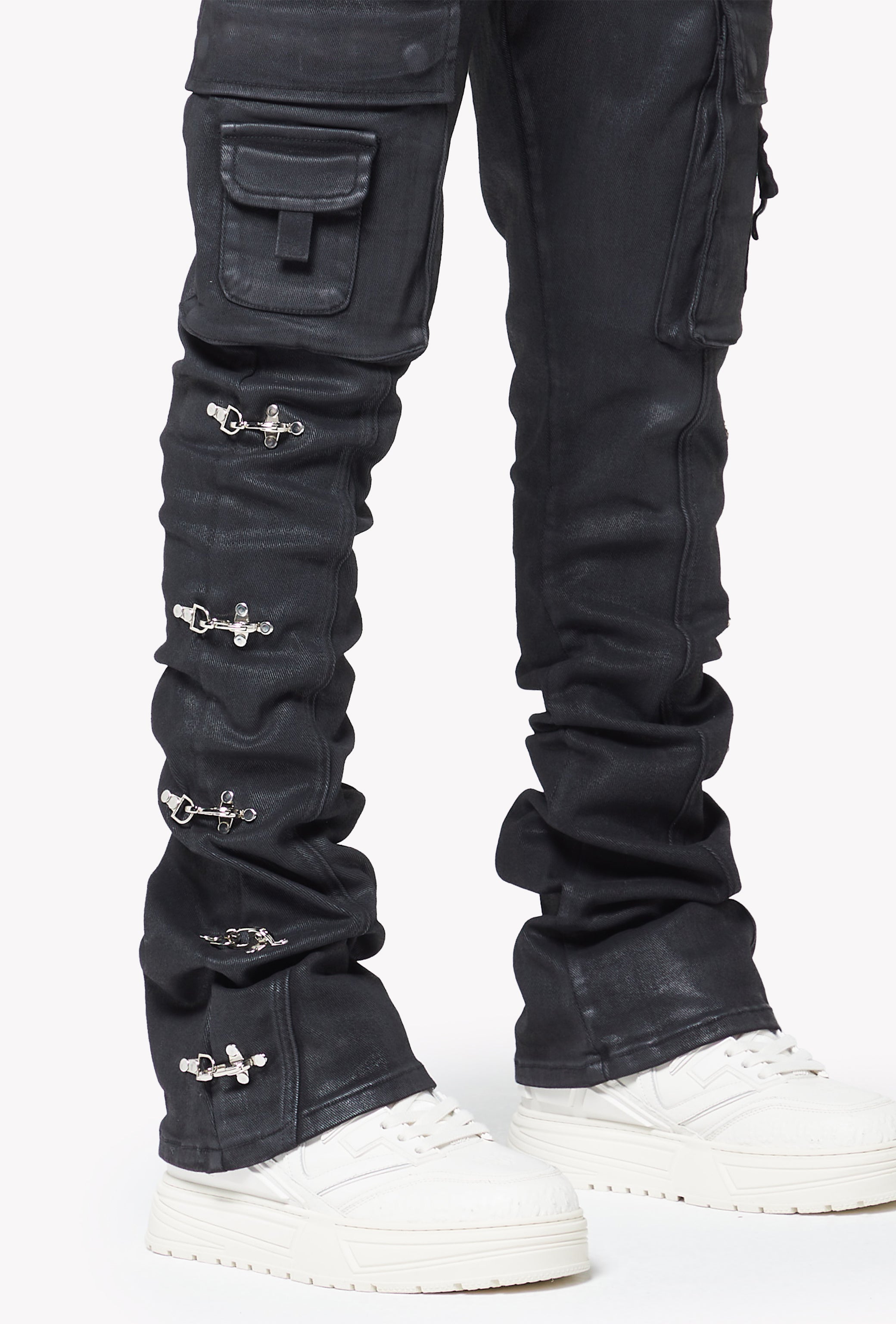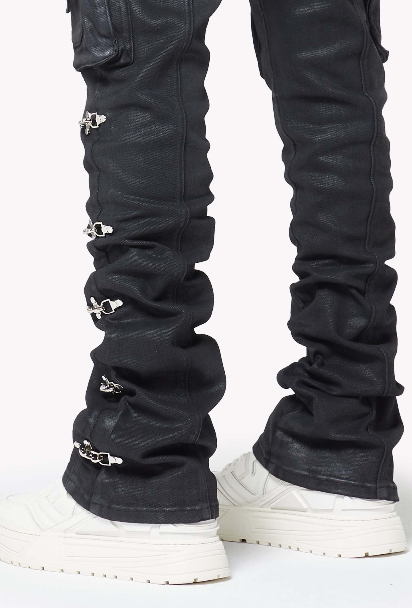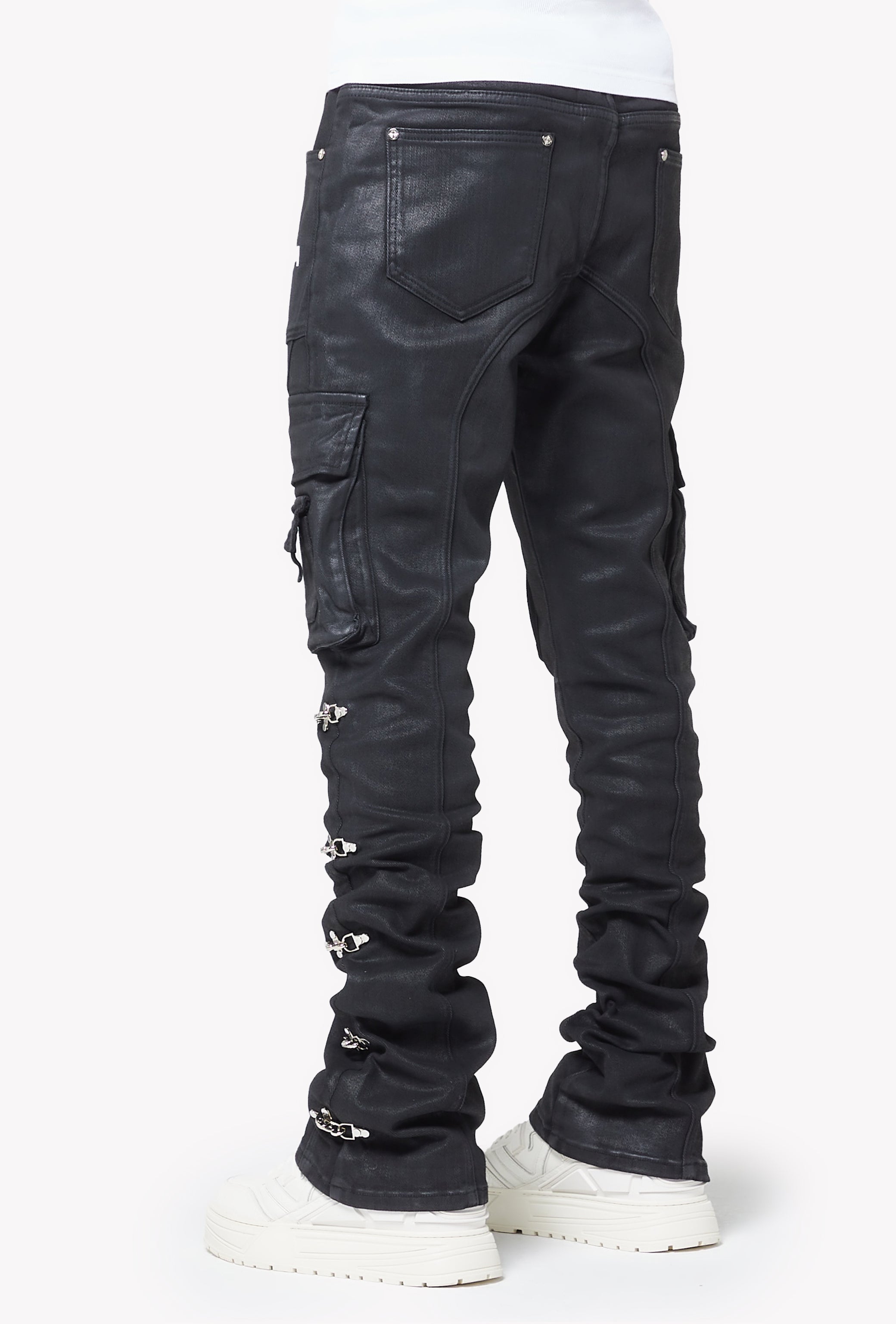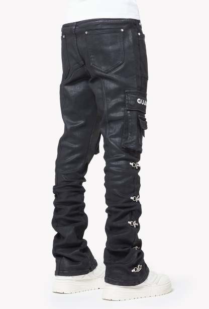 The Obsidian Black Waxed Cargo Denim blends rugged streetwear energy with a refined, sculpted silhouette. Made from heavyweight denim coated in a matte-black wax finish, these cargos carry the look of leather while keeping the flexibility and breathability of denim. The multi-panel construction gives the legs a sharp, shaped structure, while deep cargo pockets and engineered seam lines enhance the tactical aesthetic.