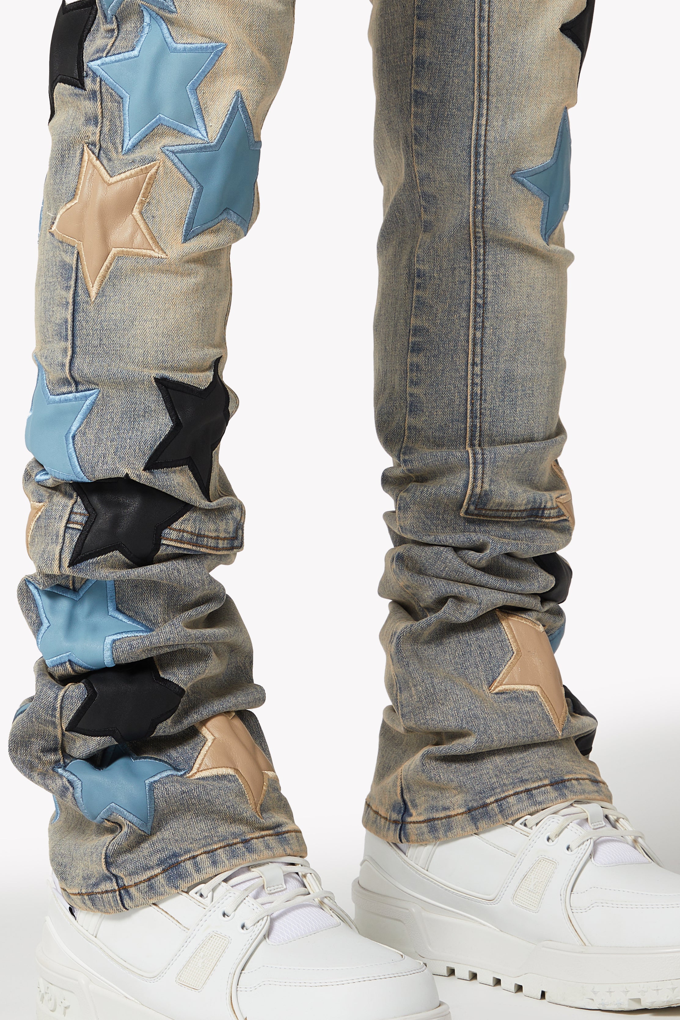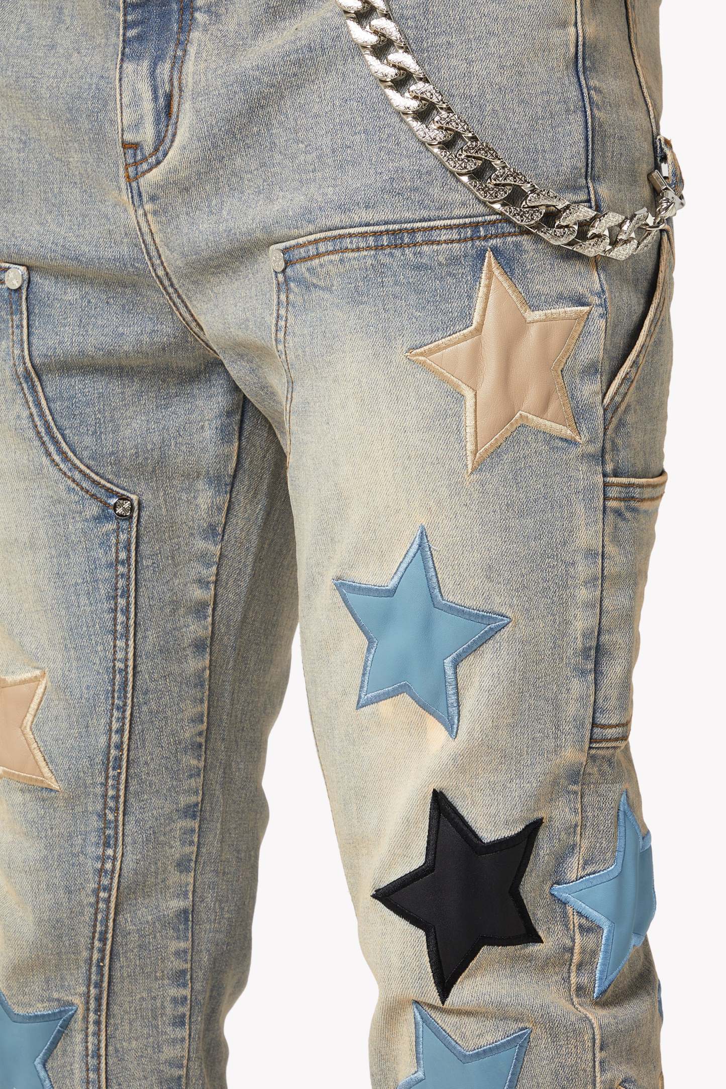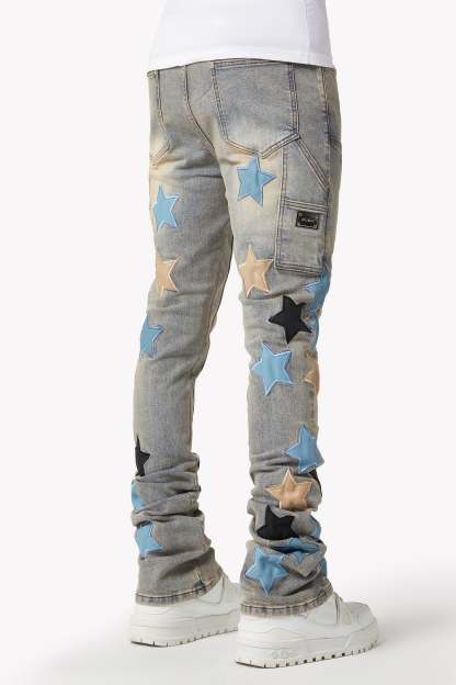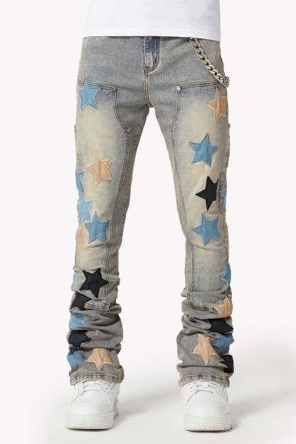 The Powder Blue Vintage Stars Denim seamlessly blends classic denim with bold, contemporary accents. Featuring a light-wash vintage look and star-shaped leather appliqués, these jeans bring a unique, standout style to any wardrobe. Perfect for those who want to elevate their fashion game with playful yet refined details.