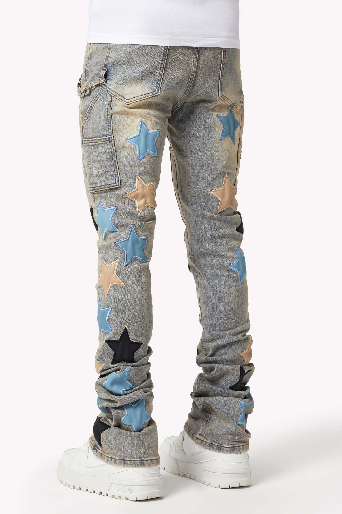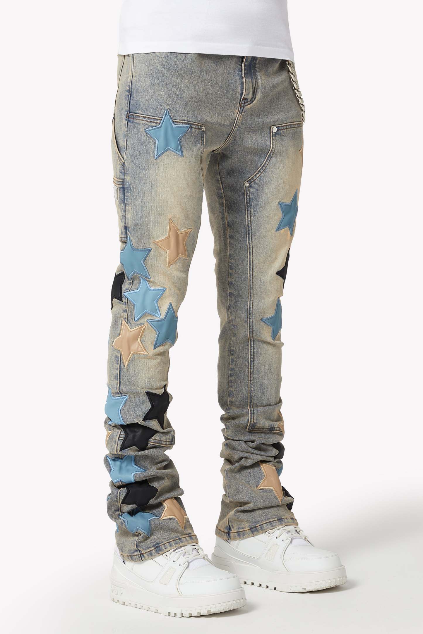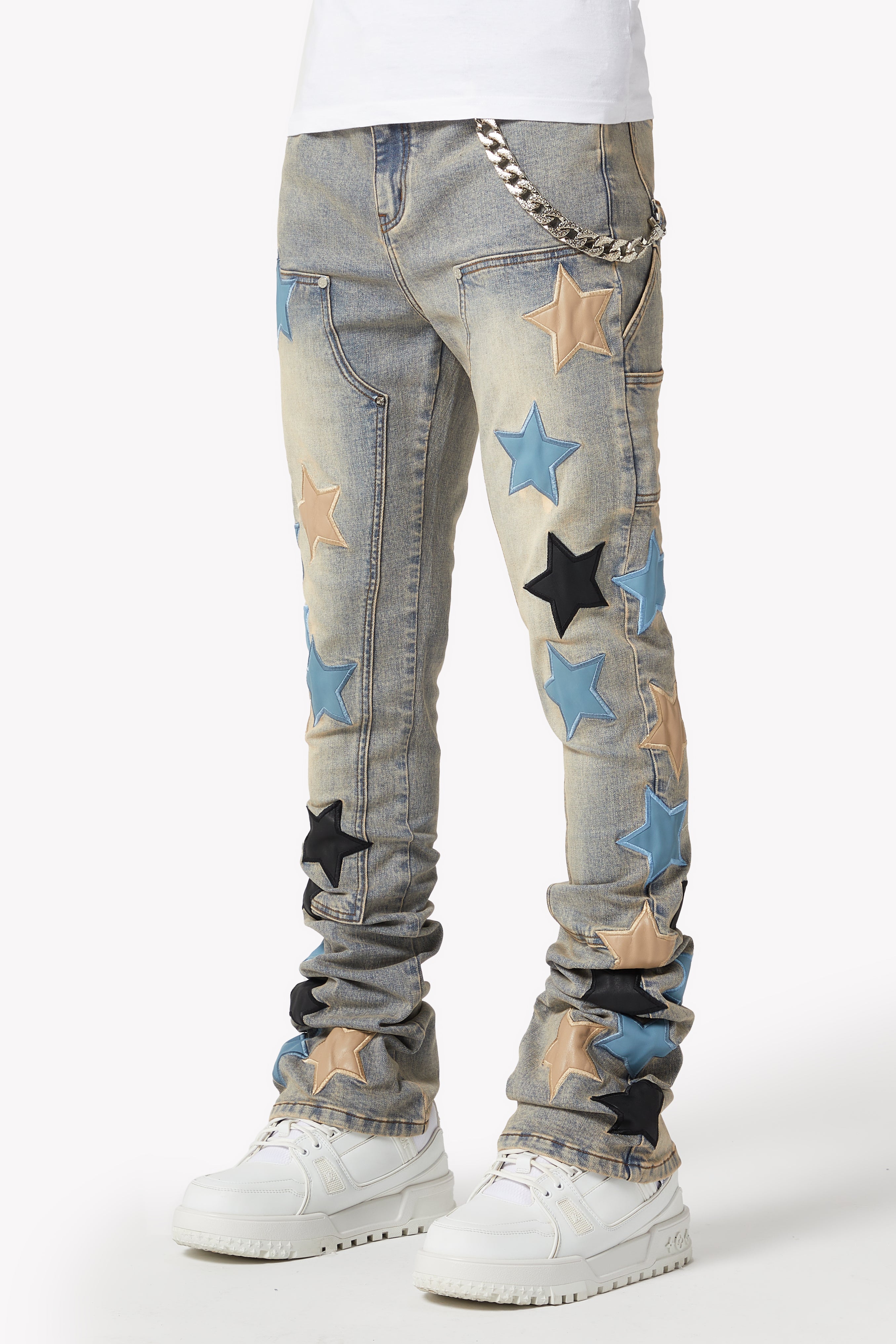 The Powder Blue Vintage Stars Denim seamlessly blends classic denim with bold, contemporary accents. Featuring a light-wash vintage look and star-shaped leather appliqués, these jeans bring a unique, standout style to any wardrobe. Perfect for those who want to elevate their fashion game with playful yet refined details.