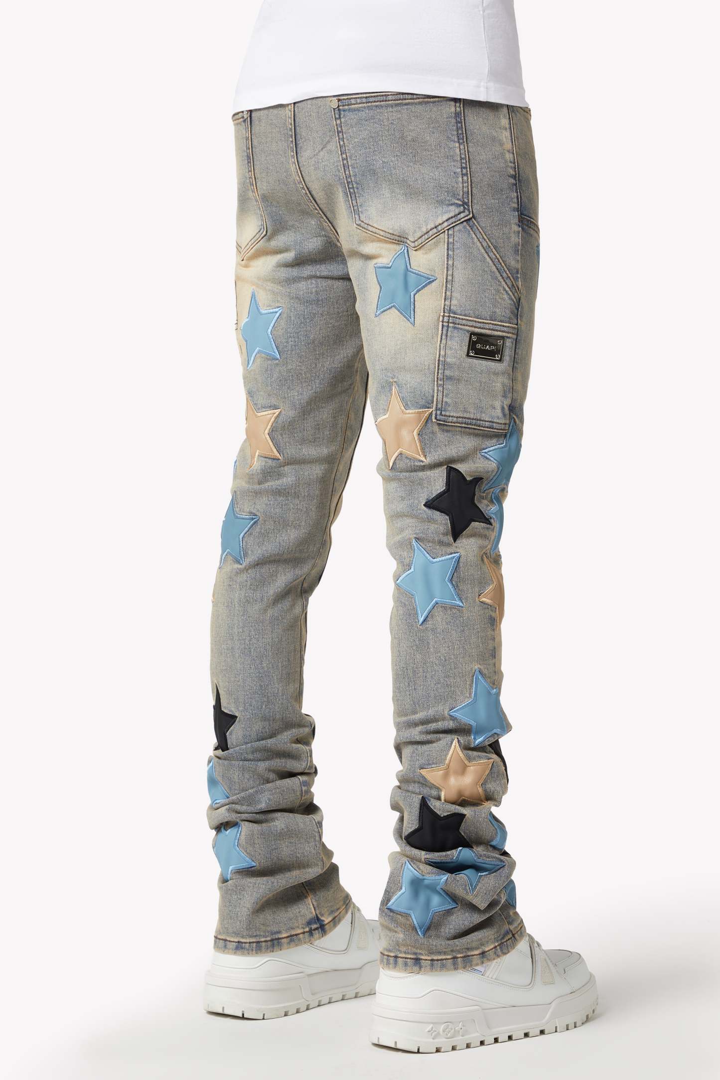 - Bold star patches crafted from premium leather in powder blue, beige, and black for a luxurious touch.