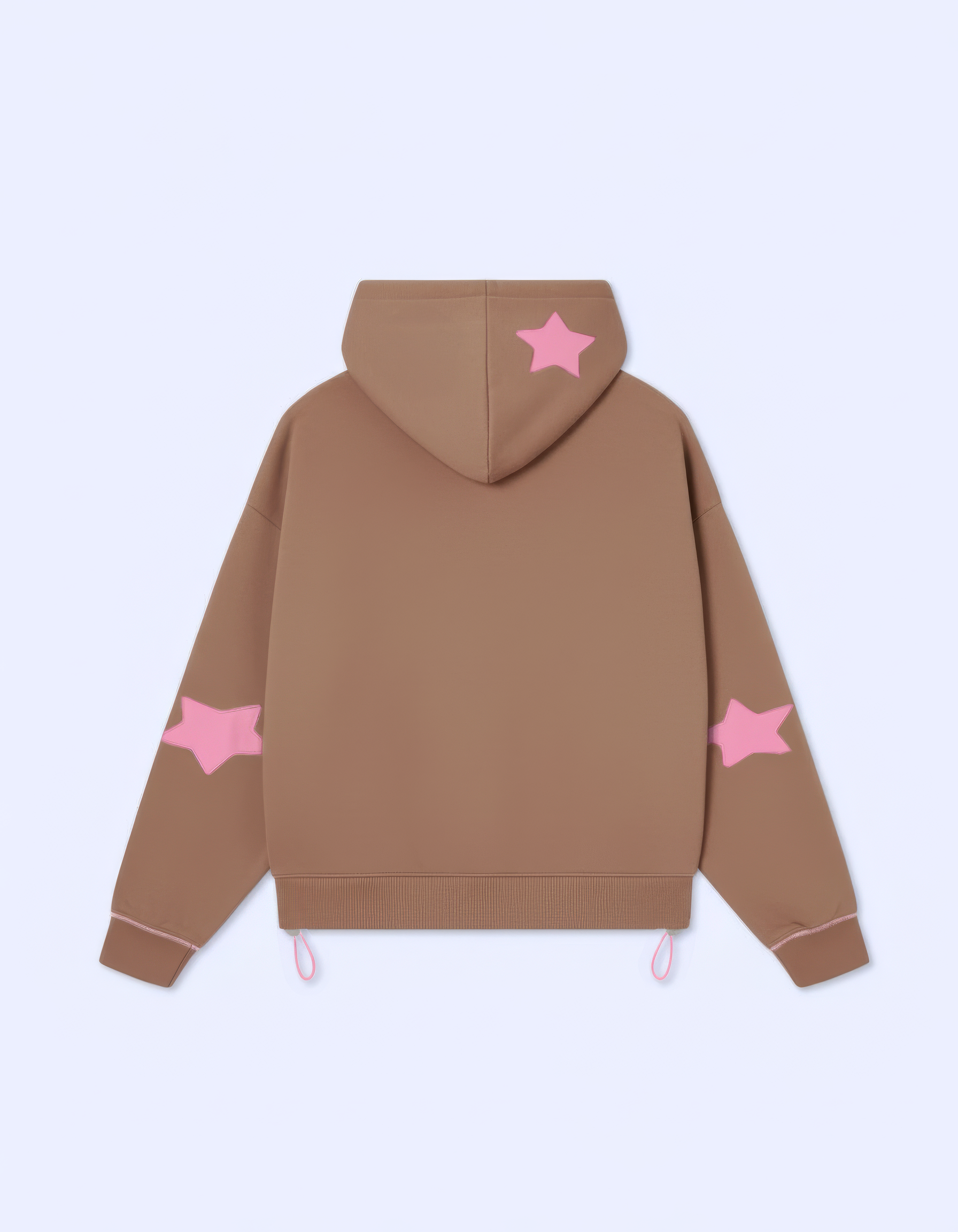 Organic Cottom French Terry 480 GSM (heavyweight). Double Zip Featuring. Custom Zip Zeadings. Boxy Fit. More than Four Apliqué Pink Stars. Front Logo is Full Embroidery. Contrast Pink Stiching on pocket and sleeves.