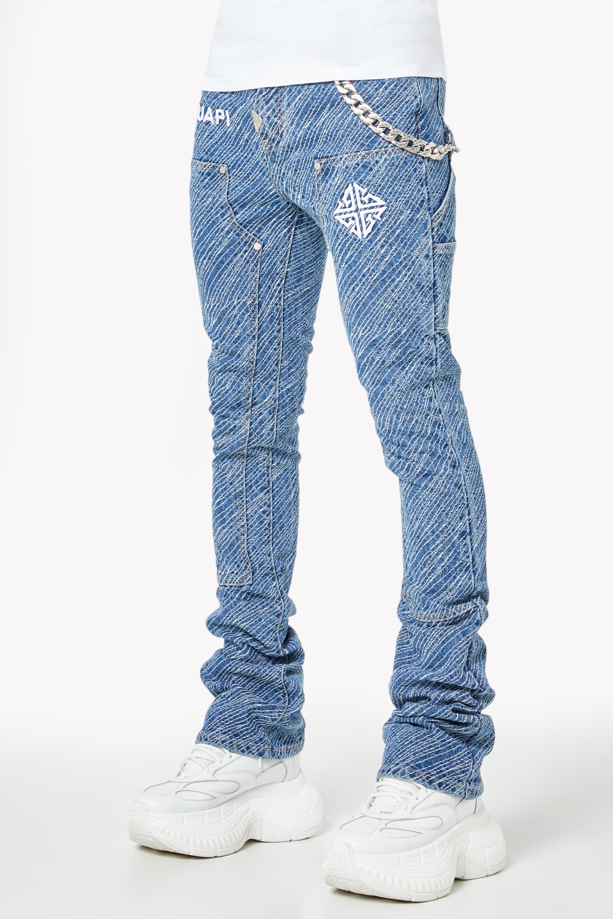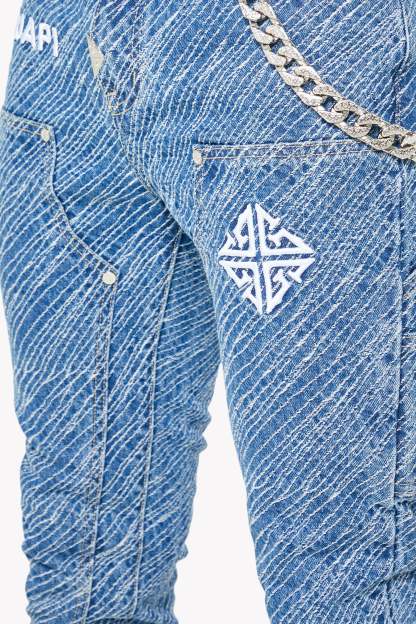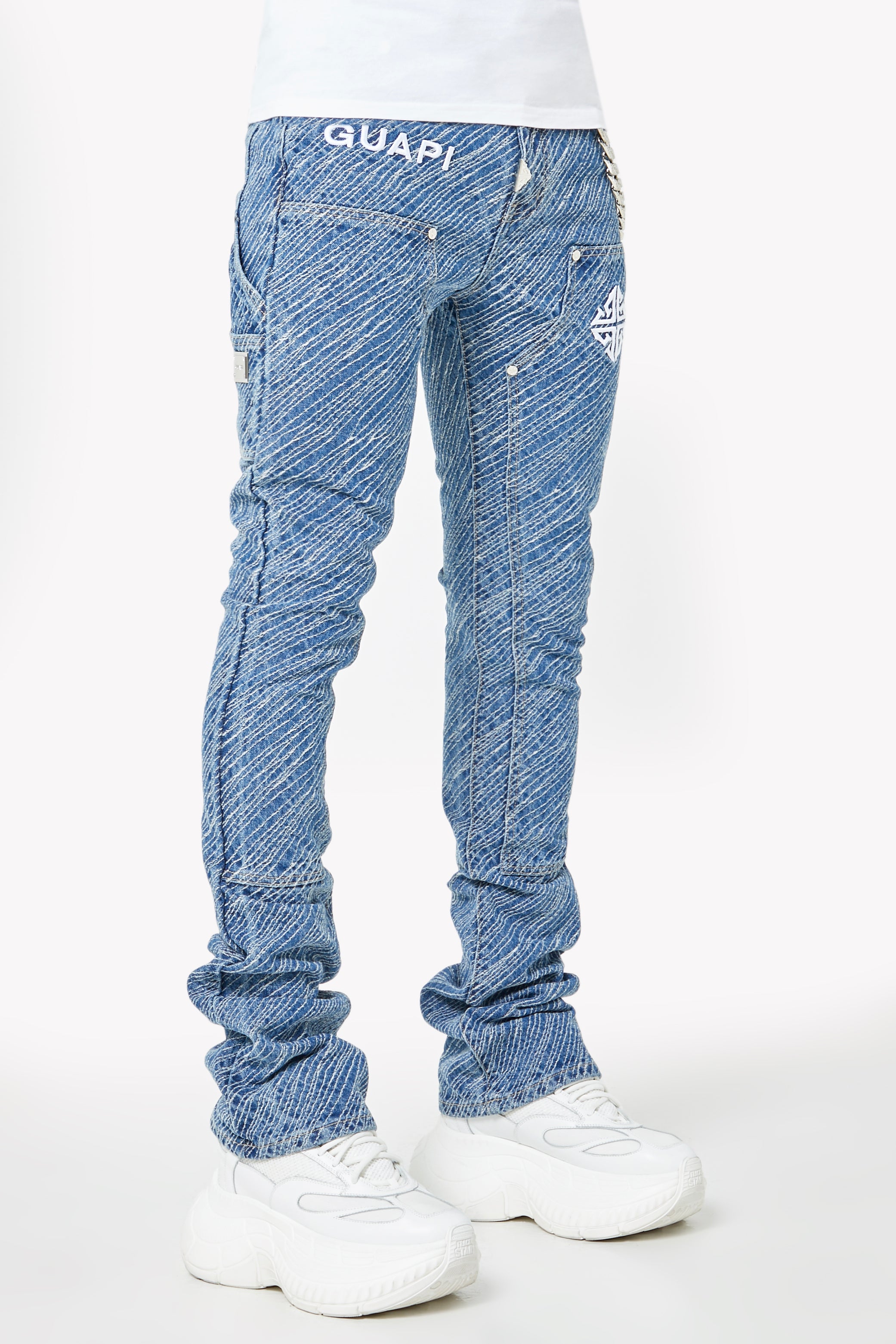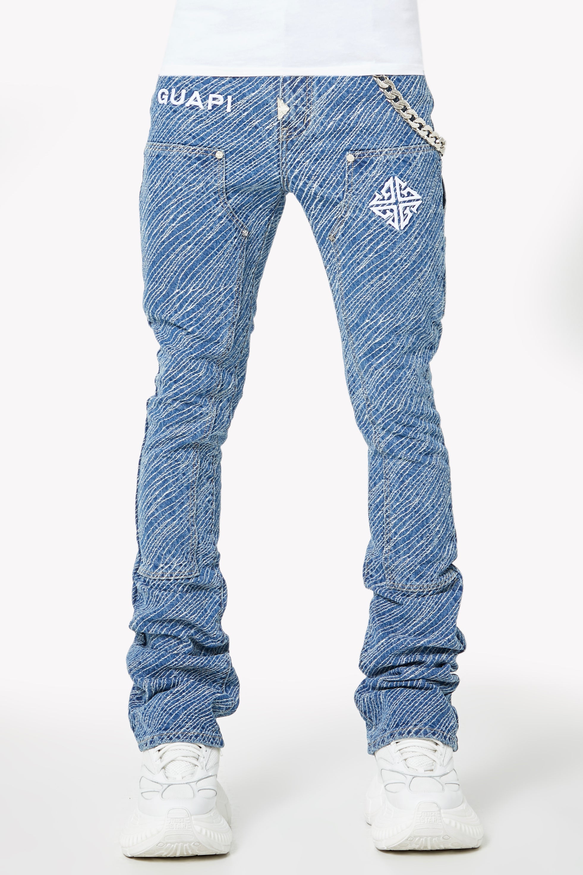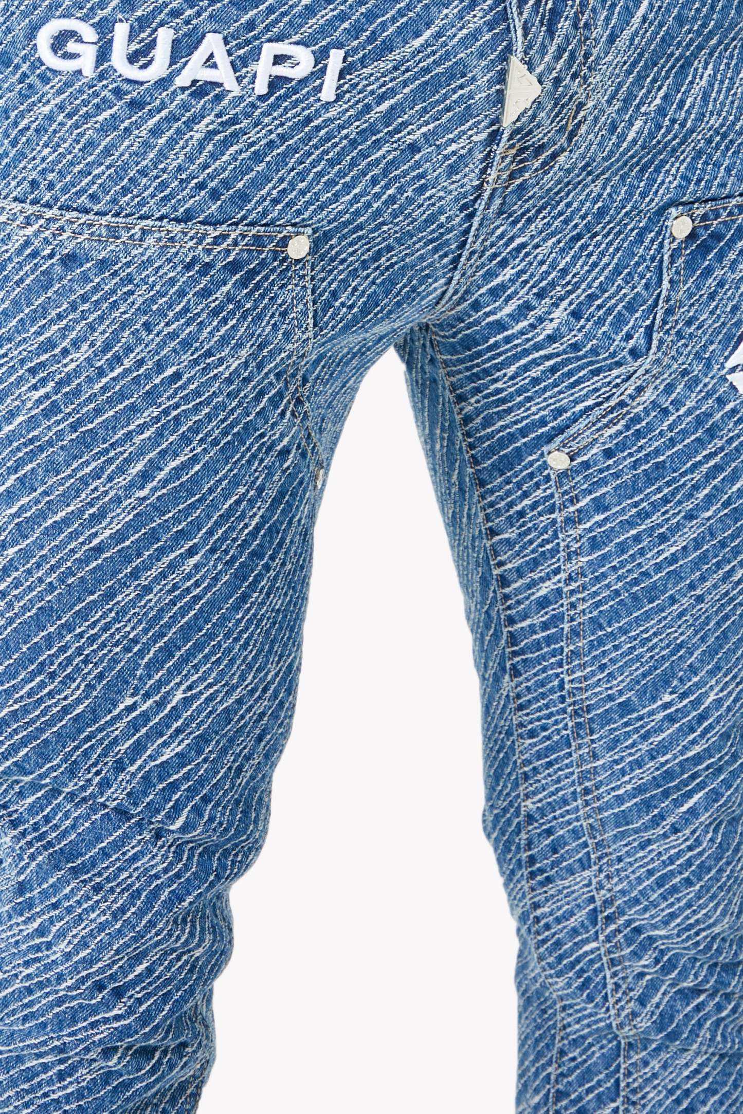 Unleash bold energy with the Royal Blue Striker Denim, engineered for those who move with purpose and style. These jeans make a visual impact through an electric all-over textured stripe wash, adding depth and attitude to every step. Featuring embroidered GUAPI branding and an assertive silhouette, this piece is crafted to energize your fit with a striking streetwear edge.