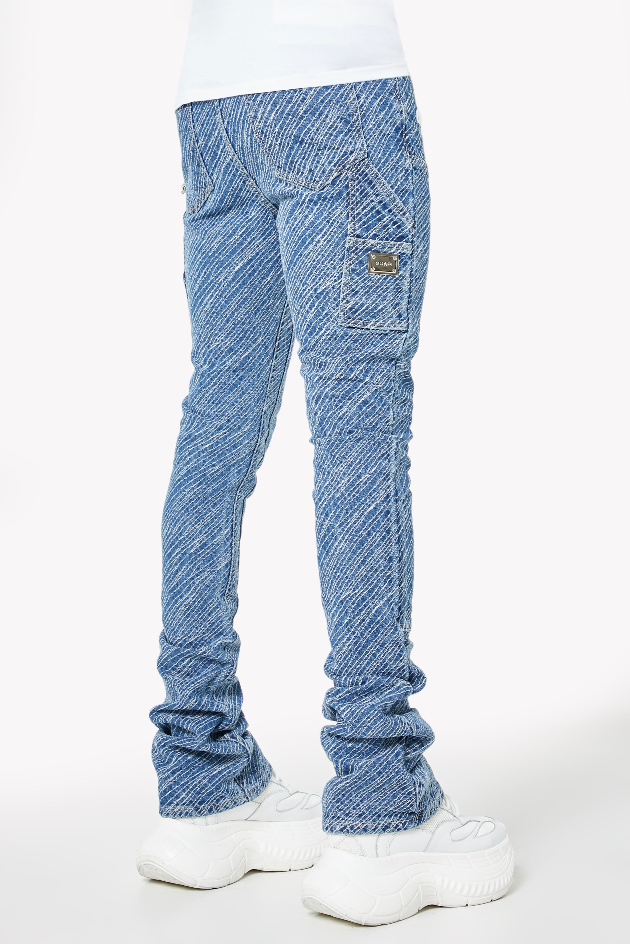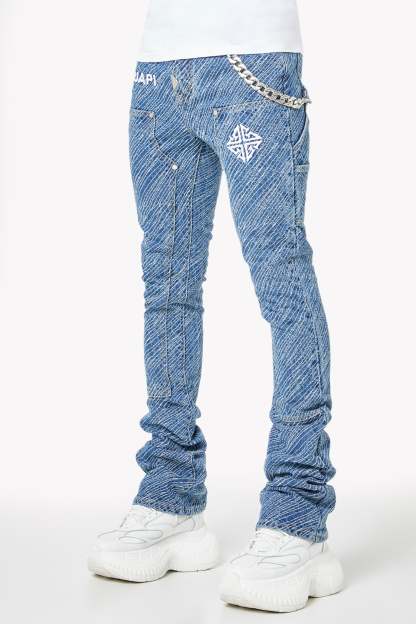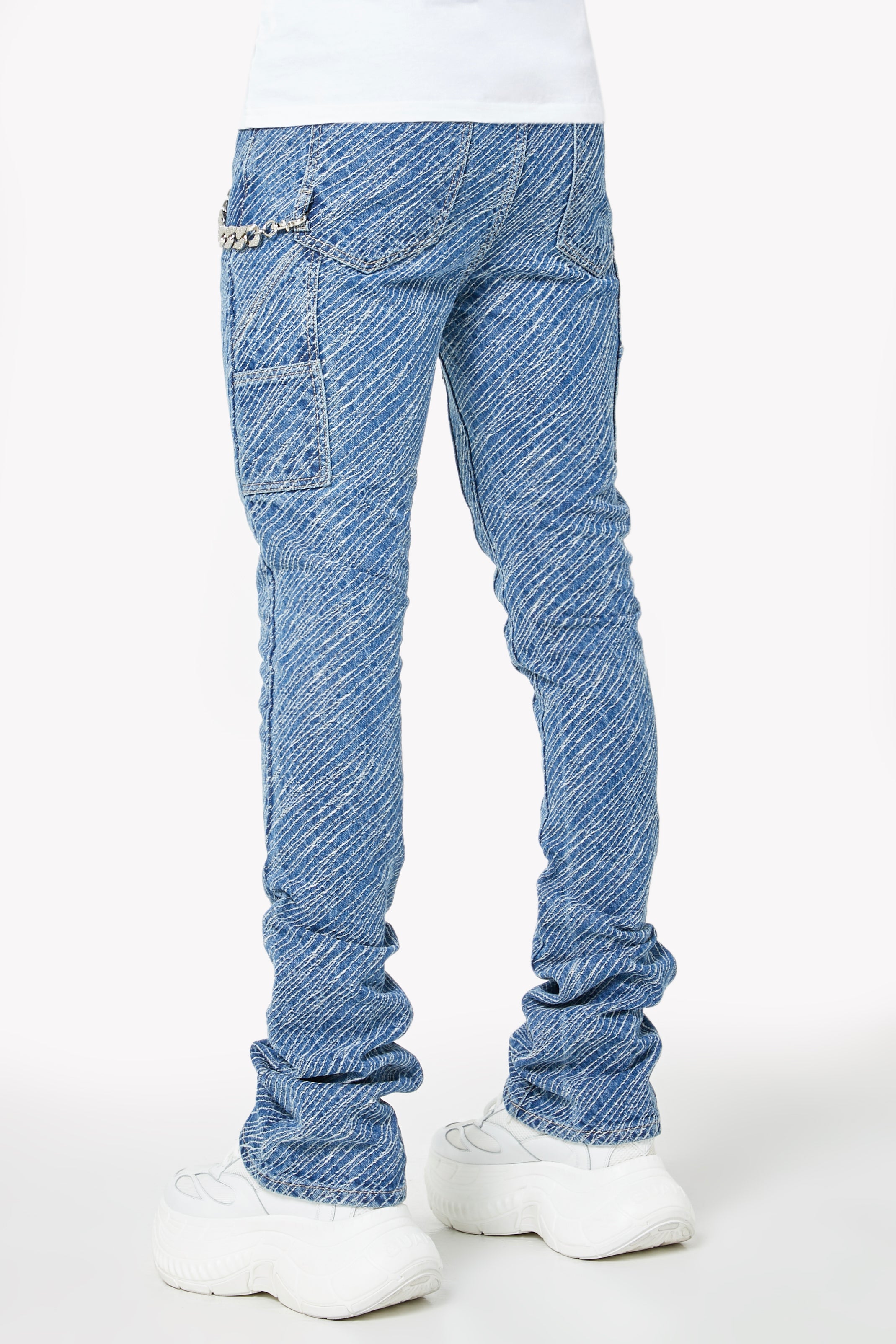 Premium mid-blue denim construction with stacked finish