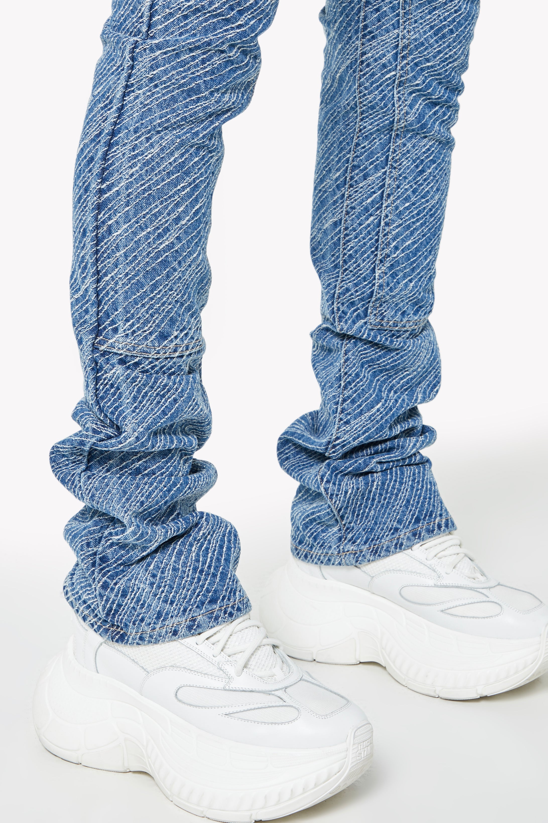 Distinctive high-contrast wave-wash texture across the entire denim