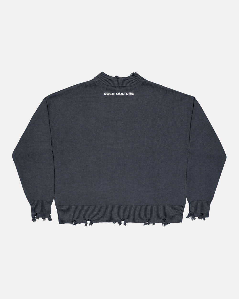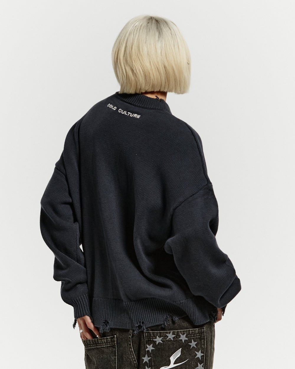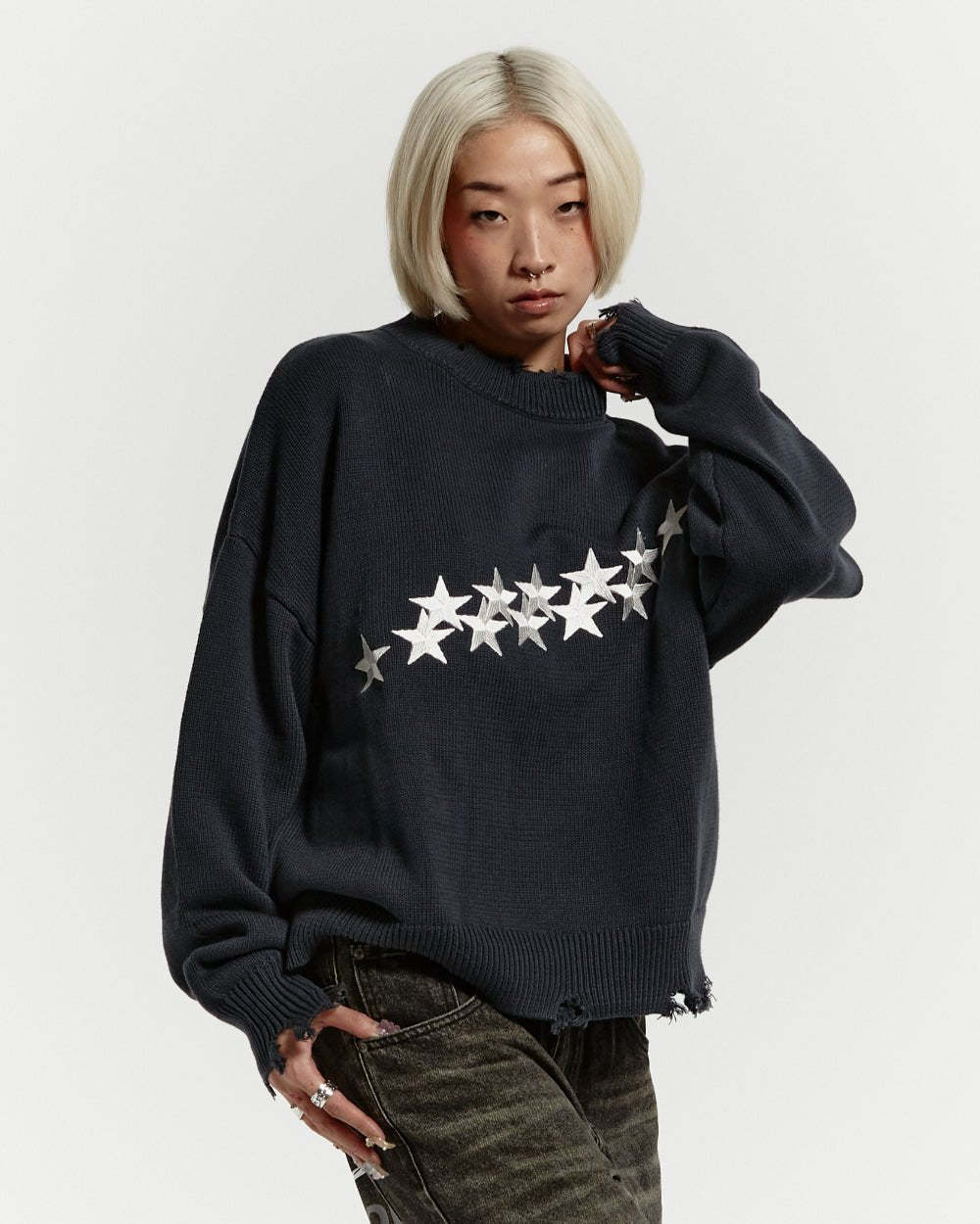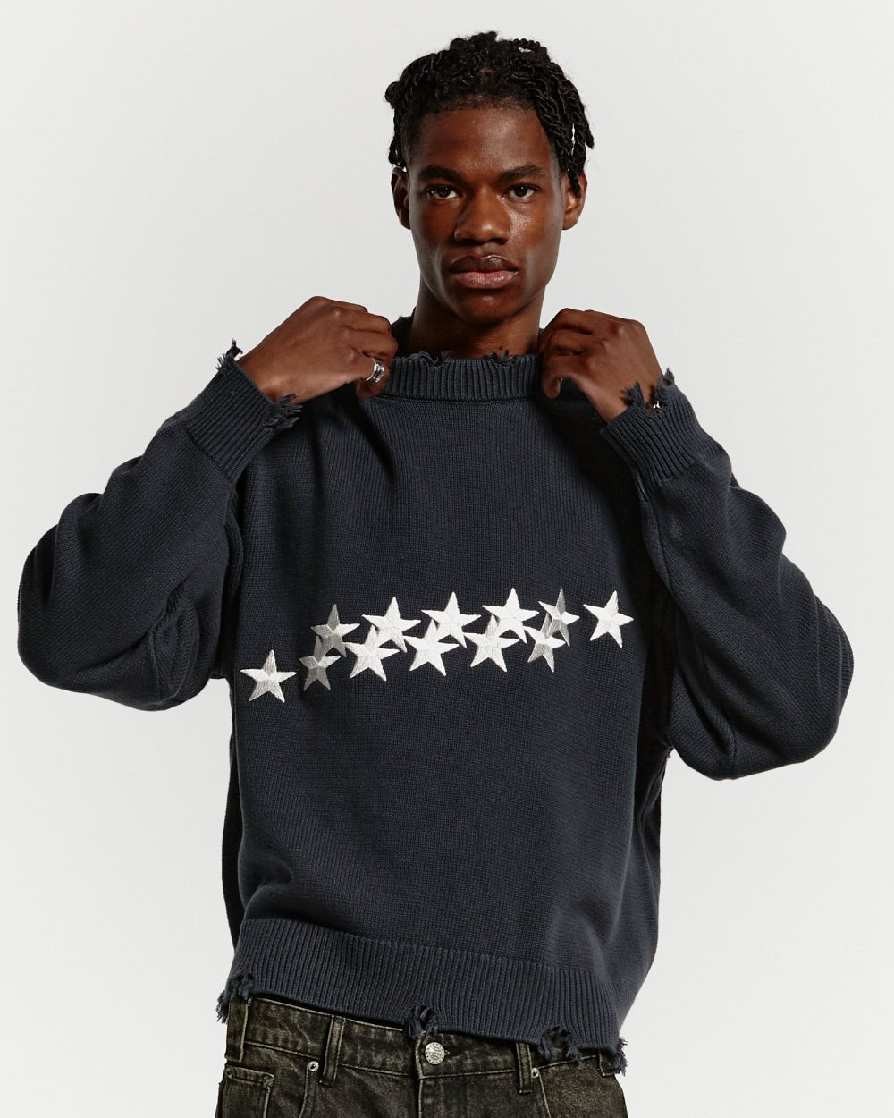 Ripped effect details on the sleeves, waistband and collar.