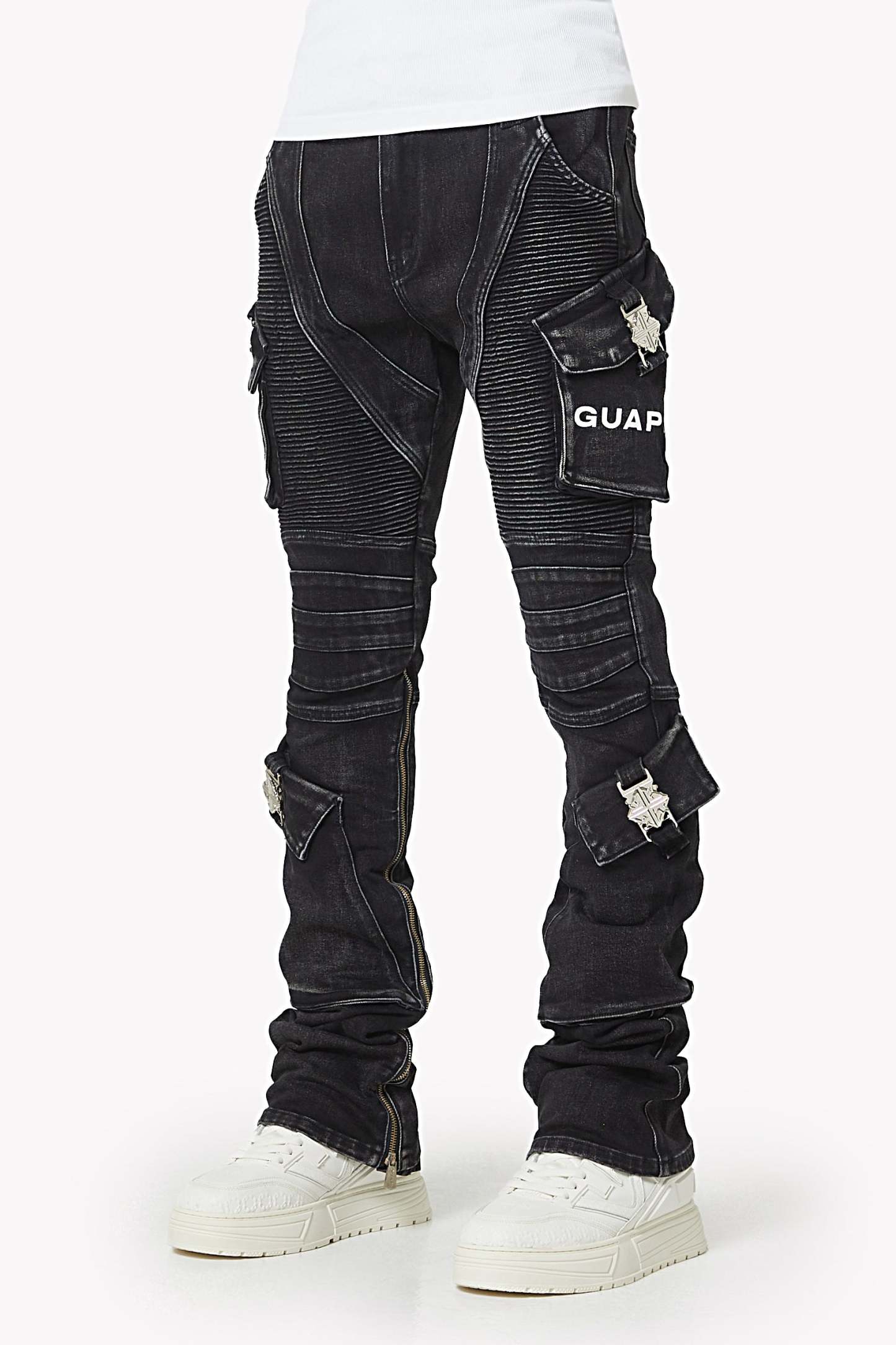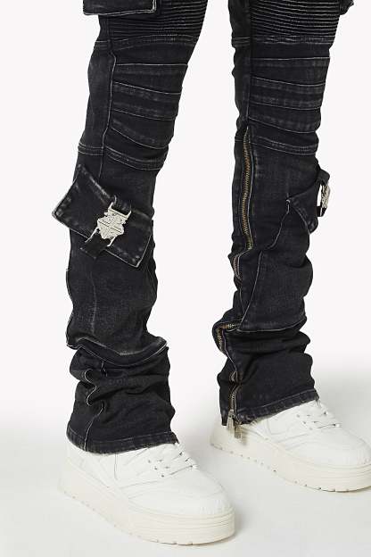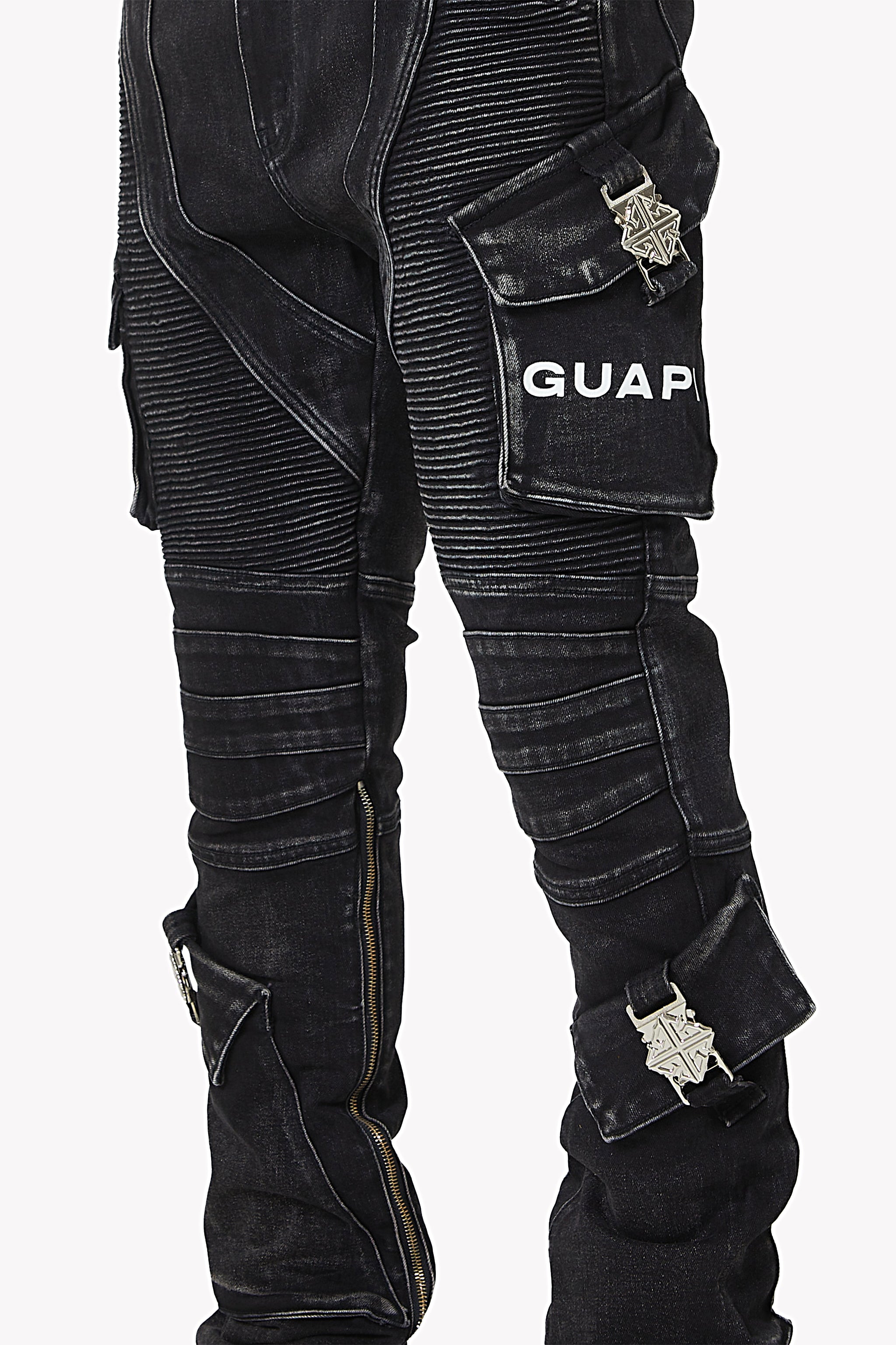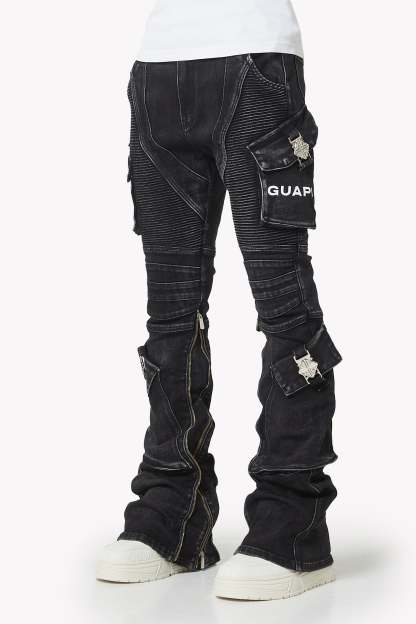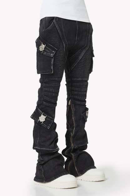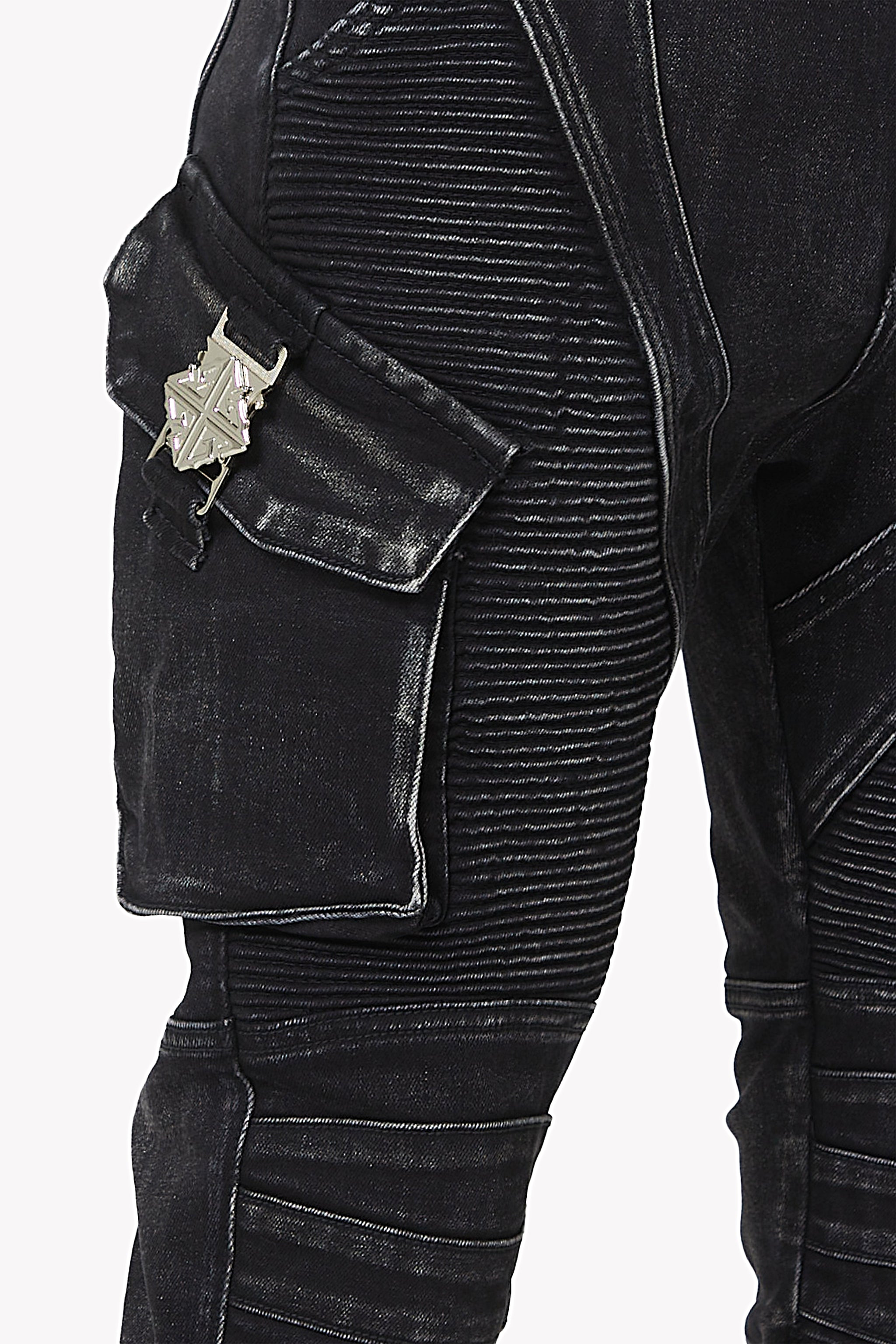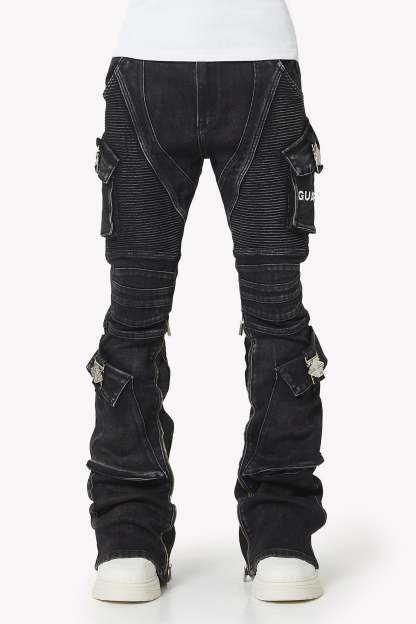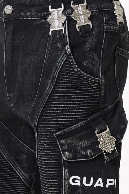 A bold upgrade to classic biker denim, the Vintage Black Oblivion Biker Denim blends GUAPI’s signature stacked silhouette with heavy moto-inspired detailing. The washed-black finish gives the jeans a lived-in edge, while the intricate ribbed panels and multi-layer seam work add depth, structure, and attitude. Each leg is built with functional cargo pockets and secured with custom silver hardware featuring the GUAPI emblem, giving the piece a premium tactical feel. Zipper openings along the inner leg allow you to control the flare and stacking, letting the denim sit clean over any sneaker or boot.