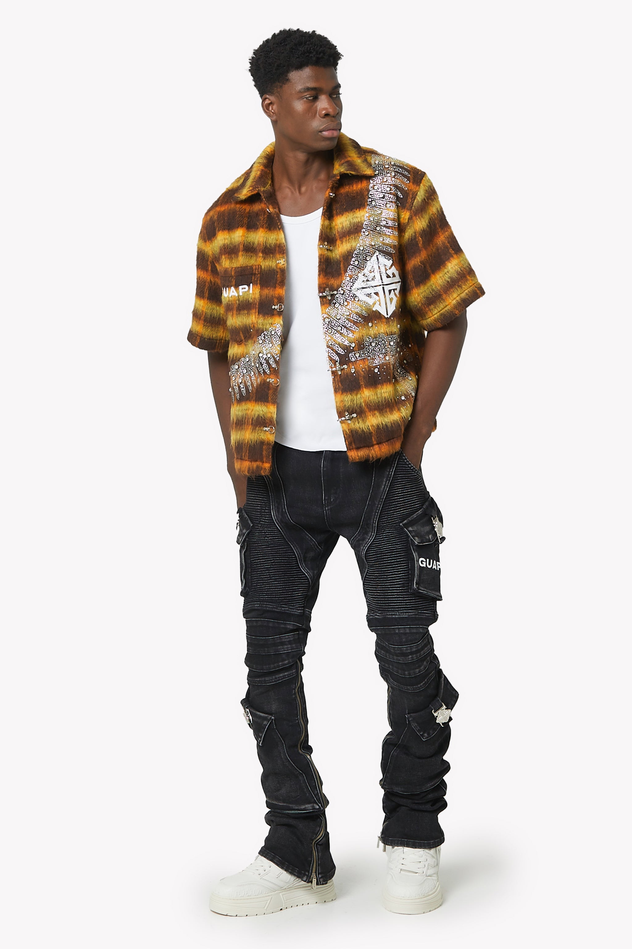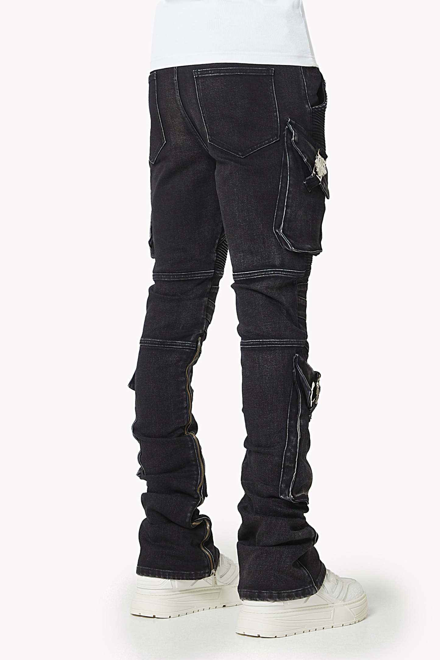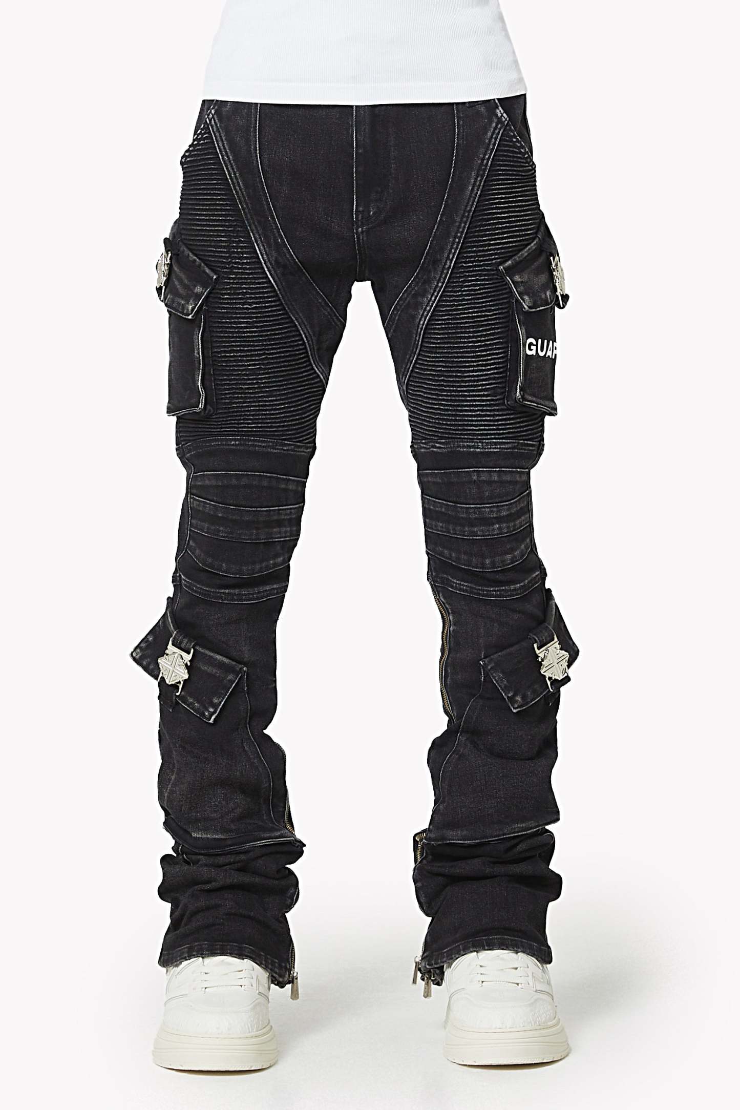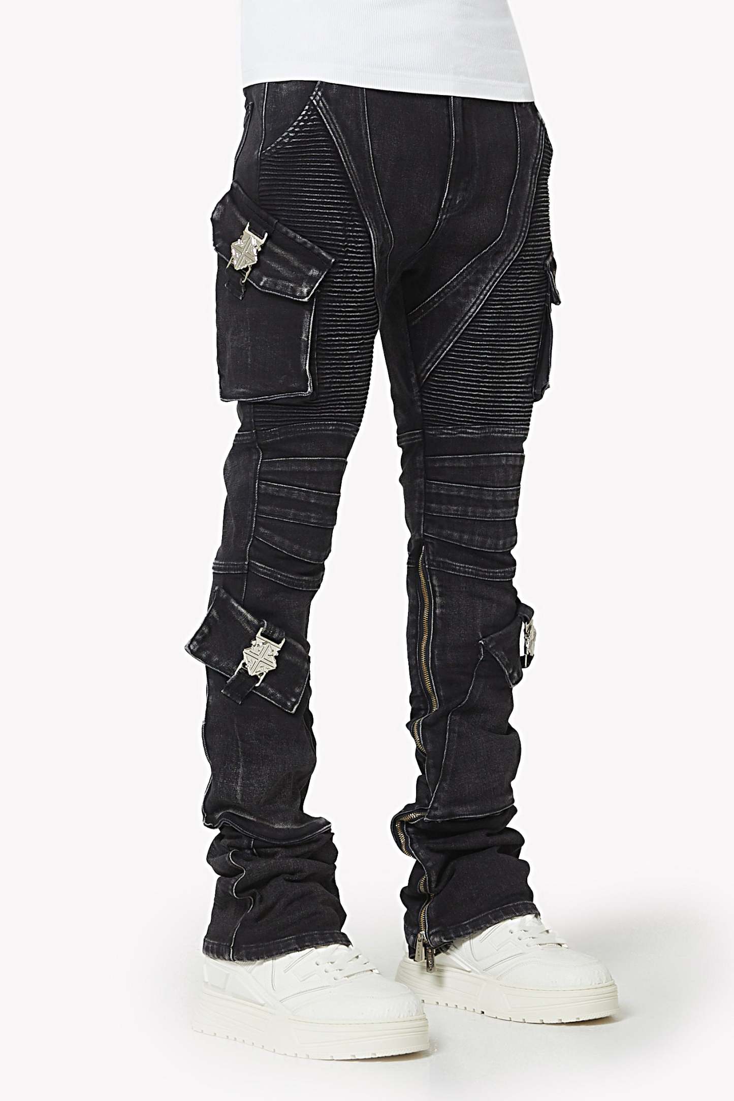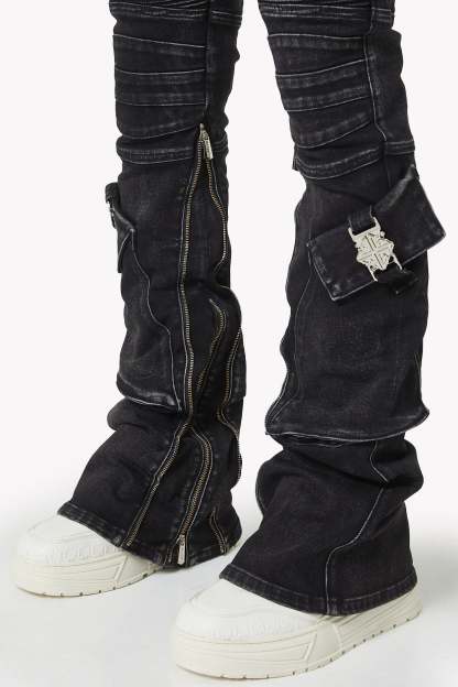 A bold upgrade to classic biker denim, the Vintage Black Oblivion Biker Denim blends GUAPI’s signature stacked silhouette with heavy moto-inspired detailing. The washed-black finish gives the jeans a lived-in edge, while the intricate ribbed panels and multi-layer seam work add depth, structure, and attitude. Each leg is built with functional cargo pockets and secured with custom silver hardware featuring the GUAPI emblem, giving the piece a premium tactical feel. Zipper openings along the inner leg allow you to control the flare and stacking, letting the denim sit clean over any sneaker or boot.