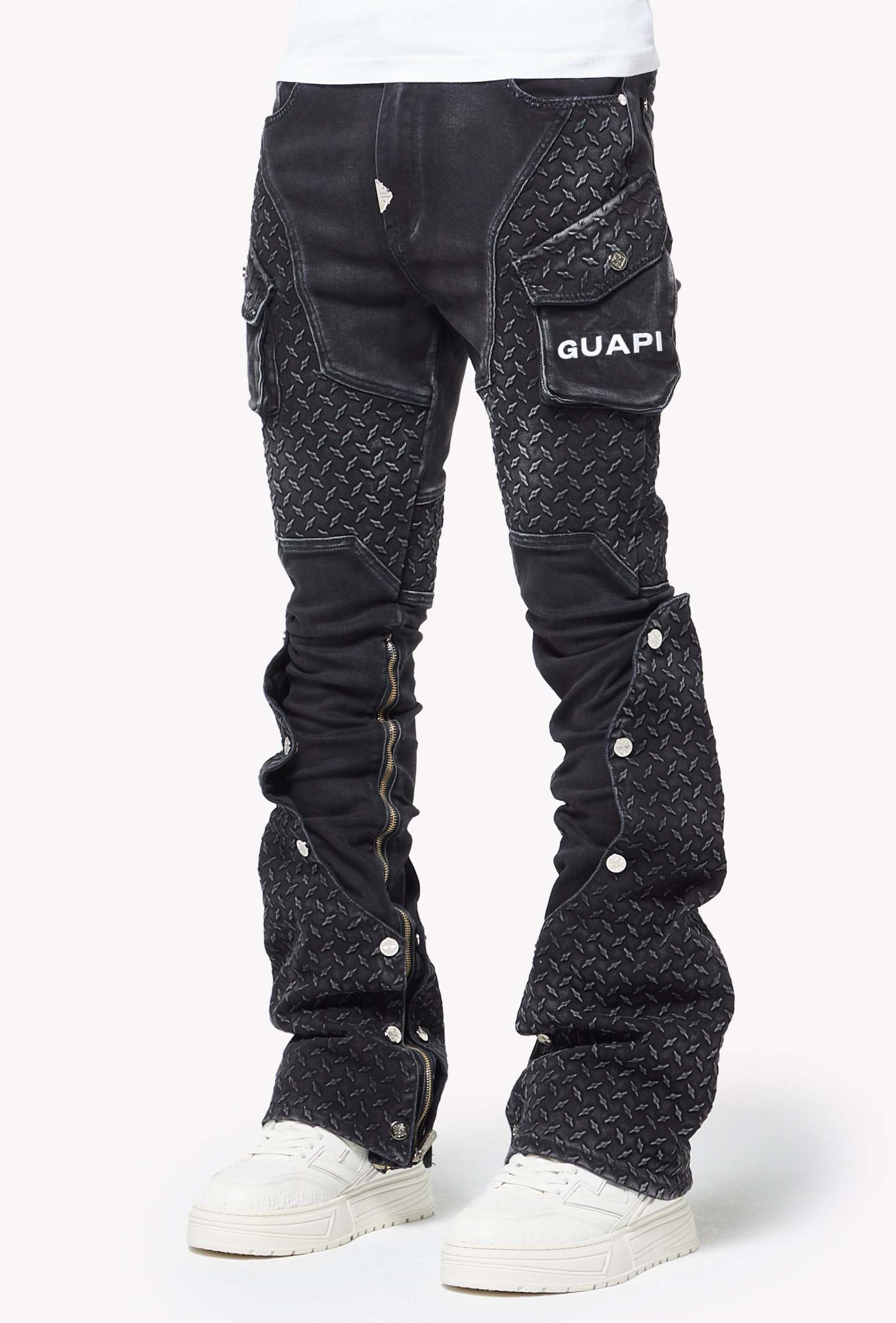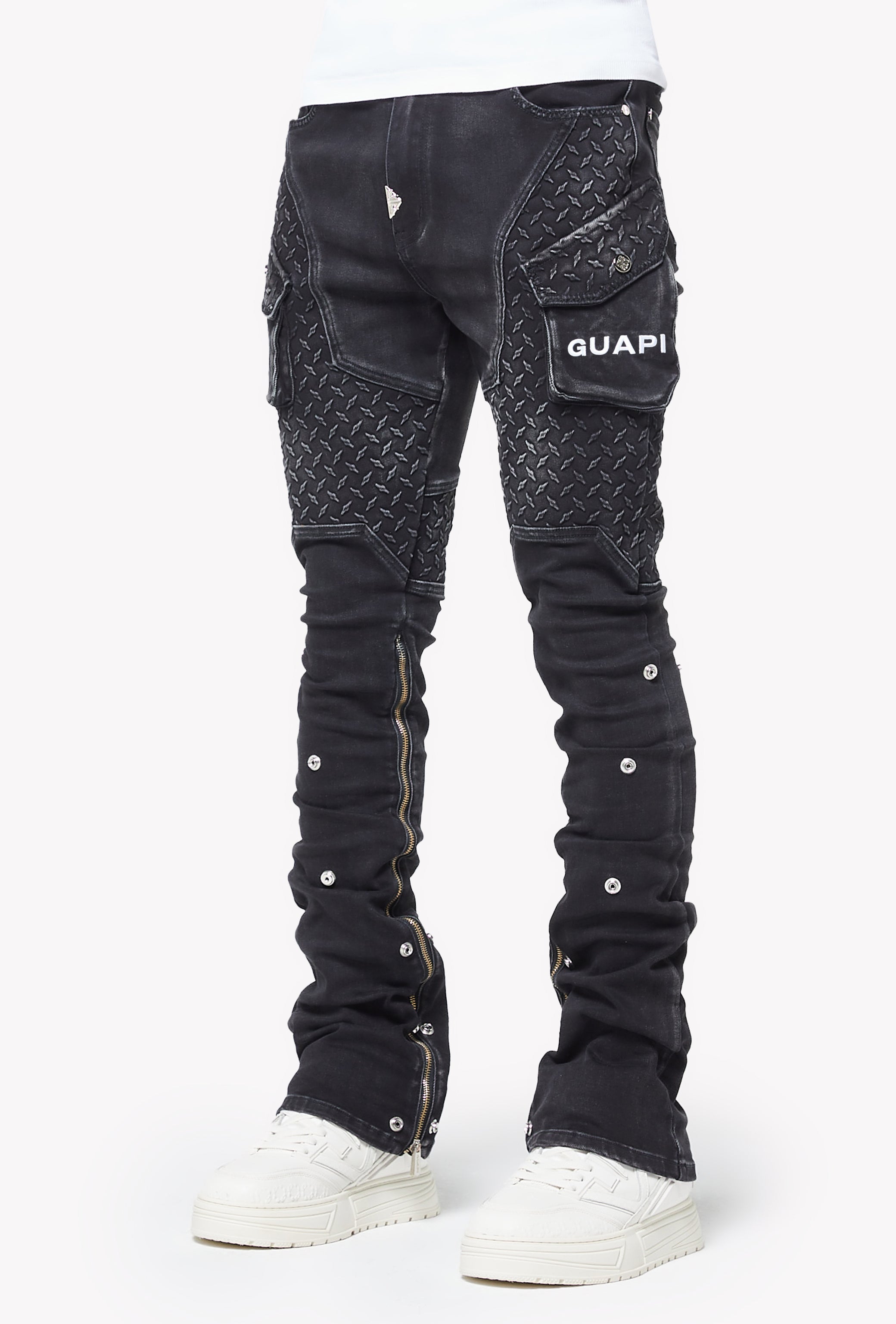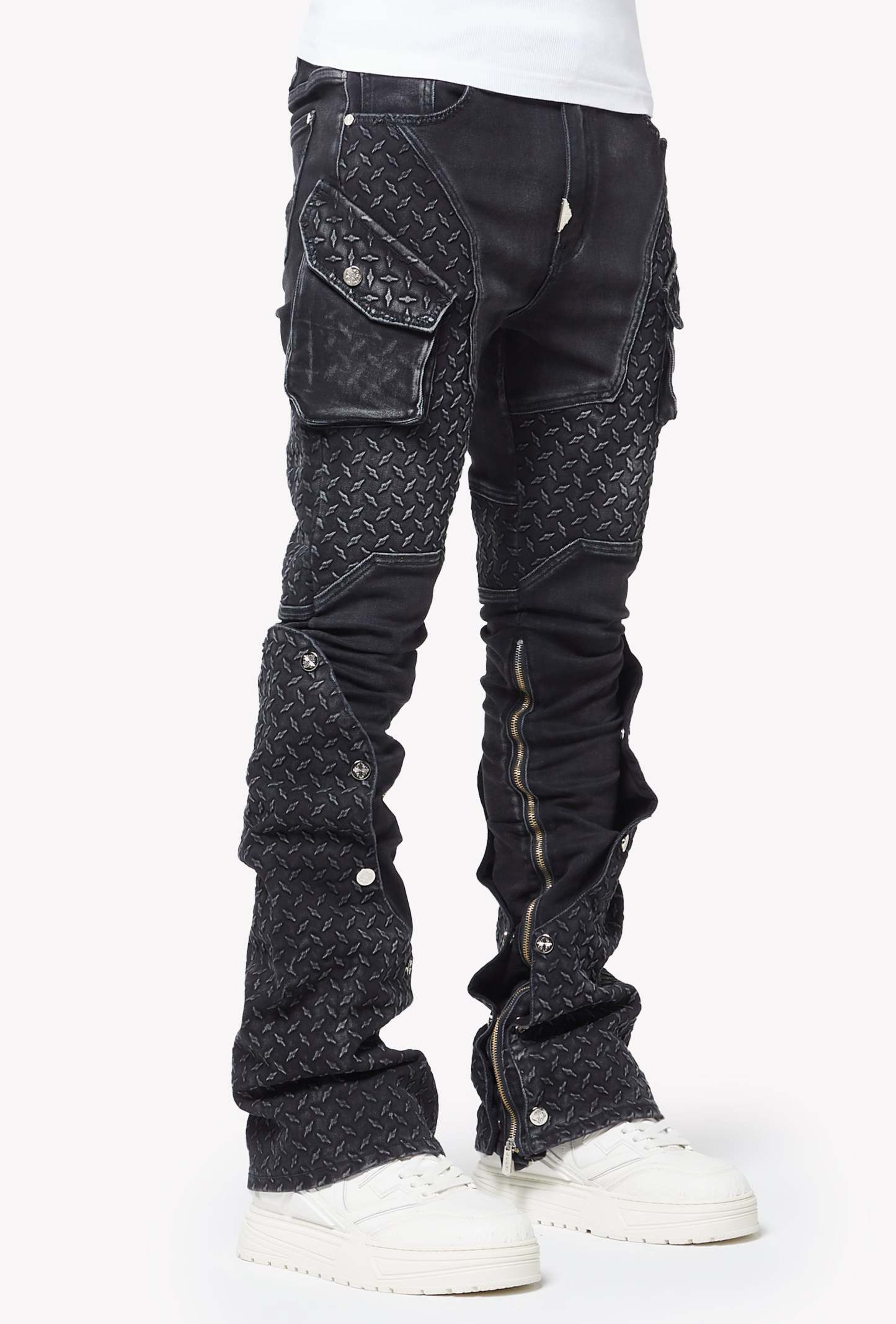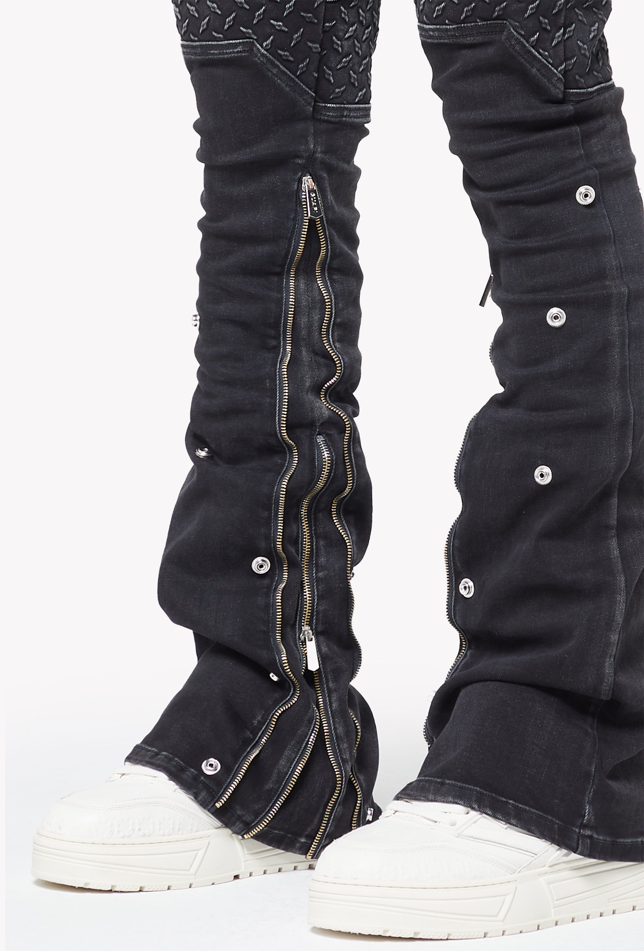 Oversized cargo pockets with distressed flaps enhance the utility aesthetic, while the sculpted seam work gives the jeans a sharp, engineered shape. The stacked-leg construction, paired with full-length outer zippers and snap-button details, allows the wearer to customize the silhouette, whether kept slim or opened for a more flared, layered effect.