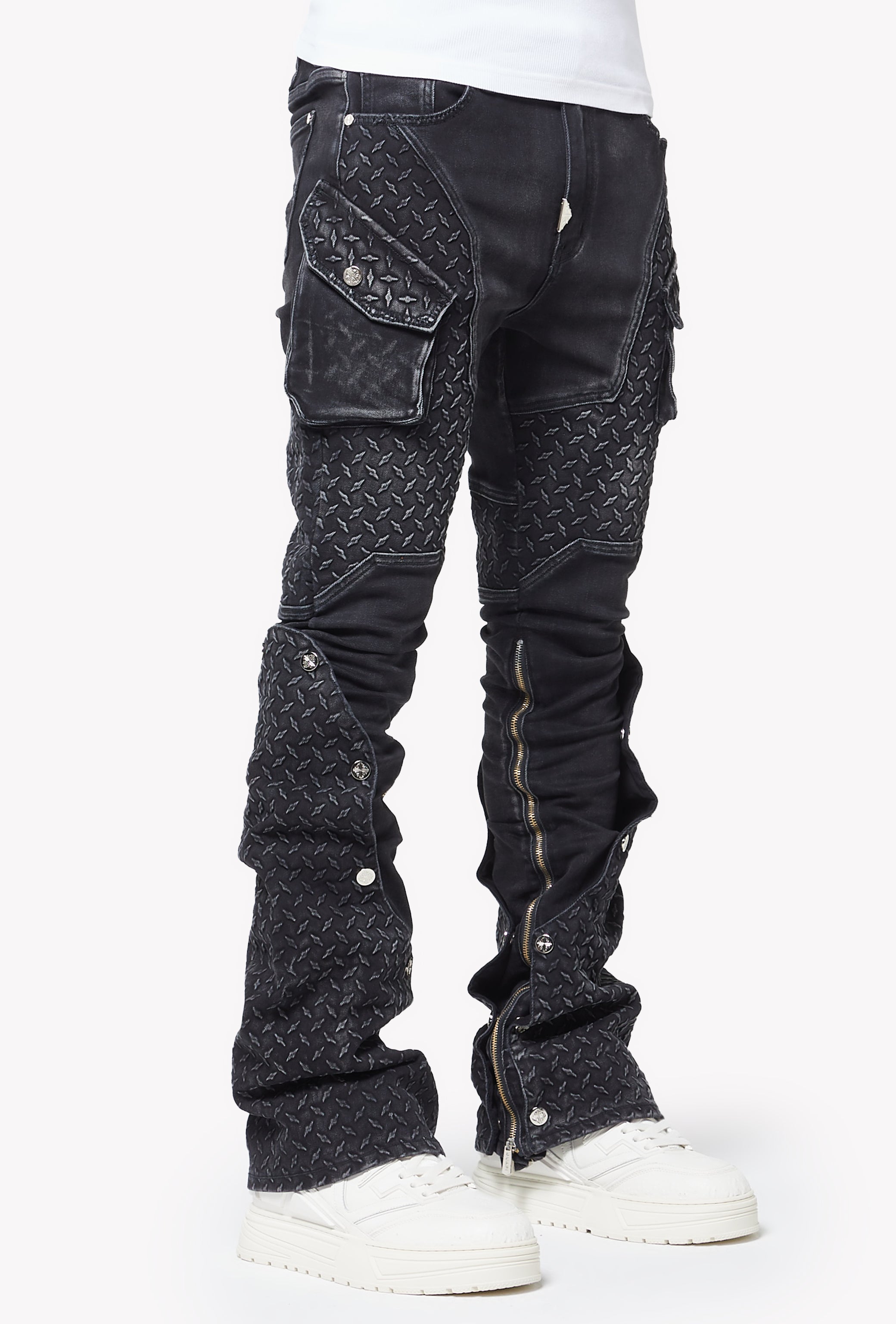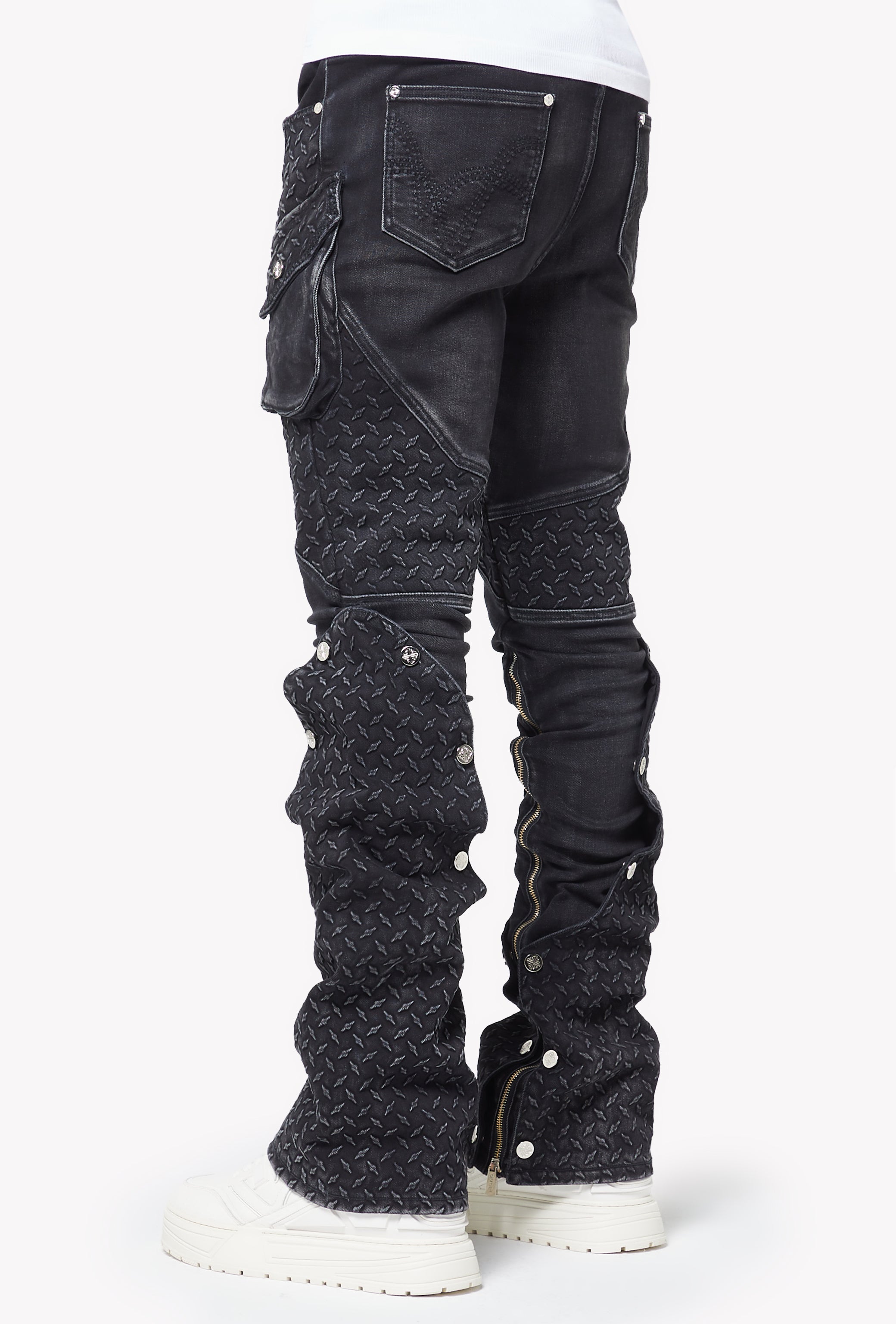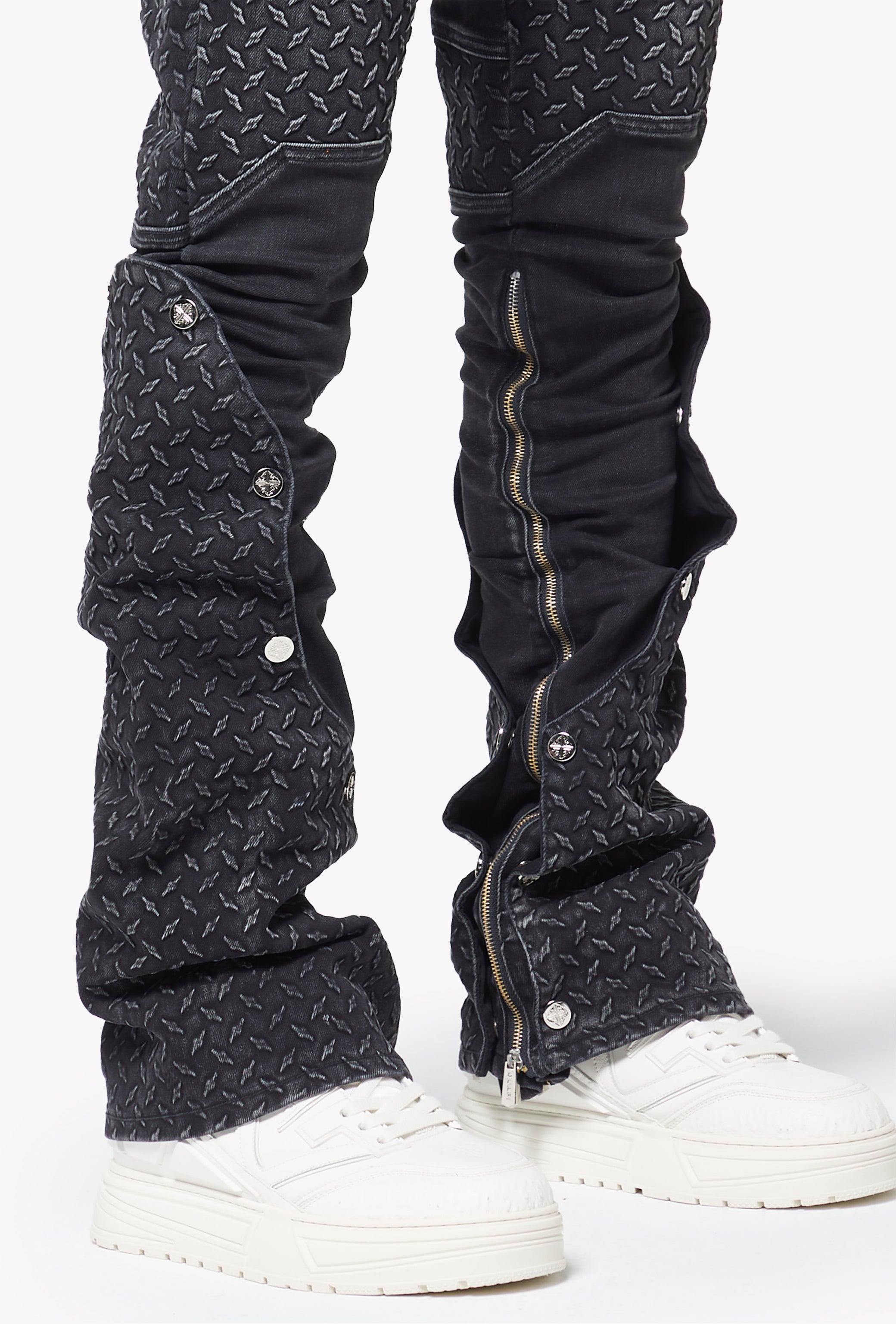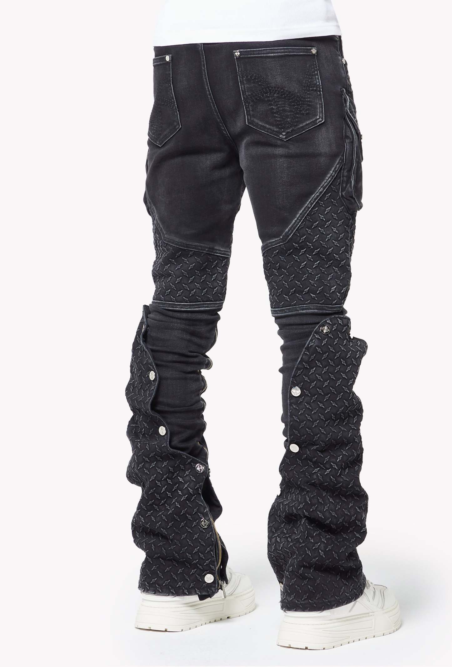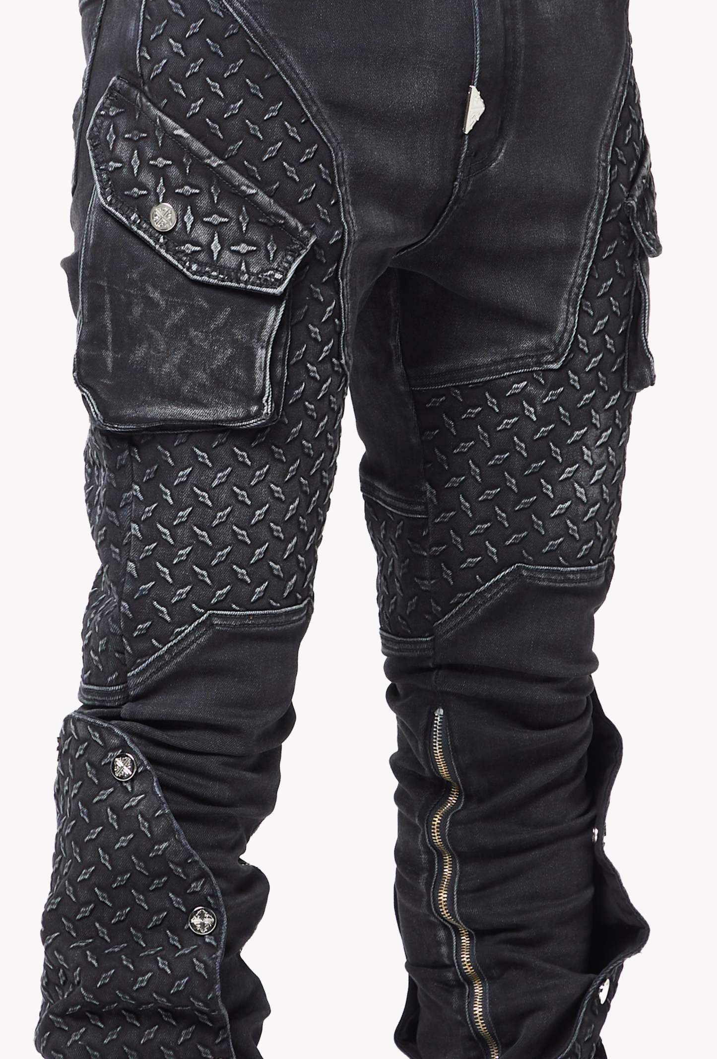Vintage black washed denim with industrial-inspired tread-plate textured panels