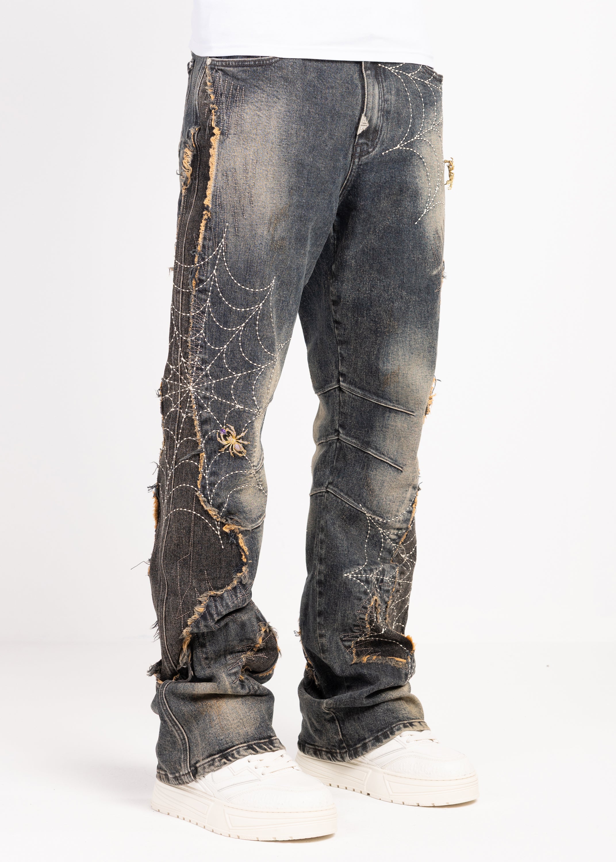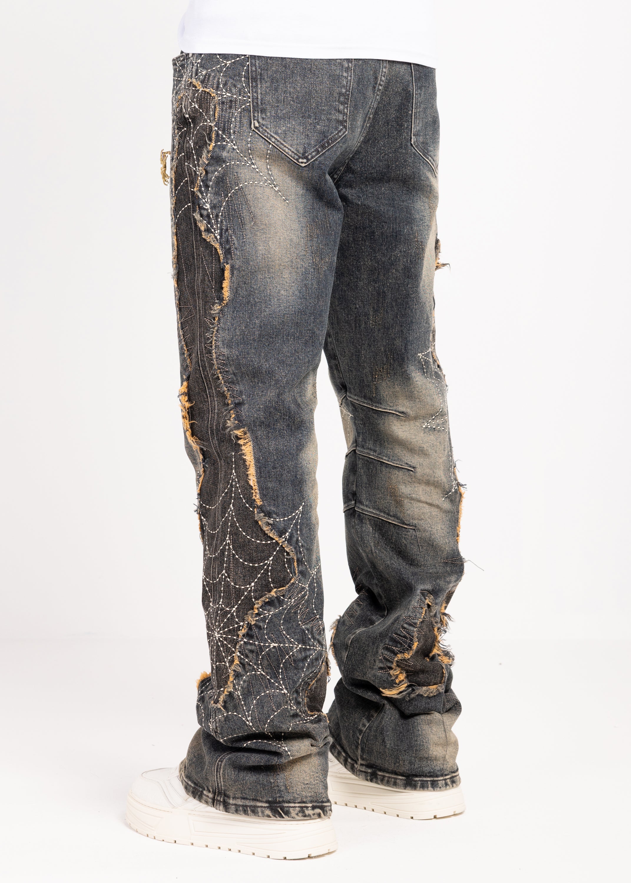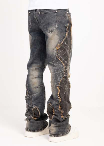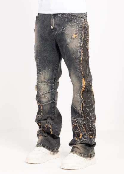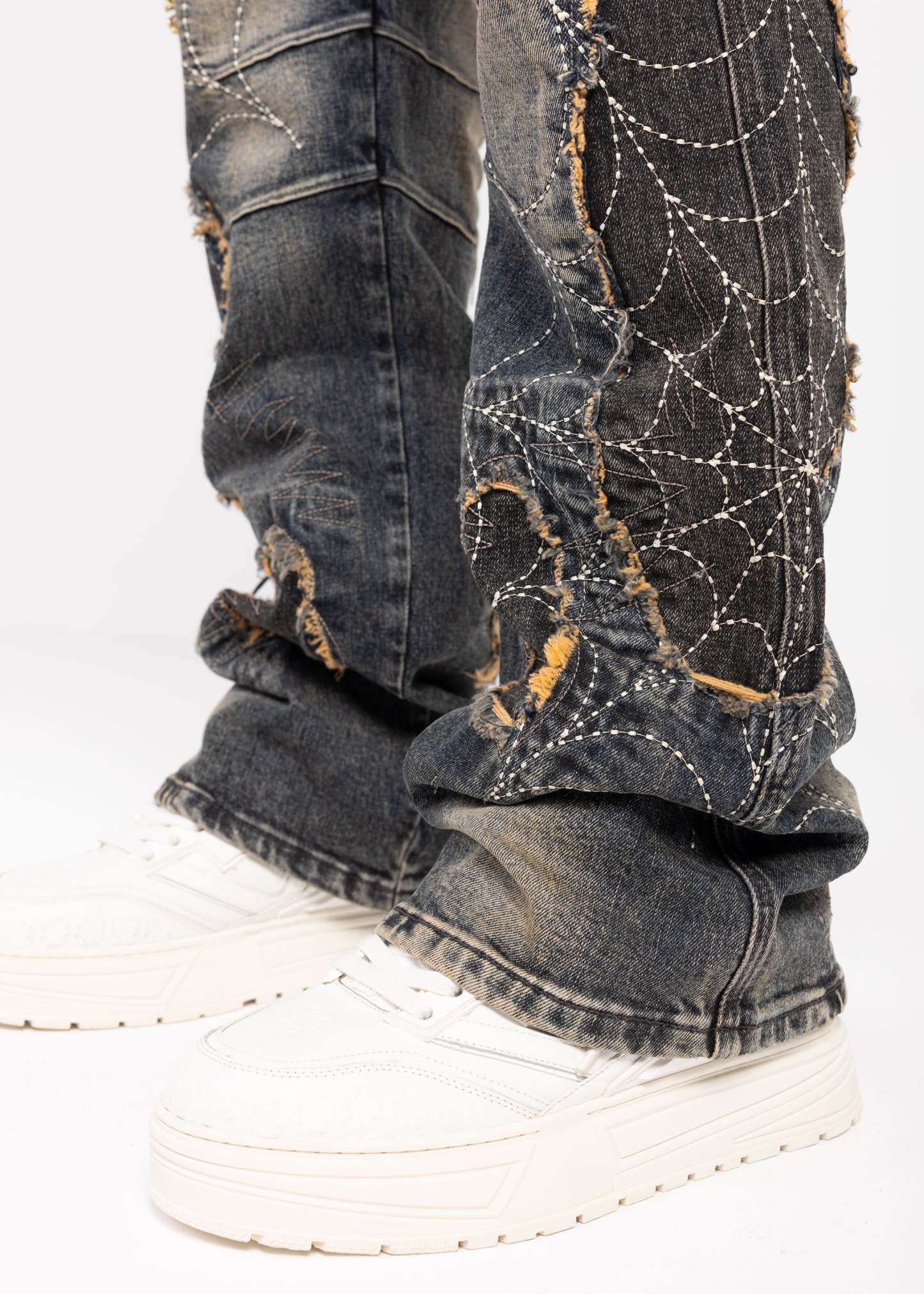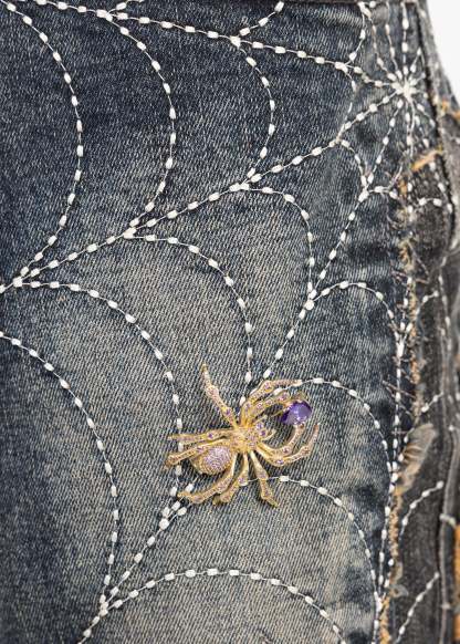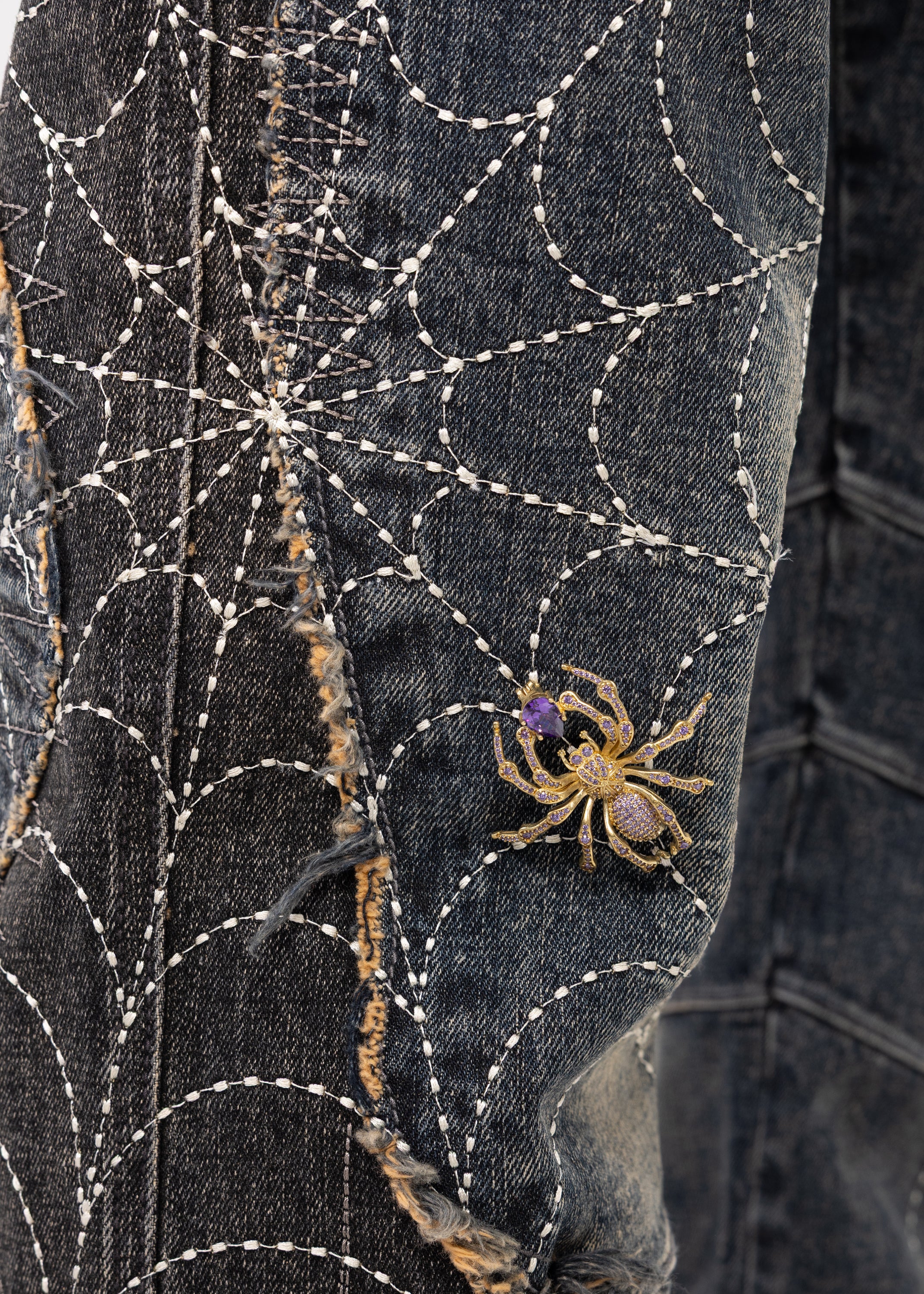 Channel dark-romantic edge with these Vintage Black Widow Denim jeans. Cut from rigid, vintage-finished denim in a sun-faded black wash, they pair signature spiderweb embroidery with purposefully distressed seams and raw-edge patchwork for an heirloom-meets-rebel look. A removable jewel-encrusted spider brooch adds a luxe finishing touch you can wear or remove to change the vibe.