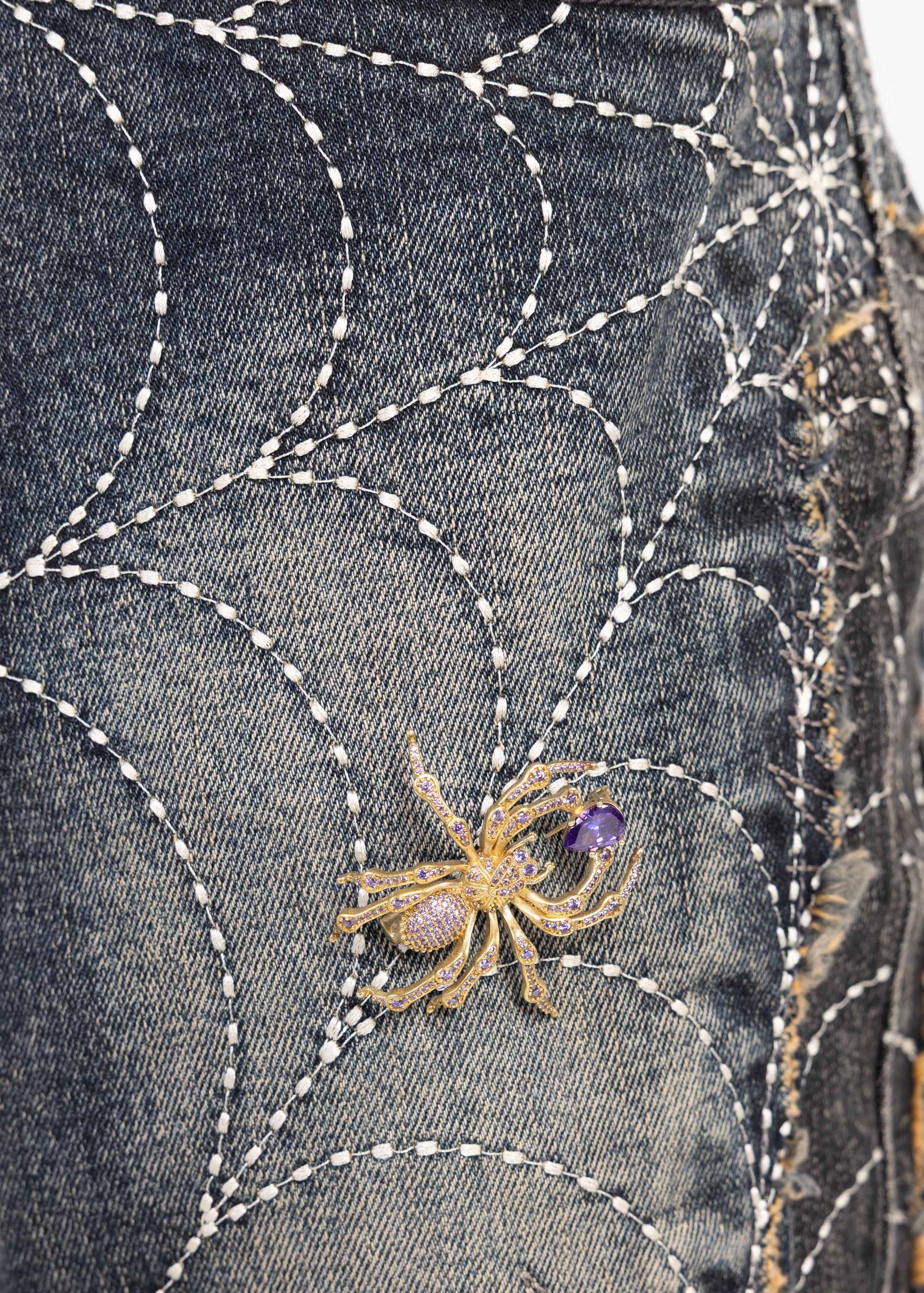 Wear with a crisp white tee and chunky sneakers for street-ready contrast, or dress up with a leather jacket and boots for night looks. The removable spider brooch makes these jeans as adaptable as they are eye-catching—leave it on to amplify the drama or remove it for a subtler, distressed aesthetic.