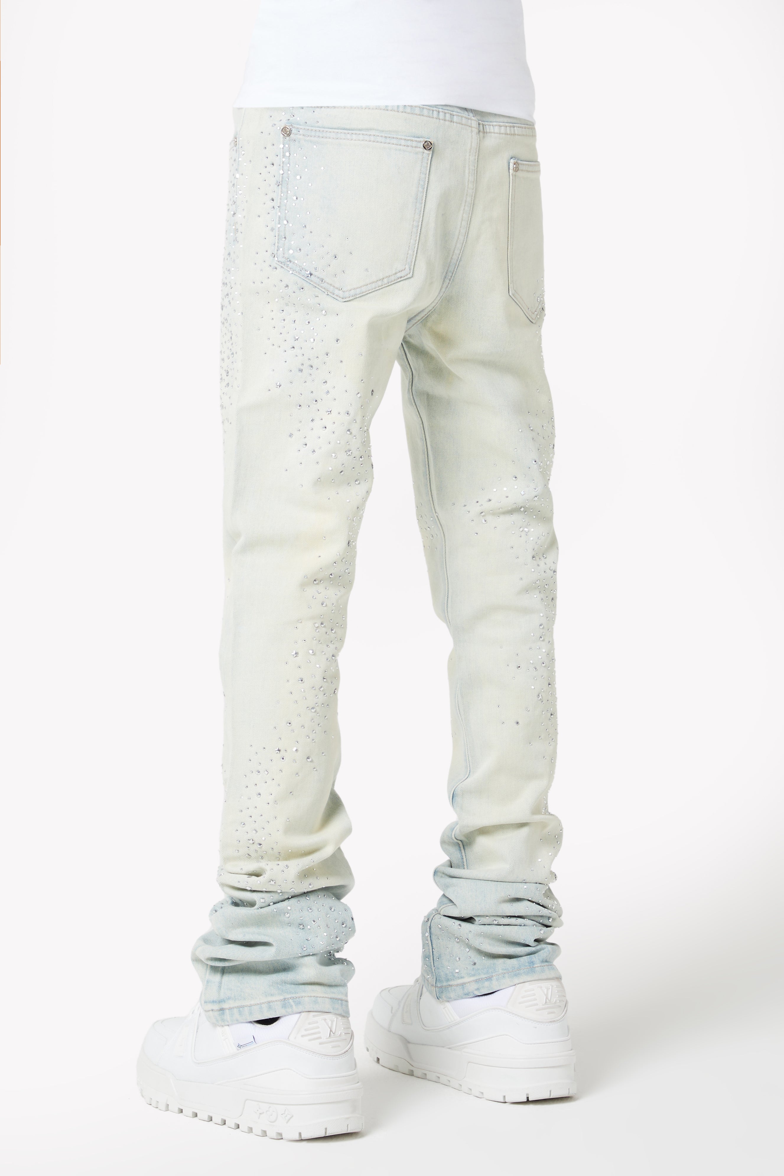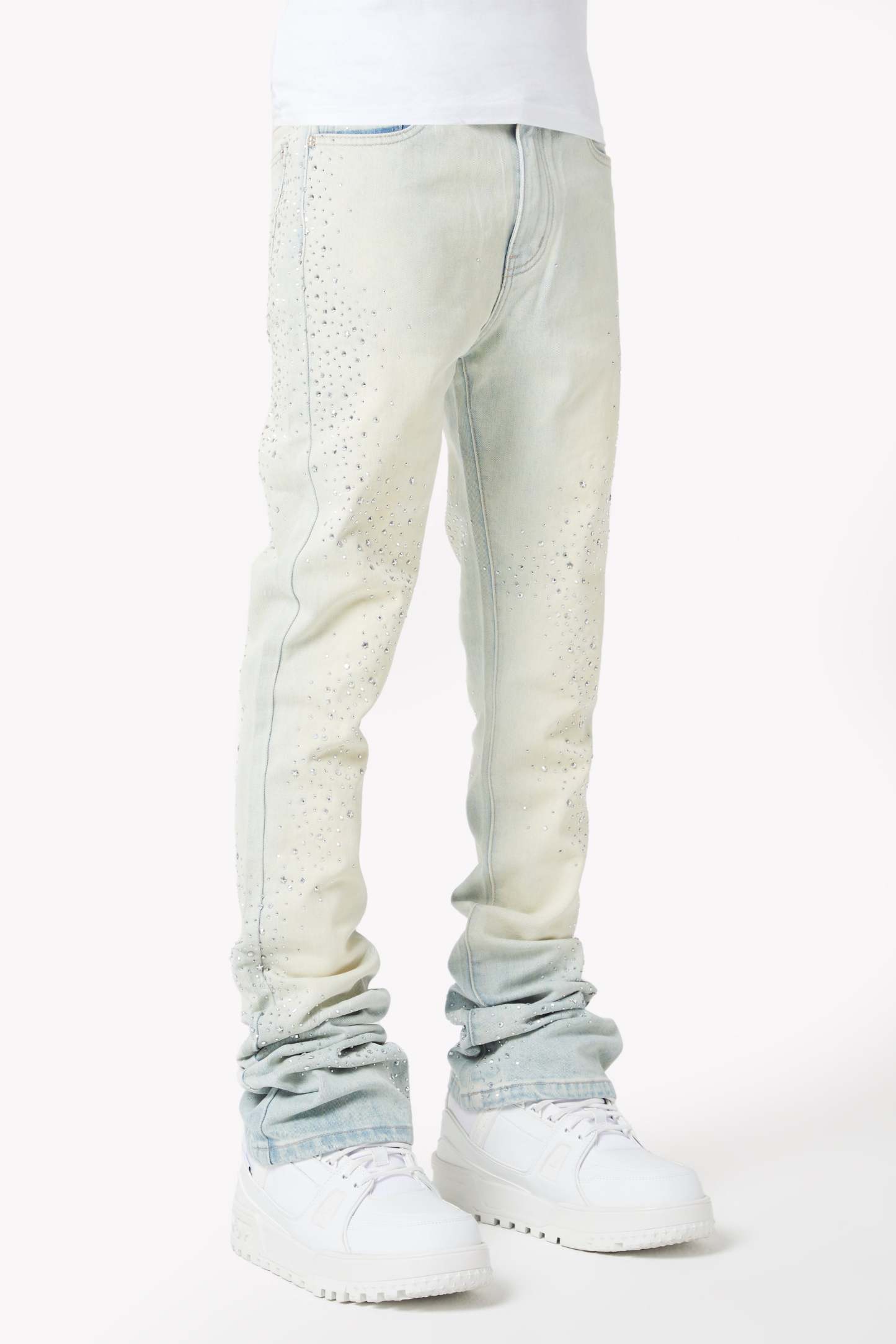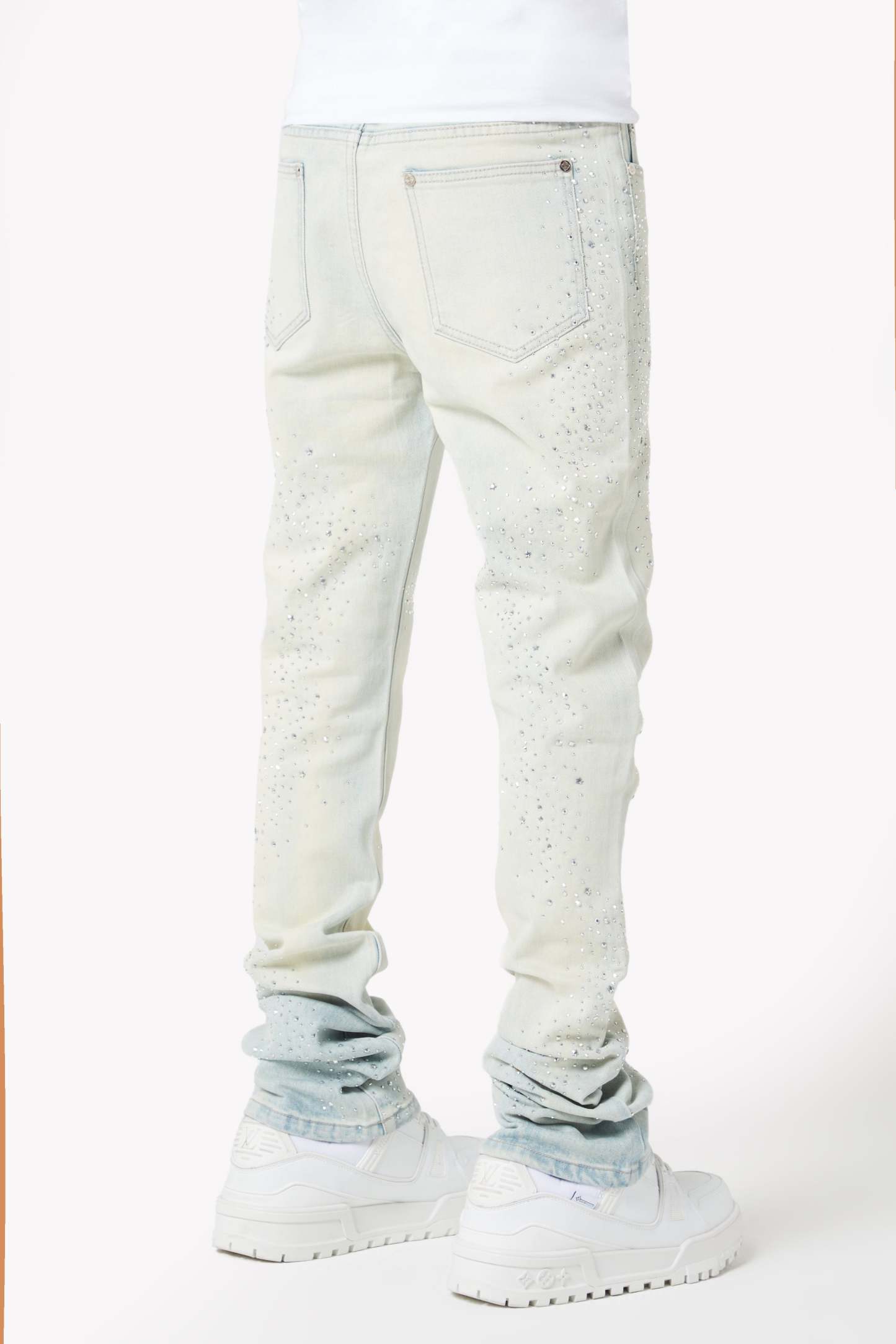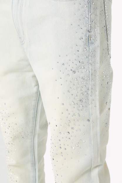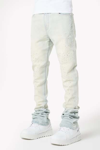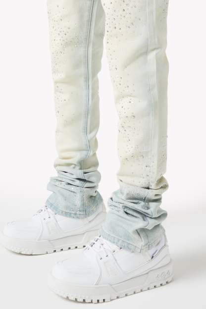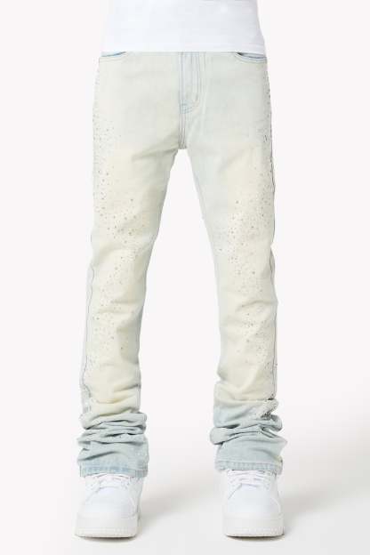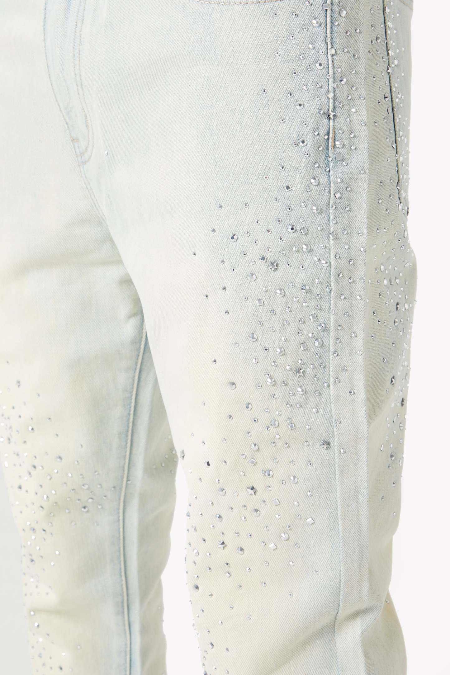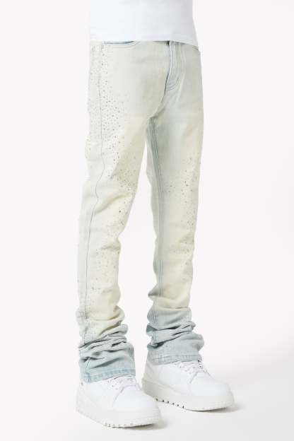 Step into celestial streetwear with the Vintage Blue Starry Sky Denim, a piece that captures the essence of cosmic style. Featuring a soft gradient wash in a dreamy vintage blue tone, these jeans are artfully adorned with scattered crystal embellishments that twinkle like distant stars. Perfect for those who want to elevate their denim game while keeping it versatile and wearable. The stacked silhouette adds that signature GUAPI edge, balancing luxury with laid-back cool.