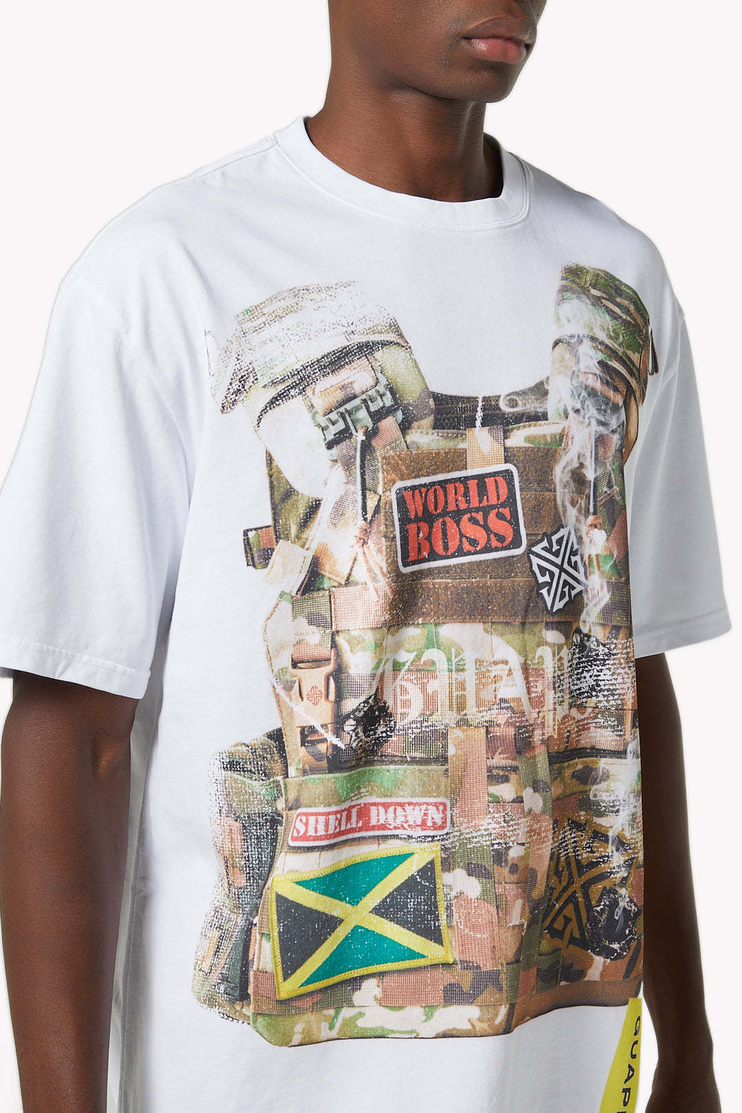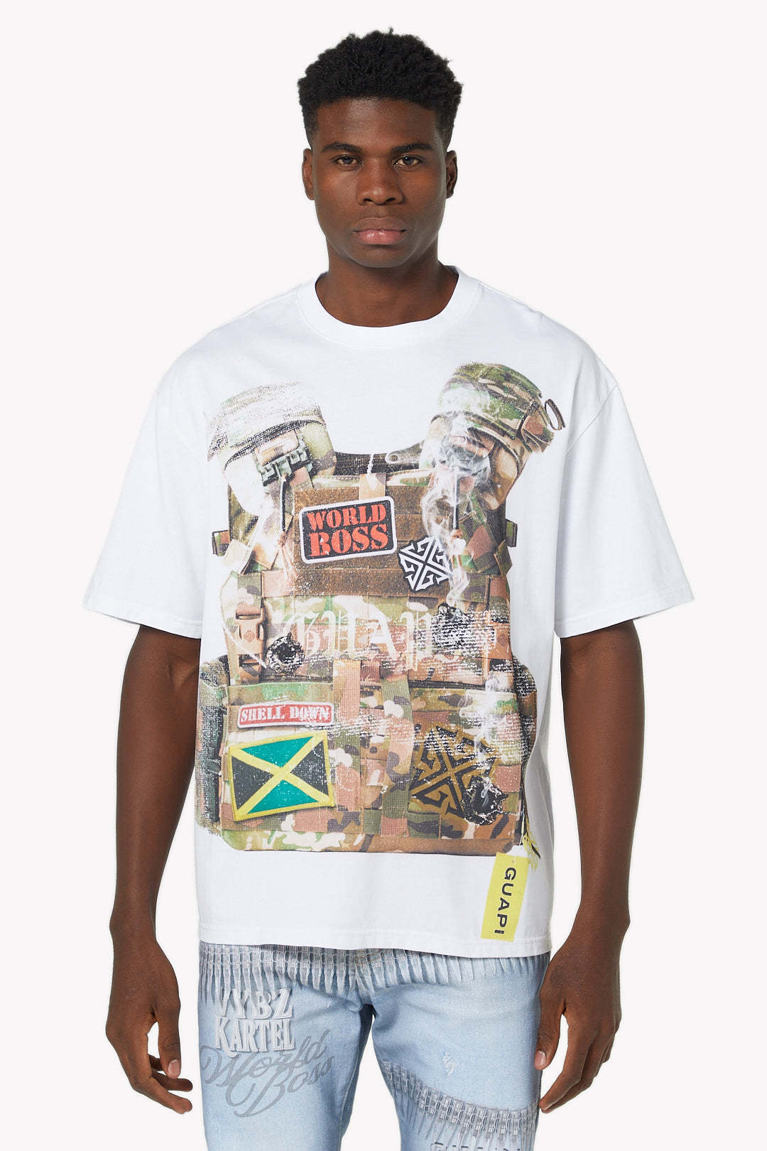 The White Commandment Tee makes a bold statement with its striking graphic design and oversized silhouette. Crafted from premium cotton in a clean white base, the tee showcases a layered front graphic that mimics a tactical vest, complete with camouflage textures, smoke details, and symbolic patches. Among the standout elements are the "World Boss" badge, the Jamaican flag, and the Guapi insignia, all of which pay homage to identity, power, and cultural pride. The yellow woven Guapi label on the hem adds a final branded detail to the piece.