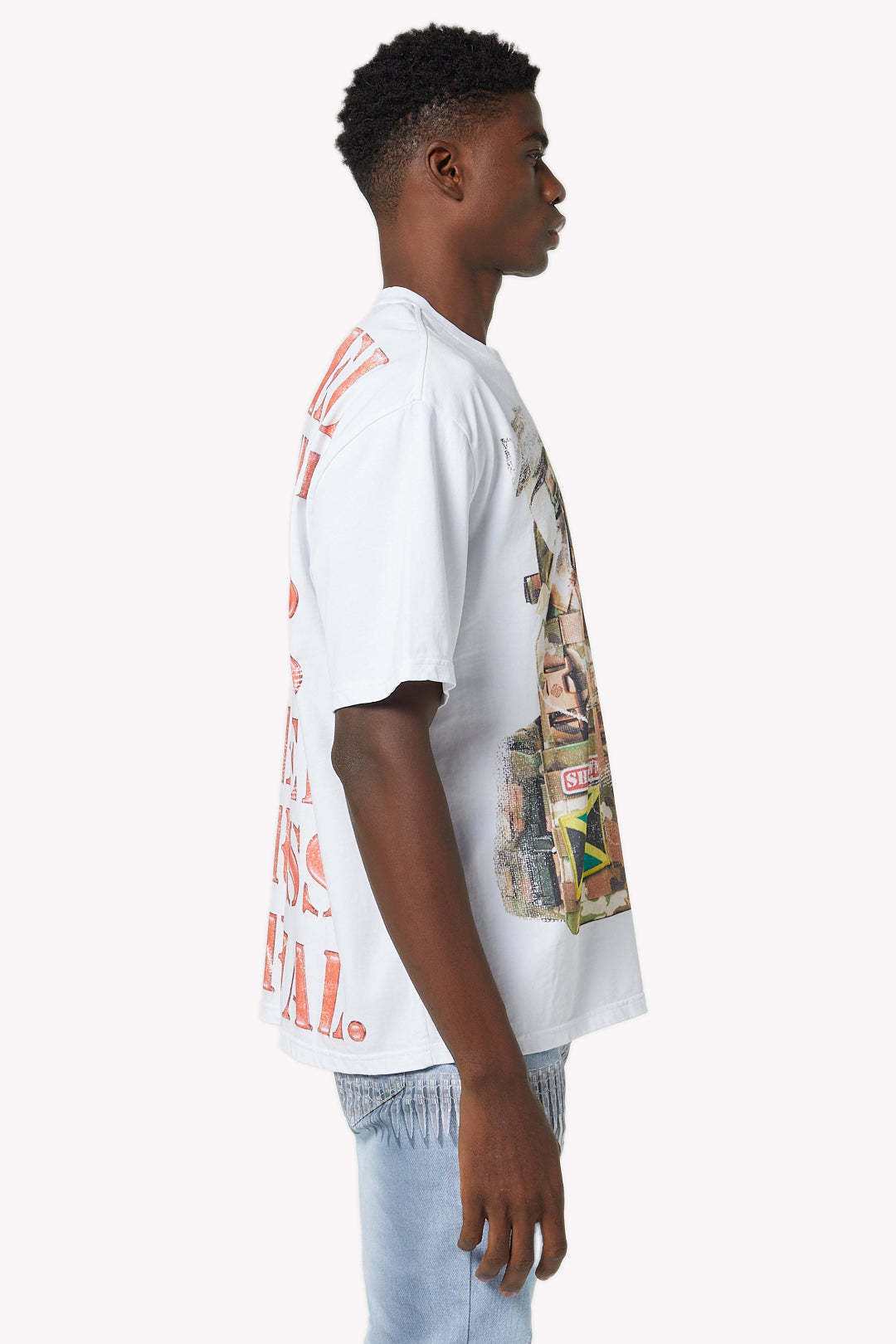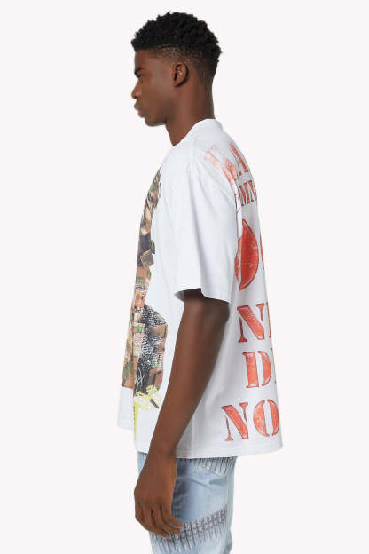 The tee is cut in a relaxed, boxy fit, creating an effortless streetwear silhouette that balances comfort with attitude.
