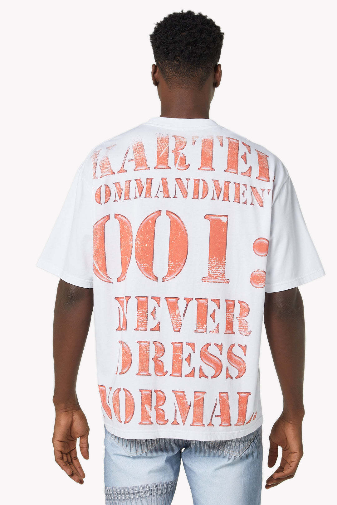 - Back print in bold red stencil font reading: "KARTEL COMMANDMENT 001: NEVER DRESS NORMAL"