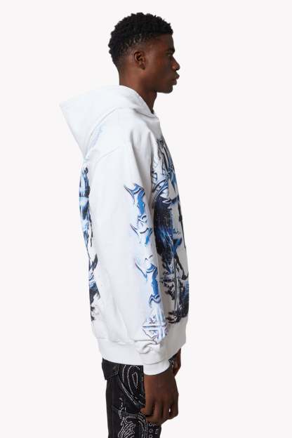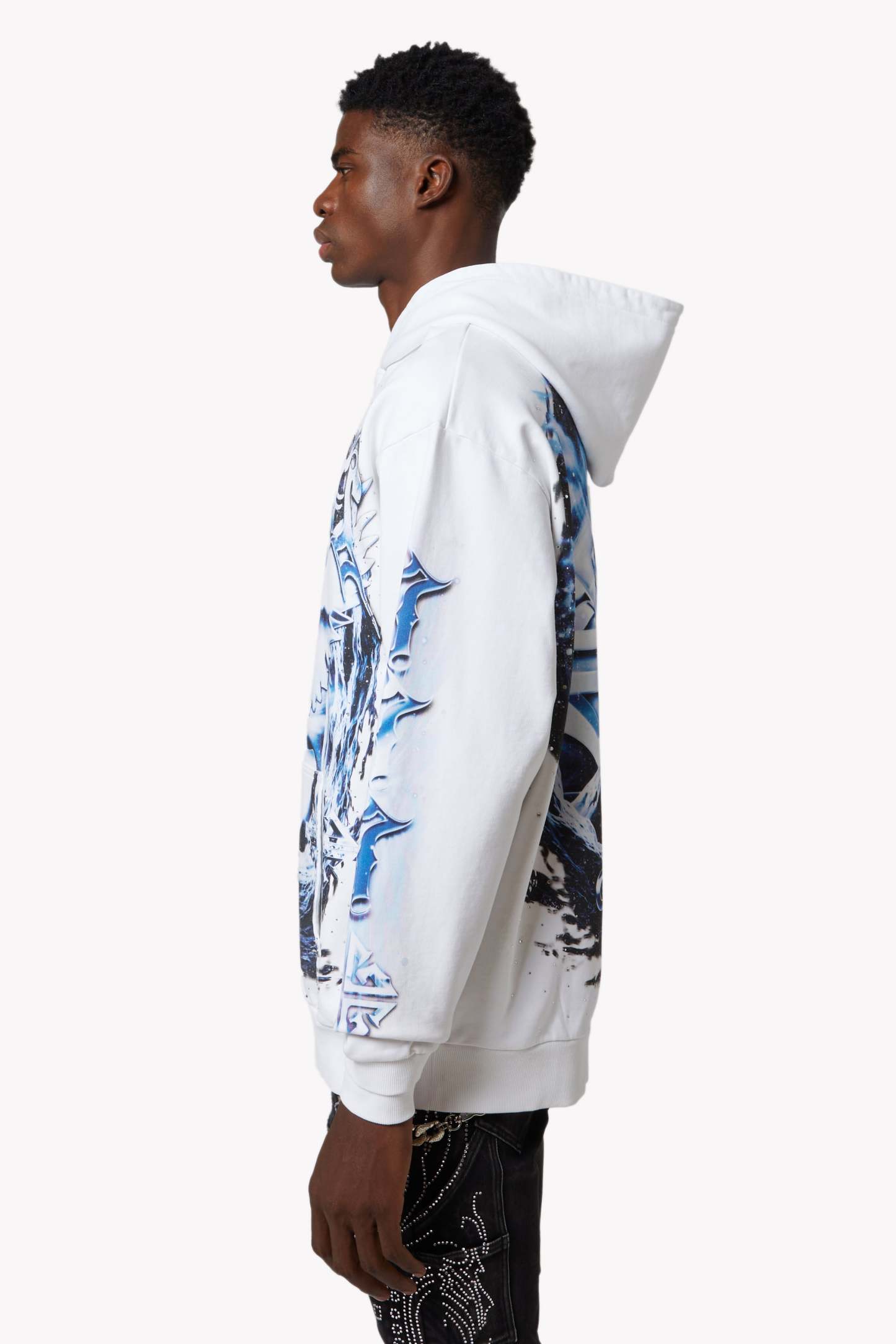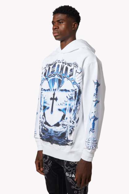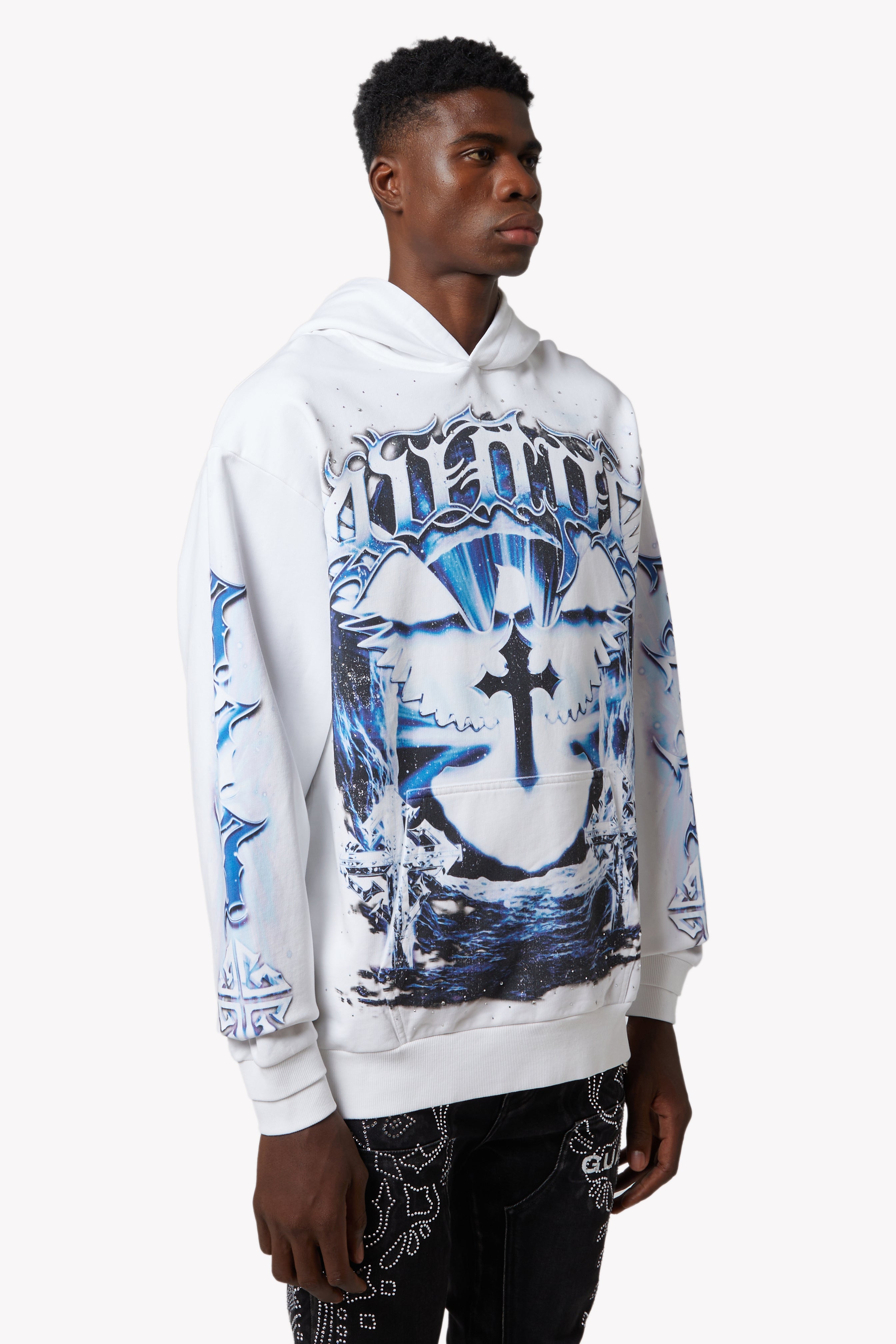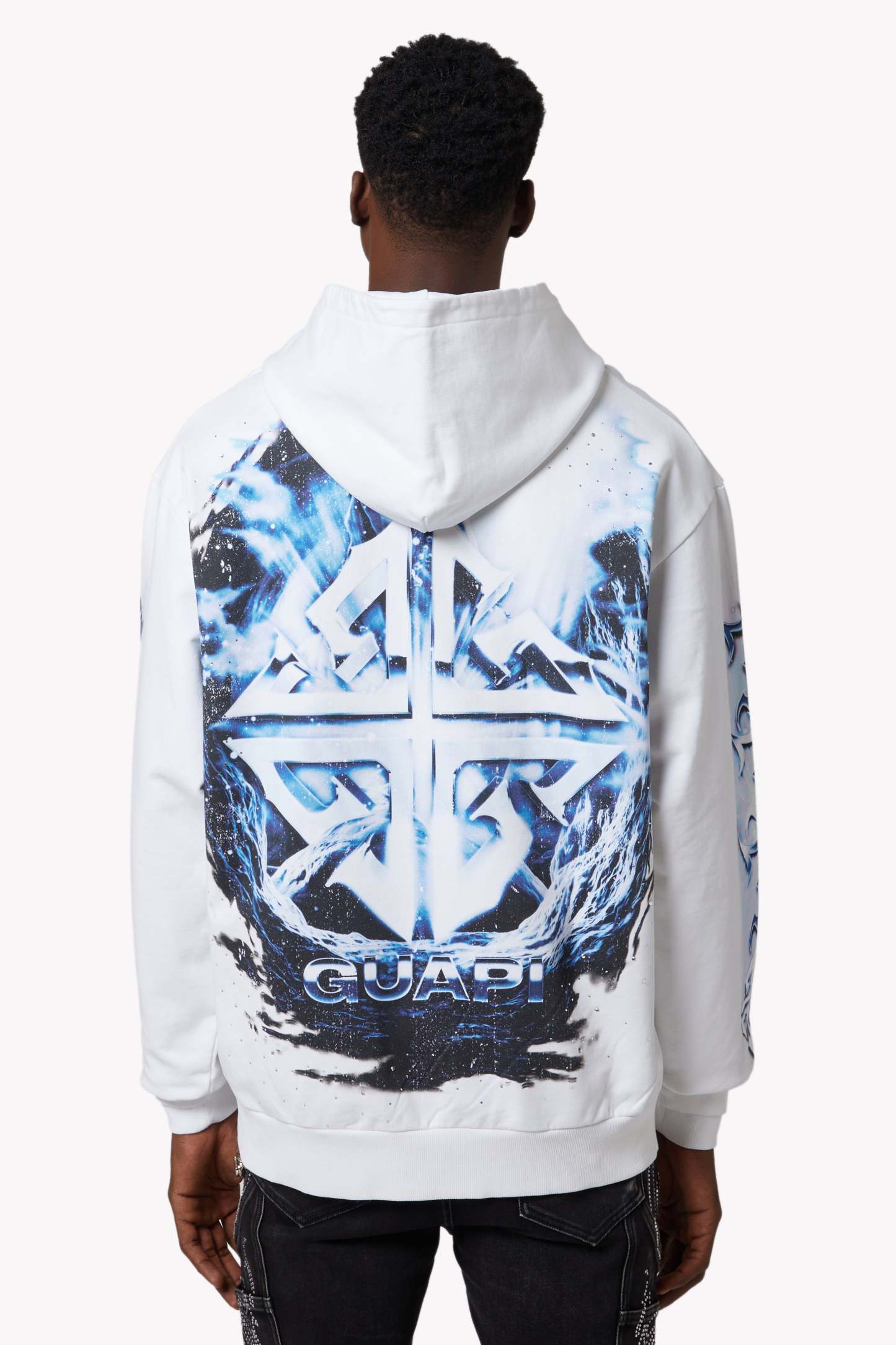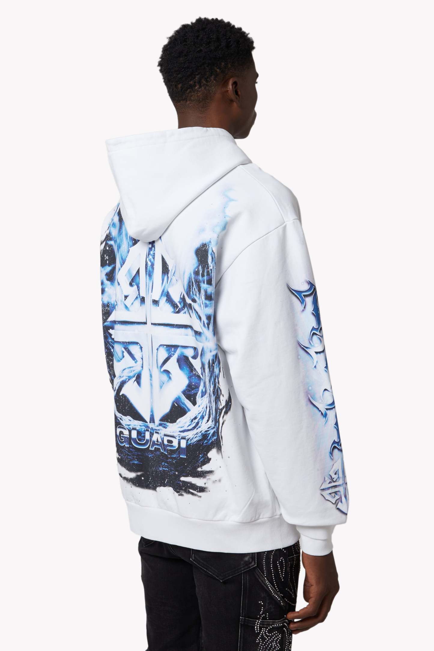 A bold evolution of GUAPI's signature streetwear DNA, the White Heavens Vault Hoodie V1 channels celestial chaos and high-impact energy through a striking monochrome and electric blue palette. This piece features a symmetrical winged cross motif surrounded by tidal force and gothic flames, screen-printed and layered with crystal embellishments for a textured, futuristic look.
