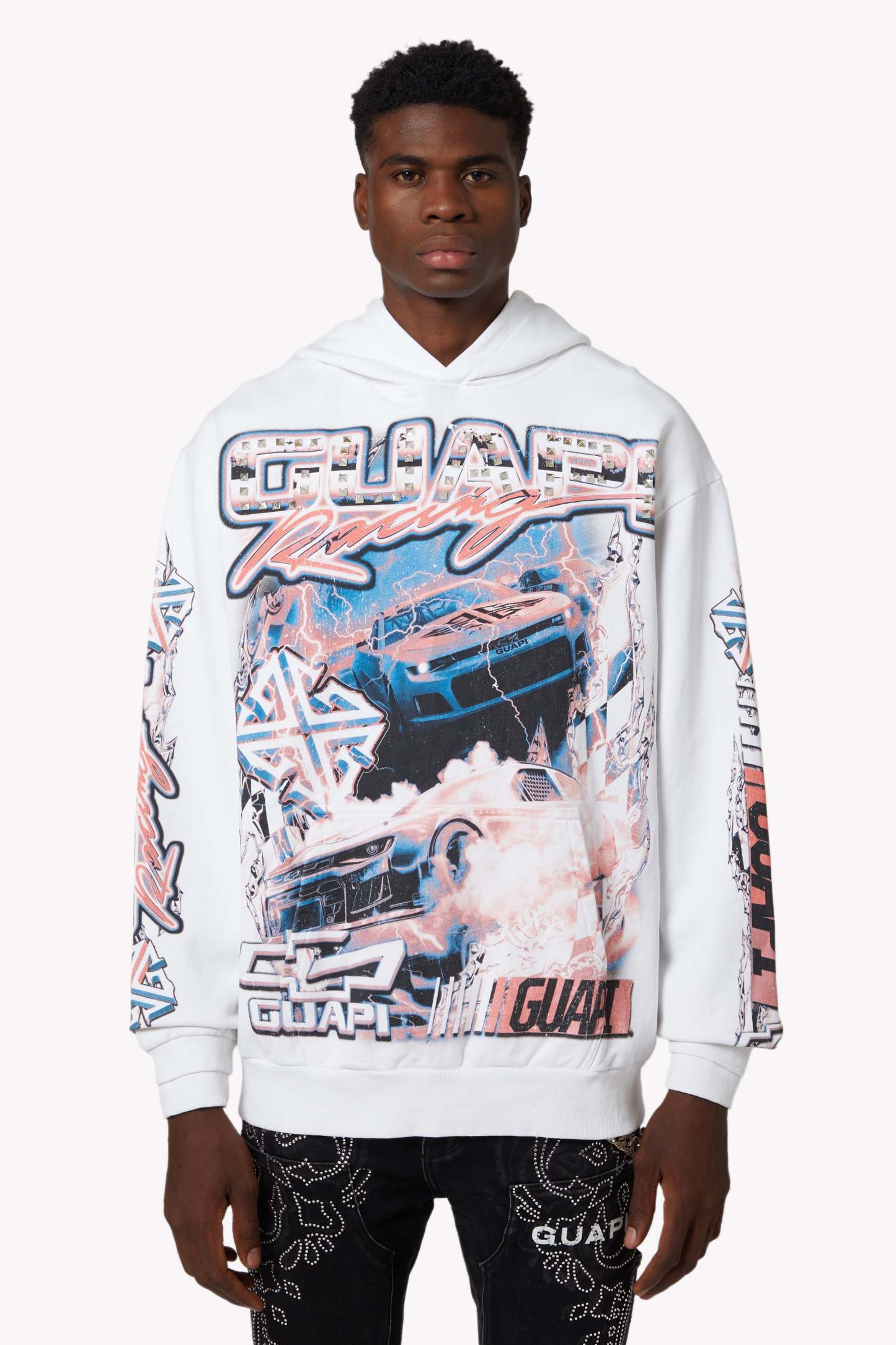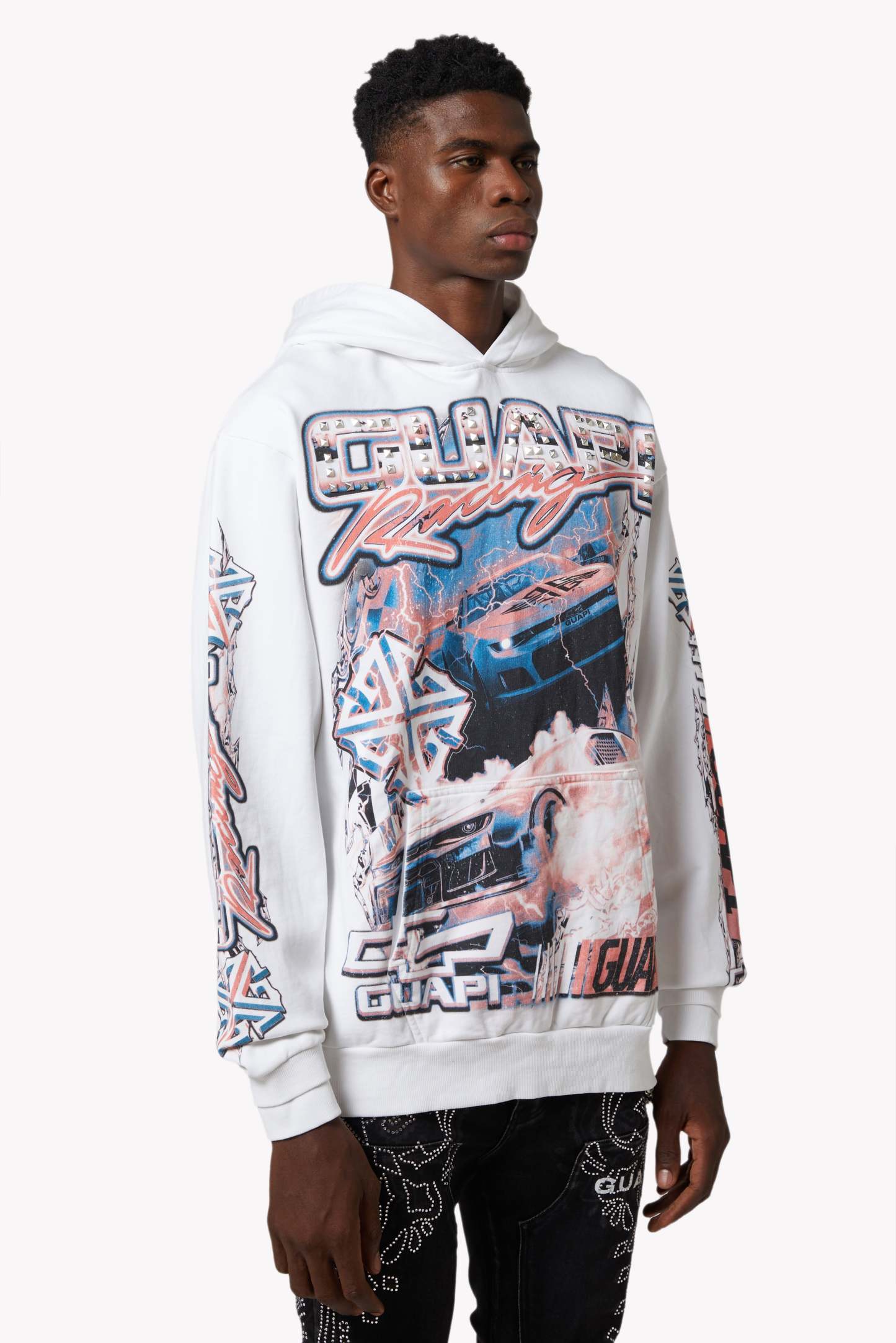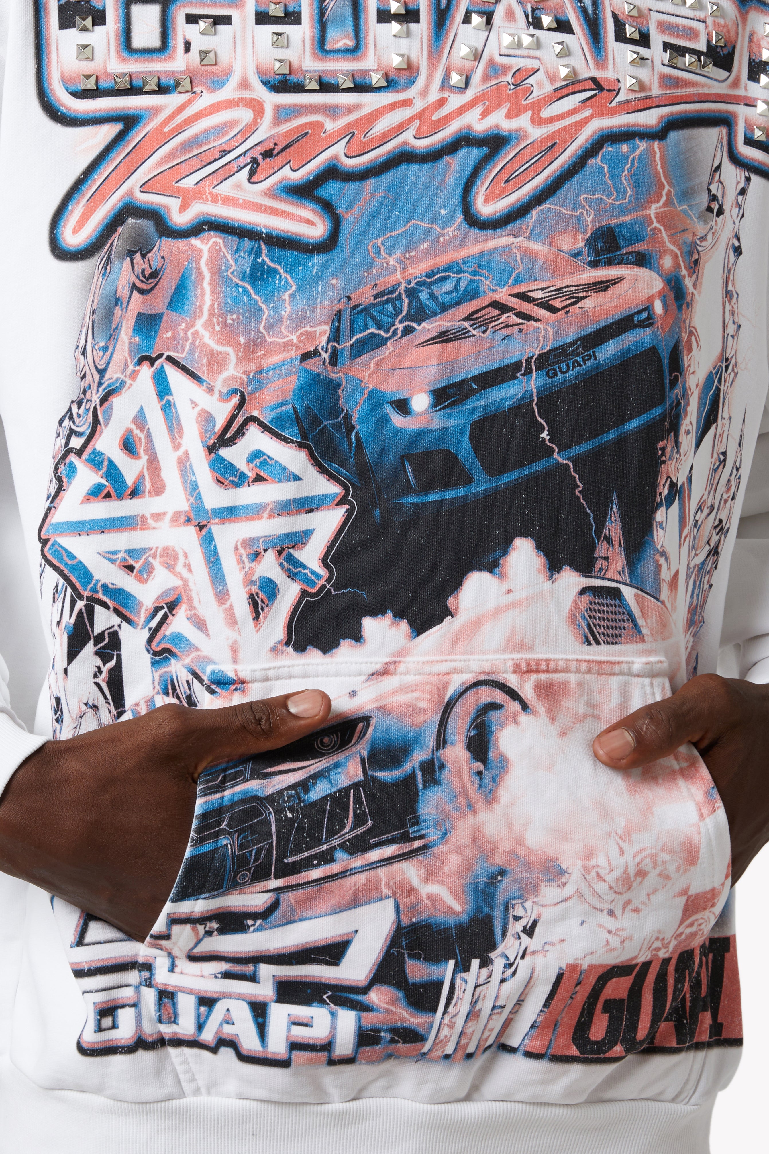 The design features dynamic layers of red, white, and electric blue, combining retro race aesthetics with futuristic graphic storytelling. Embellished with chrome-finished pyramid studs on the "GUAPI Racing" chest logo, this hoodie captures the rebellious spirit of streetwear with bold, raceway-ready visuals.