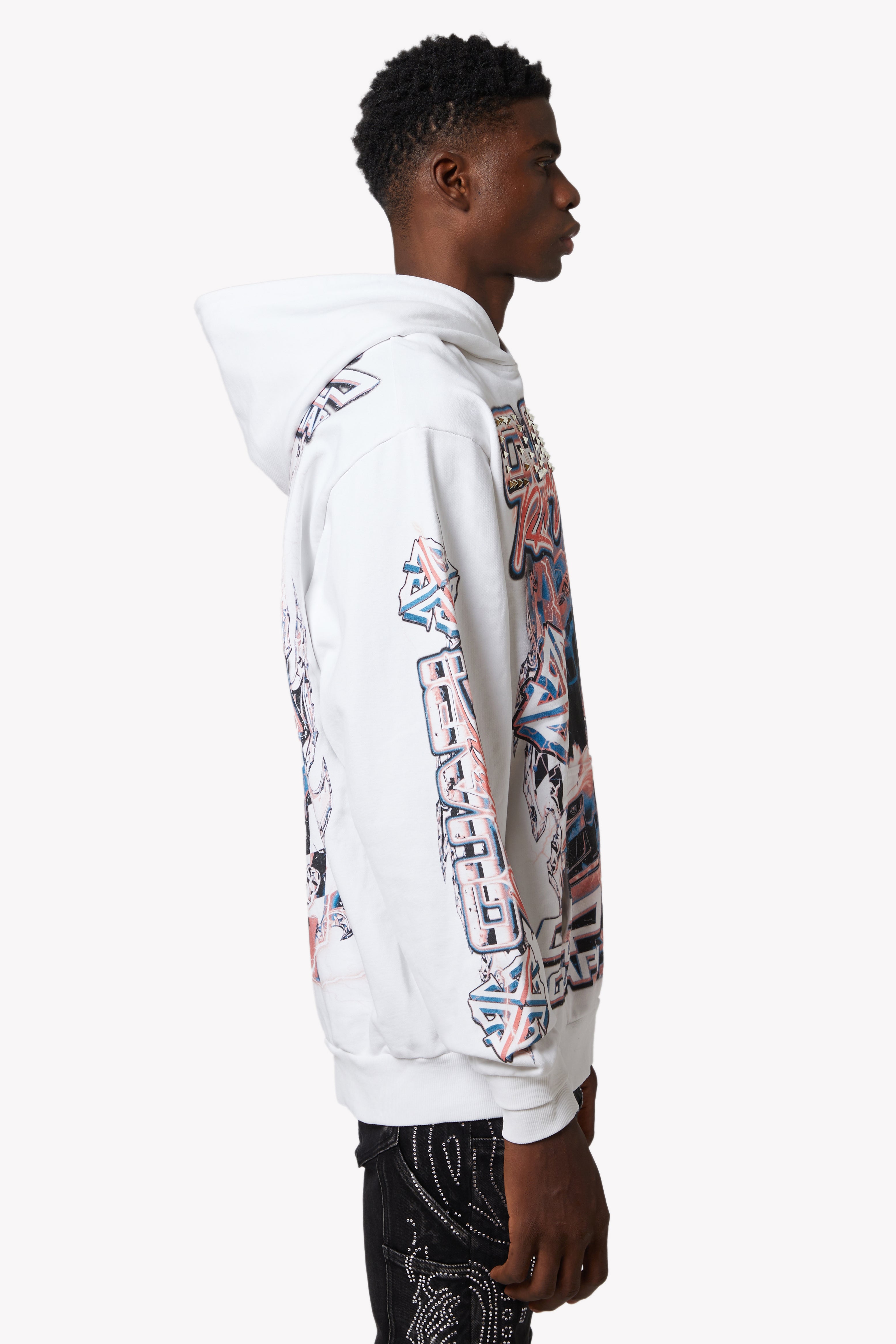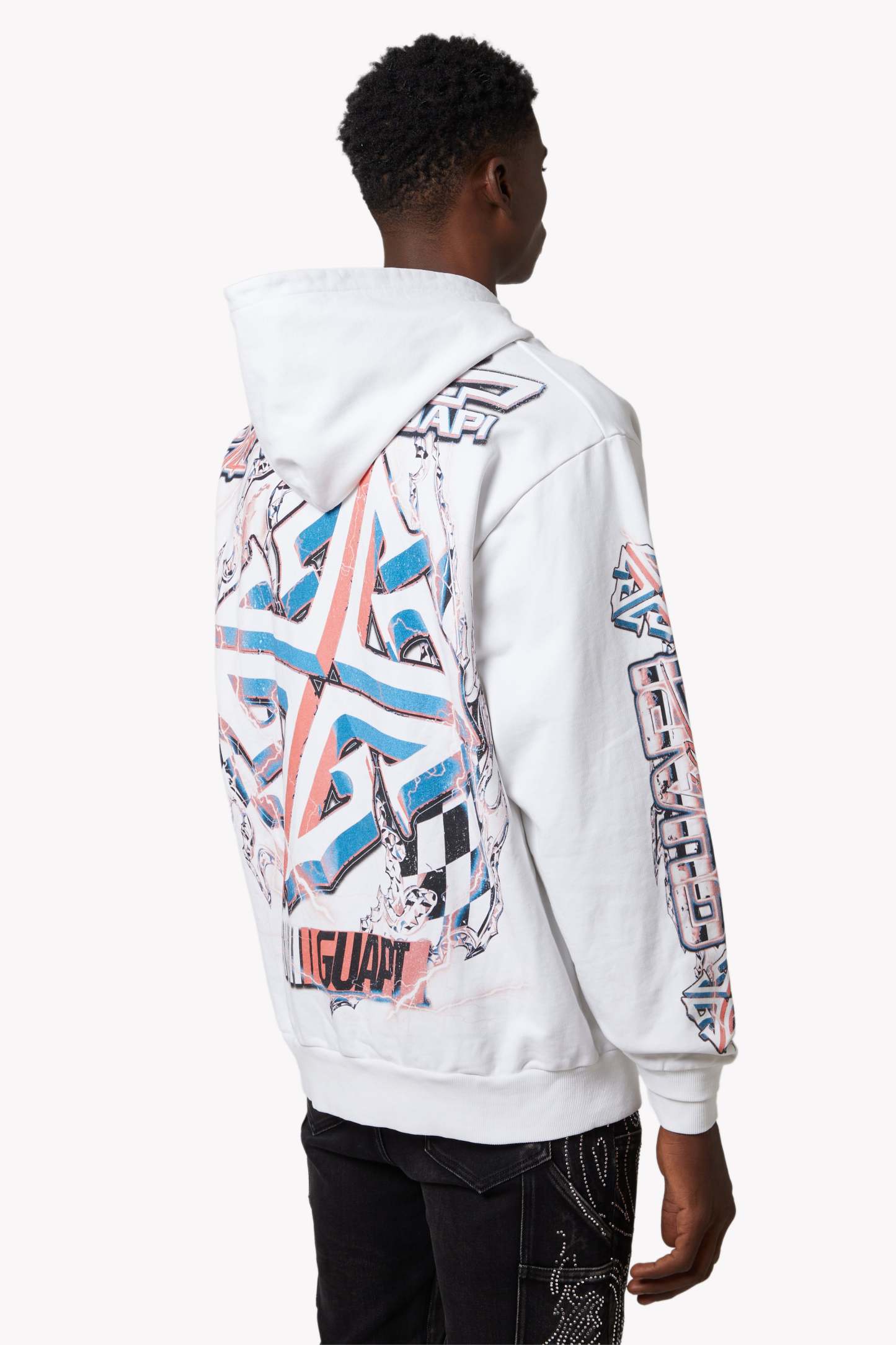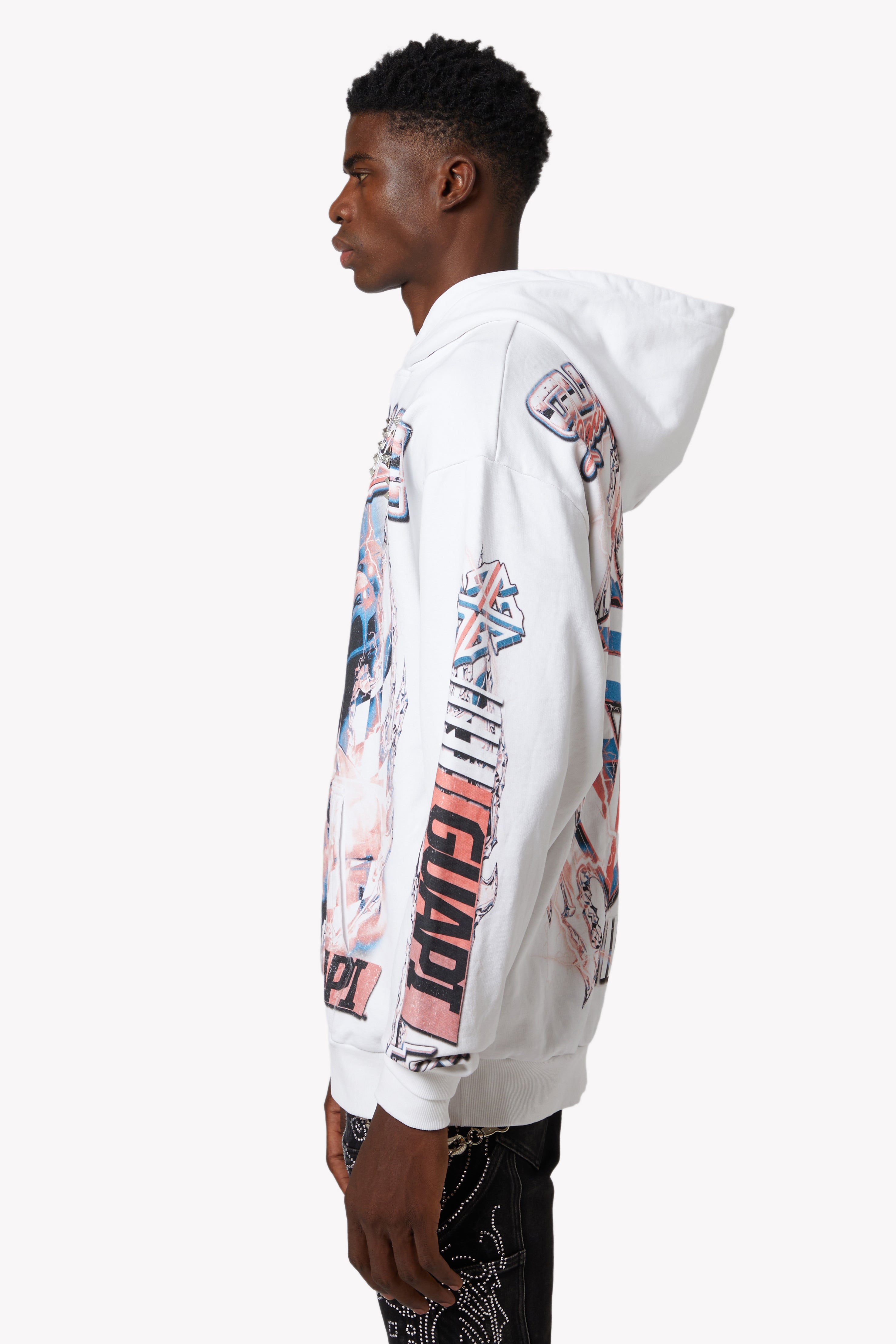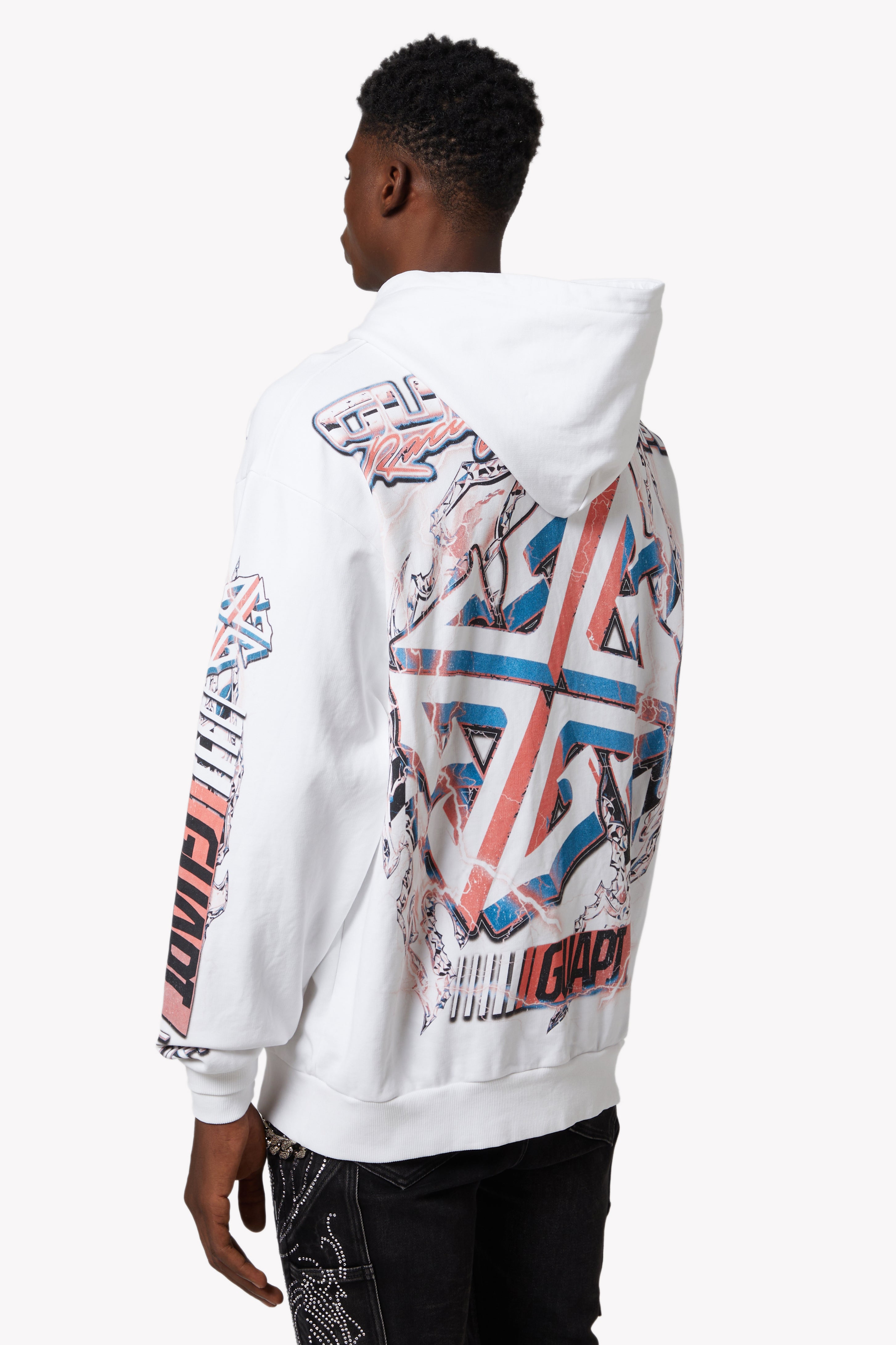 The design features dynamic layers of red, white, and electric blue, combining retro race aesthetics with futuristic graphic storytelling. Embellished with chrome-finished pyramid studs on the "GUAPI Racing" chest logo, this hoodie captures the rebellious spirit of streetwear with bold, raceway-ready visuals.