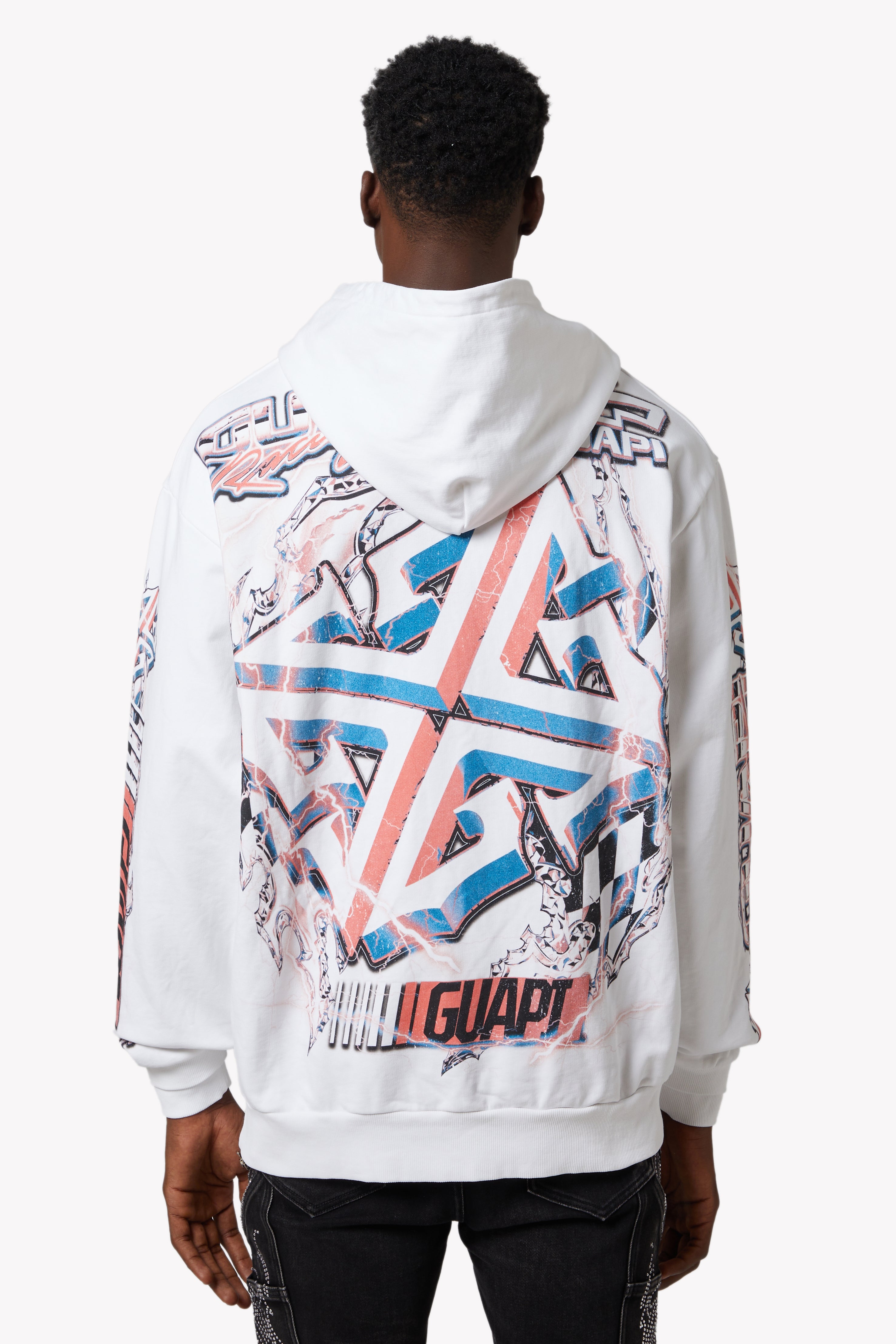 Both sleeves carry GUAPI Racing motifs and logos, amplifying the hoodie’s visual impact from all angles.Kangaroo Pocket: