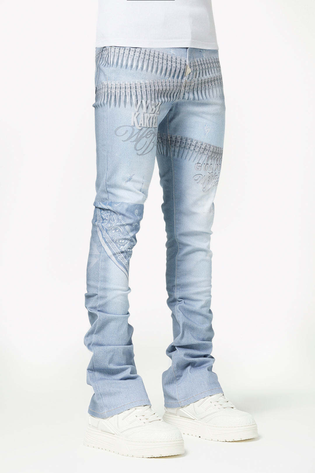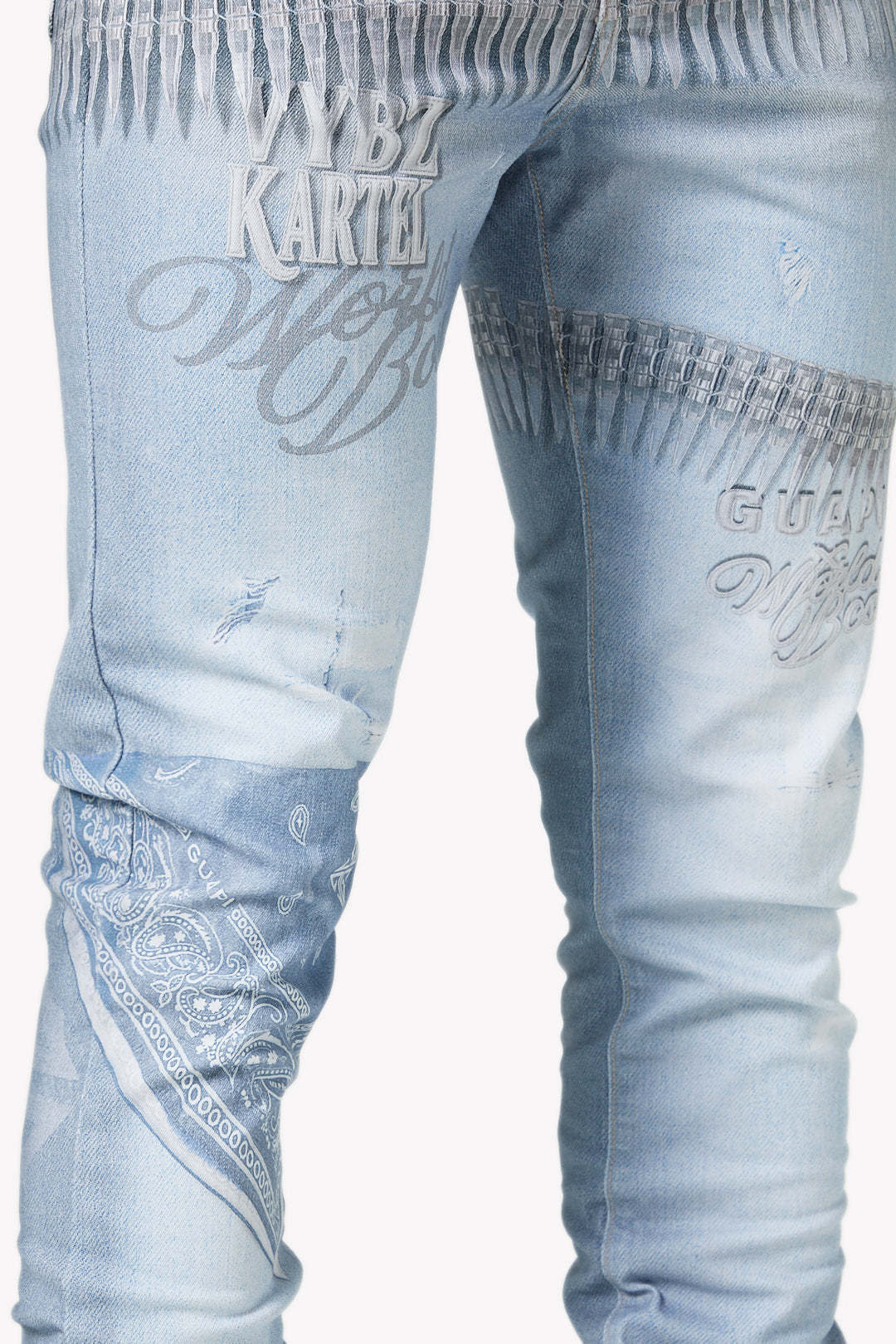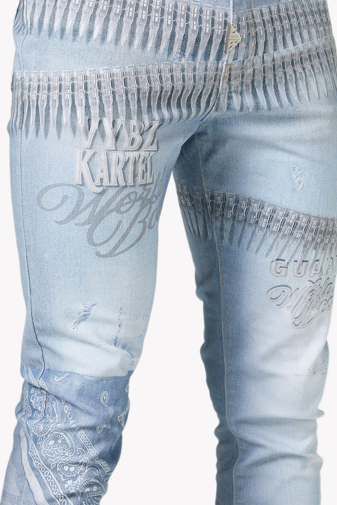- Design: Light stone wash with printed "ammo" band graphics around the waist and thigh, tonal "Vybz Kartel / World Boss" script, and a bandana-style printed patch at the knee.