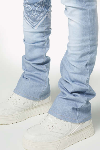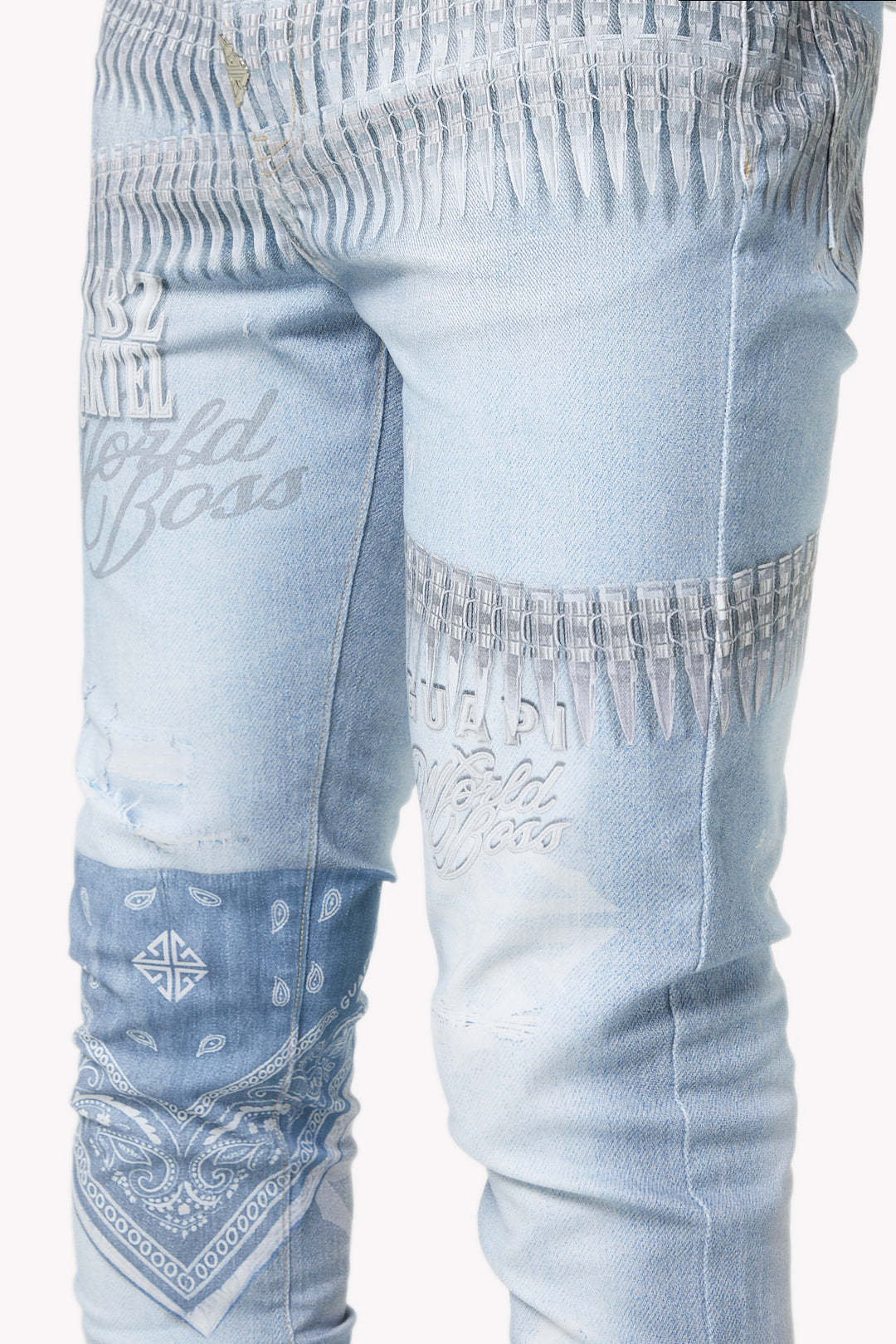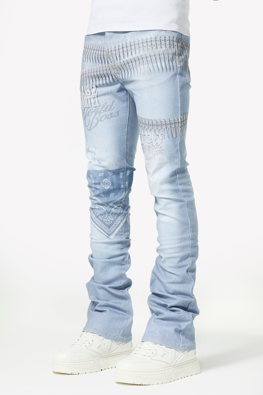 - Design: Light stone wash with printed "ammo" band graphics around the waist and thigh, tonal "Vybz Kartel / World Boss" script, and a bandana-style printed patch at the knee.